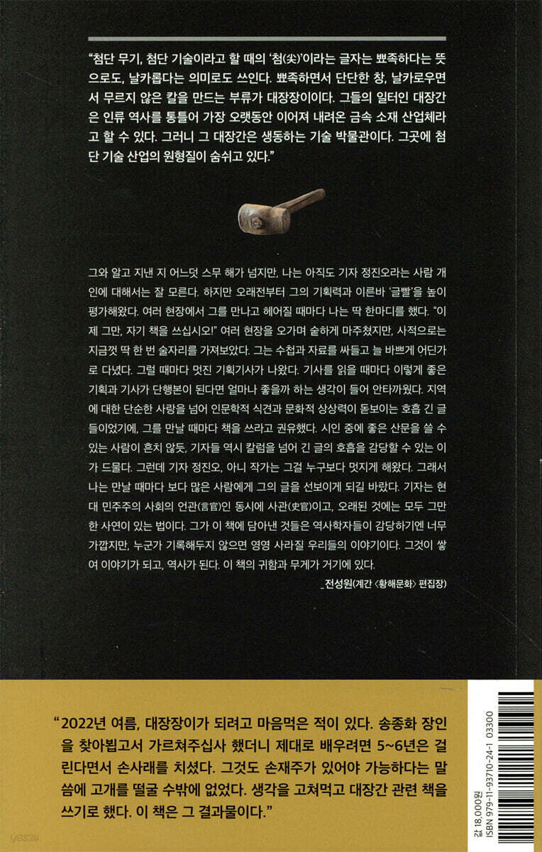 그러면 쇠를 잘 때려서 풀어낸다는 말은 무엇을 이르는가. 달구어진 쇠를 망치로 두드려서 얇게 펴는 걸 잘해야 한다는 얘기다. 이게 바로 쇠를 불리는 공정이다. 적당한 온도로 달구어낼 줄 알아야 하고, 여기에 숙련된 망치질이 더해져야 한다. 송 장인의 망치질은 리듬을 탄다. 쇠를 두드리는 강약 조절에 리듬이 실려 있다. 망치가 쇠에 닿는 순간 밖으로 밀기도 하고, 안으로 당기기도 한다. 망치를 쥔 손에 힘을 주기도 하고, 망치의 무게보다도 더 가볍게 내리치기도 한다. (…) 송 장인의 망치질은 마치 악기 연주처럼 흥겹게 들리기도 한다.