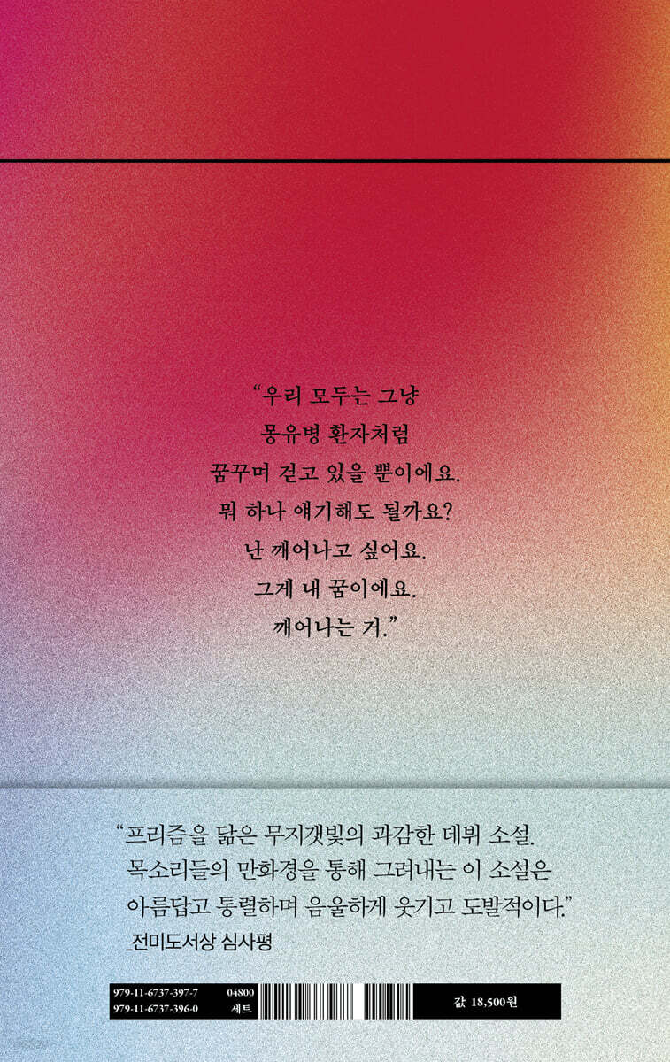 프리즘을 닮은 무지갯빛의 과감한 데뷔 소설로, 침체된 미국 중서부의 아파트에 사는 거주민들의 일상을 다룬다. 무더운 여름 한 주 동안 일어나는 일들을 다양한 목소리들의 만화경을 통해 그려내는 이 소설은 아름답고 통렬하며 음울하게 웃기고 도발적이다. 이 이야기는 미국 사회의 모습과, 외로움, 갈망 그리고 자유를 향한 고통스러운 추구 때문에 우리가 분투하는 여러 방식들을 포착한 스냅사진이다. - 전미도서상 심사평