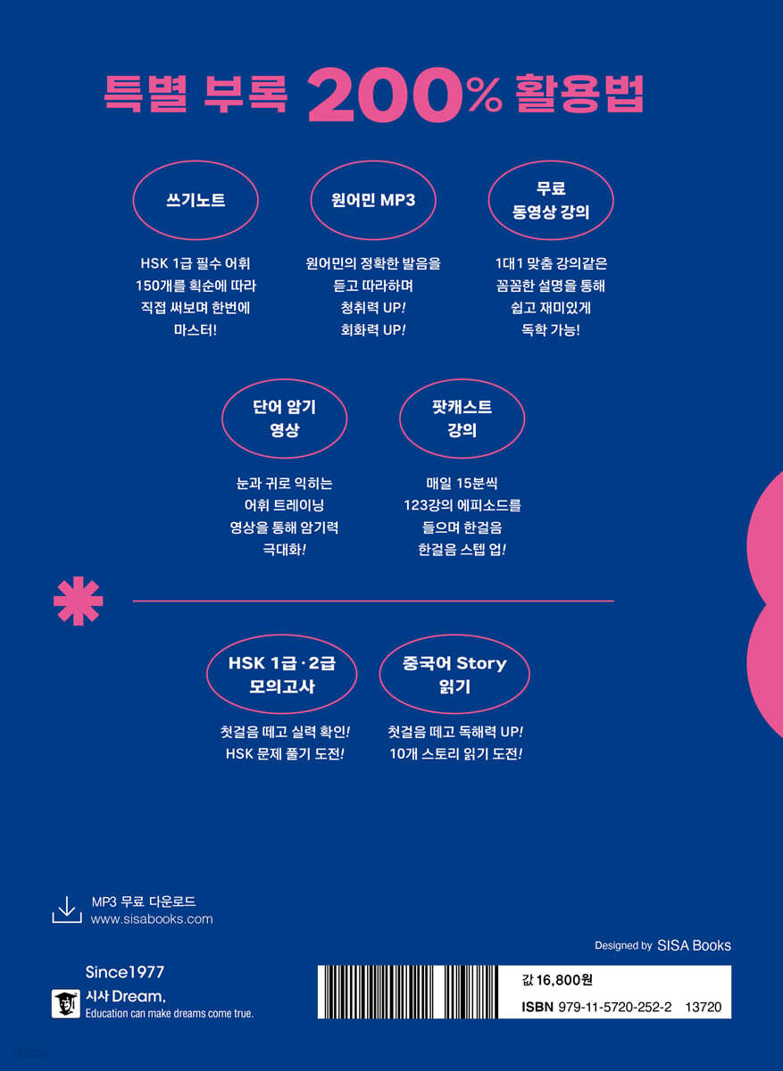 〈착! 붙는 중국어 독학 첫걸음〉으로 발음부터 초급 HSK까지 체계적으로 기초 단계를 탄탄하게 다질 수 있습니다. ★ 〈착! 붙는 중국어 독학 첫걸음〉 학습 자료 200% 활용 학습법 1. 〈착! 붙는 중국어 독학 첫걸음〉 (본책) - 무료 동영상 강의 영상으로 빈틈없이 알차게 학습해 보세요. - 선생님과 학생의 실제 수업 내용을 담은 유쾌한 팟캐스트 강의로 부담없이 학습해 보세요. - 원어민 음성을 반복하여 듣고 소리내어 따라 읽어보세요. - 유튜브 단어 암기 영상으로 본문 학습 단어를 완벽하게 암기해 보세요. 2. 손으로 익히는 HSK 1급 필수 어휘 〈간체자 쓰기 노트〉 - 중국어 한자를 직접 써 보면서 1급 어휘를 확실히 마스터해 보세요. 3. 첫걸음 떼고 JUMP UP! 〈챌린지 북〉 - HSK 1급·2급 문제에 도전으로 시험 유형 맛보기! QR코드를 스캔하여 듣기 지문과 상세 해설을 볼 수 있습니다. - 10개 에피소드를 통해 본책의 표현들을 복습하고, 보다 확장된 학습으로 독해력 높이기! QR코드를 스캔하여 원어민 음성을 들을 수 있습니다. |