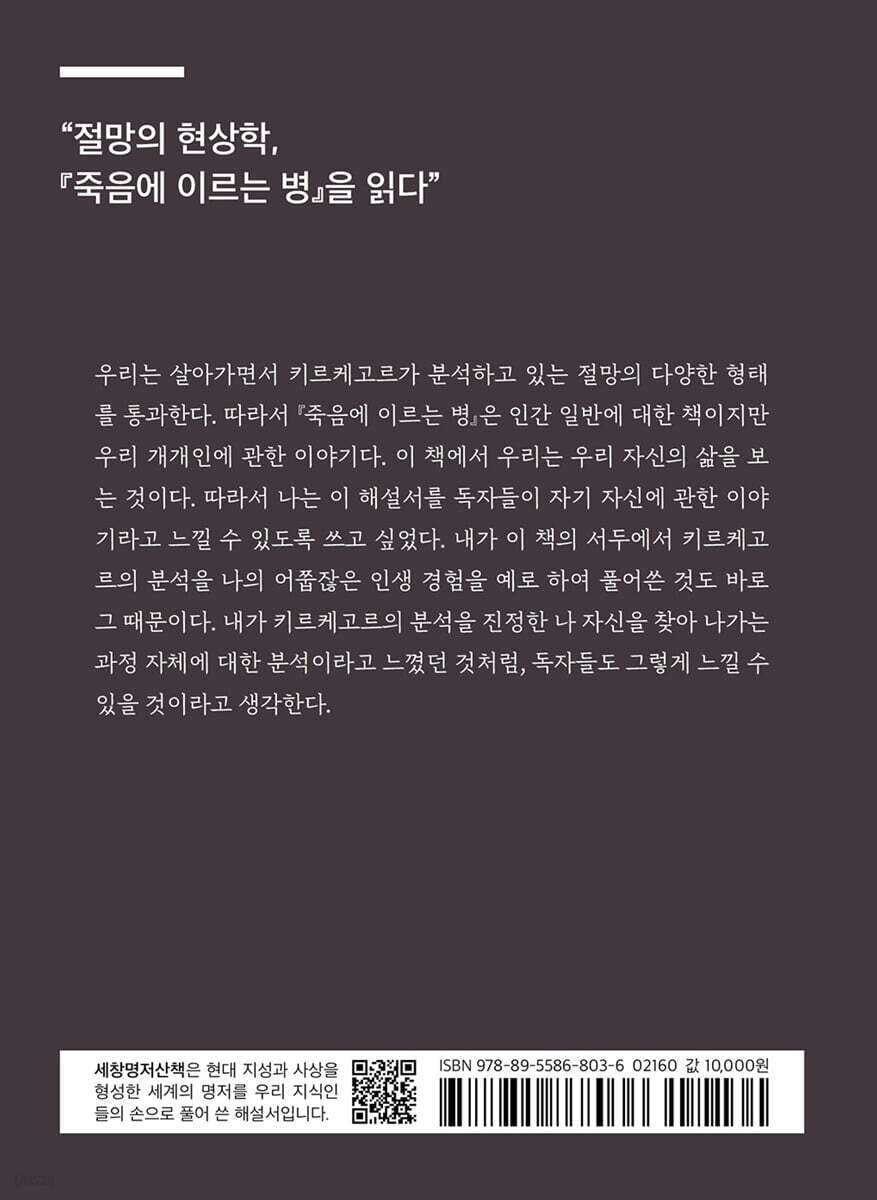 현대인들은 모두 죽어 가고 있다. 아니, 고금을 통틀어 인간이라면 모두 죽어 갔으며, 죽어 가고 있고, 죽어 갈 것이라 해도 괜찮을 것이다. 그들이 죽어 갔고 죽어 가고 죽어 갈 것인 이유는 그들이 모두 죽음에 이르는 병에 걸렸기 때문이다. 그러나 여기서 죽음은 일반적인 의미에서의 죽음을 말하는 것이 아니다. 여기서 인간이 죽어 갔고 죽어 가고 죽어 갈 것이라는 논지는 “인간은 죽는다”라는 자연적 사실을 말하는 것이 아니며, 육체적 죽음을 의미하는 것도 아니다. 여기서 죽음이란 정신의 죽음을 일컫는다. 그렇기에 죽음에 이르는 병 역시도 암이나 폐병 같은 종류의 육체적 병이 아니라 정신적 병을 이른다. 따라서 우리는 이 병에 대한 진단이나 치료를 의사에게 맡길 수 없다. 이 병에 대한 진단과 치료는 오직 철학자, 그것도 키르케고르와 같이 위대한 철학자에 의해서만 가능할 뿐이다. 이제, 위대한 철학자 키르케고르의 냉철한 성찰을 통해서 그 병을 진단해 보자. 죽음에 이르는 병이란 바로 절망이다. 그런데 키르케고르에 따르면, 우리 인간은 대부분 자신이 절망하고 있다는 사실조차 알지 못하고 있다. 그러나 우리는 언제까지고 자신이 병에 걸렸다는 사실을 알지 못한 채 죽어 갈 수는 없다. 병에 걸렸다는 사실을 알게 되었다면, 그 병을 치료해야만 한다. 그러니 키르케고르와 함께 이 ‘죽음에 이르는 병’을 한 번 치료해 보자. 주지하듯이 병을 치료하기 위해서는 먼저 병을 진단해야만 한다. 그리고 병을 진단한다는 것은 곧 그가 어떤 병을 앓고 있는지를 판별한다는 것이다. 그래서 키르케고르는 먼저 인간이 앓고 있는 죽음에 이르는 병을 그 형태에 따라 나누어 “본래적인 절망”과 “비본래적인 절망”, “남성적 절망”과 “여성적 절망” 등으로 진단하고 있다. 이 분류를 통해서 우리는 우리가 앓고 있는 절망의 종류를 파악할 수 있을 것이다. 그러면 다음 차례는 그 병을 치료하는 것이다. 명의 키르케고르의 처방전, 『죽음에 이르는 병』 키르케고르의 『죽음에 이르는 병』은 절망이라는 병에 대한 진단서이자 처방전이다. 무릇 병의 원인을 진단하고 나면 그 치료법도 차차 발견하기 마련이다. 그래서 절망이라는 원인과 종류를 진단한 키르케고르는 그에 대한 치료법 역시 처방하고 있다. 그 치료법이란 바로 무한성과 유한성을 종합하는 것이며, 이를 통해 우리는 절망을 극복하고 비로소 진정한 자기가 될 수 있다. 그런데 무한성과 유한성은 서로 대립하는 것이기에 이 둘의 종합은 역설적인 종합이며, 인간 자신만의 힘으로는 성취할 수 없다. 그렇다면 우리는 절망을 결코 극복할 수 없는 것일까? 그렇지 않다. 절망은 난치병이기는 하지만, 불치병은 결코 아니기 때문이다. 키르케고르에 따르면 무한성과 유한성을 종합할 수 있는 길이 단 하나 있다. 그것은 바로 신에 대한 신앙이다. 신은 전지전능한 존재이기 때문에 무한성과 유한성의 종합이라는 역설적 종합 역시 이루어 낼 수 있다. 그리고 인간은 신에게 진정으로 귀의하여 참회하며 신 앞에서 자신을 내려놓음으로써 신의 은총을 얻을 수 있다. 이러한 참회와 신의 은총을 통해서 인간은 자신의 유한성 내에서 무한성을 실현할 수 있는 것이다. 이렇게 유한성 내에 무한성을 실현하면서 인간은 바야흐로 유한성과 무한성을 종합하게 된다. 아마 이러한 키르케고르의 논지는 자못 지나치게 그리스도교적인 교설로 여겨질 수 있을 것이다. 그러나 이 책의 저자에 의하면 『죽음에 이르는 병』은 단지 그리스도교인만을 위한 책이 아니다. 『죽음에 이르는 병』은 “인간이 어떤 존재이고 인생을 어떻게 살아야 하는지를 진지하게 고민해 보려는 사람은 한 번쯤은 꼭 읽어야 할 책”이다. 그러나 『죽음에 이르는 병』은 그 중요성에도 불구하고, 책 자체가 난해하여 혼자서는 읽기가 쉽지 않다. 그렇기에 그 책을 읽기 위해서는 “친절한 안내서”가 필요하다. 이 책은 그러한 『죽음에 이르는 병』을 읽어 가기 위한 좋은 길라잡이가 되어 줄 것이다. |