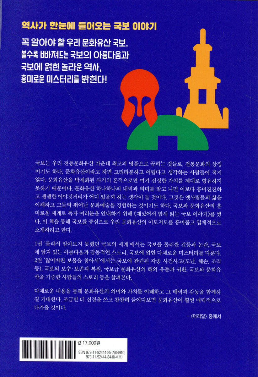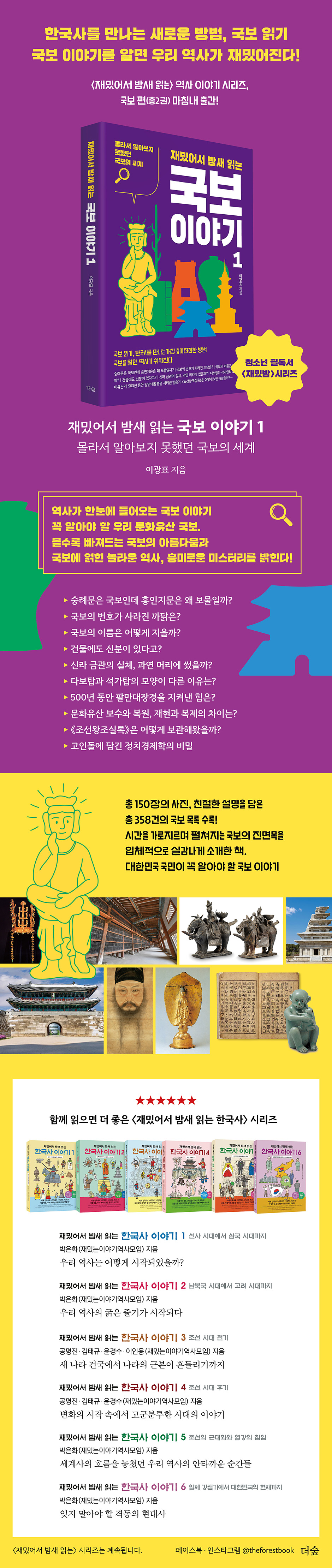 1권과 2권 모두에서 총 150장의 문화유산 및 관련 사진을 담아 독자들이 국보 이야기를 더욱 입체적이고 실감나게 이해할 수 있도록 구성했다. 2권 말미에는 이 책에 소개된 국보를 포함해 국가유산청에 등재된 총 358건의 국보 목록을 실어 독자들이 국보에 대한 구체적인 정보를 확인할 수 있도록 했다. 시간을 가로지르며 펼쳐지는 재미있는 국보 이야기와 지식은 역사를 사랑하는 이들의 지적 호기심과 흥미를 한껏 자극할 것이다.