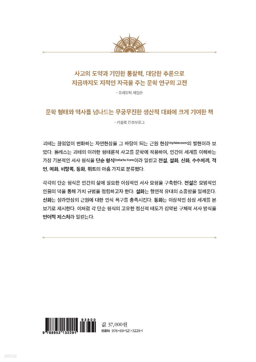 서론 1. 문학 이론의 세 가지 방향: 아름다움, 의미, 형태 2. 언어와 문학 3. 언어의 작용: 생산, 창조, 해석 4. 문학 형식들 전설 1. 『성인전』의 성도들 2. 시성(諡聖) 과정 3. 적극적인 덕 4. 전설의 정신적 지향: 모방 5. 성인전과 역사적 전기 6. 전설의 언어적 제스처 7. 사례의 확장: 성(聖) 게오르크 8. 전설의 반대 형식 9. 핀다로스의 승전가 10. 우리 시대의 전설 설화 1. 용어에 대한 오해 2. 아이슬란드 설화 3. 설화의 정신적 지향: 가족과 친족 4. 서사시 속의 설화적 요소 5. 『니벨룽겐의 노래』 6. 구약 성경의 설화와 등장인물 신화 1. 신화의 정의 2. 창세기 신화 3. 고대 그리스의 ‘미토스’ 4. 핀다로스의 에트나 화산 신화: 신화와 로고스 5. 파생 형식: 플라톤의 신화 6. 신화 속의 ‘사건’: 언어적 제스처의 특성 7. 빌헬름 텔: 구원 신화 8. 묵시론적 신화: 상징 수수께끼 1. 연구 방법의 문제 2. 신화와 수수께끼 3. 수수께끼의 유형: 스핑크스 수수께끼 4. 수수께끼의 목적 5. 무엇이 수수께끼가 되는가? 6. 수수께끼는 어떻게 만들어지는가? 7. 수수께끼의 특수 언어와 형식 8. 수수께끼의 쇠퇴 격언 1. 개념 정의 2. 격언의 정신적 지향 3. 격언과 경험 4. 격언의 언어와 문체적 수단 예화 1. 단순 형식의 체계와 주변 형식 2. 예화의 사례와 정신적 지향 3. 문학 형식으로의 이행: 노벨레 4. 보충 사례: 법 정신과 법조문의 괴리 5. 고대 인도의 예화 6. 예화의 확장 비망록 1. 사례: 신문 기사 2. 역사적 사건의 기록 3. 비망록의 특징과 유래 4. 비망록의 정신적 지향: 사실성과 구체성 5. 비망록과 역사 서술 동화 1. 그림 형제의 동화집 2. 낭만주의의 동화 개념: 자연시와 예술시 3. 토스카나 노벨레와 동화 4. 노벨레와 동화 5. 단순 형식과 예술 형식 6. 동화의 정신적 지향 위트 1. 위트의 정신적 지향 2. 우스꽝스러움 3. 풍자와 아이러니 4. 위트의 이중적 기능 전망 찾아보기 |