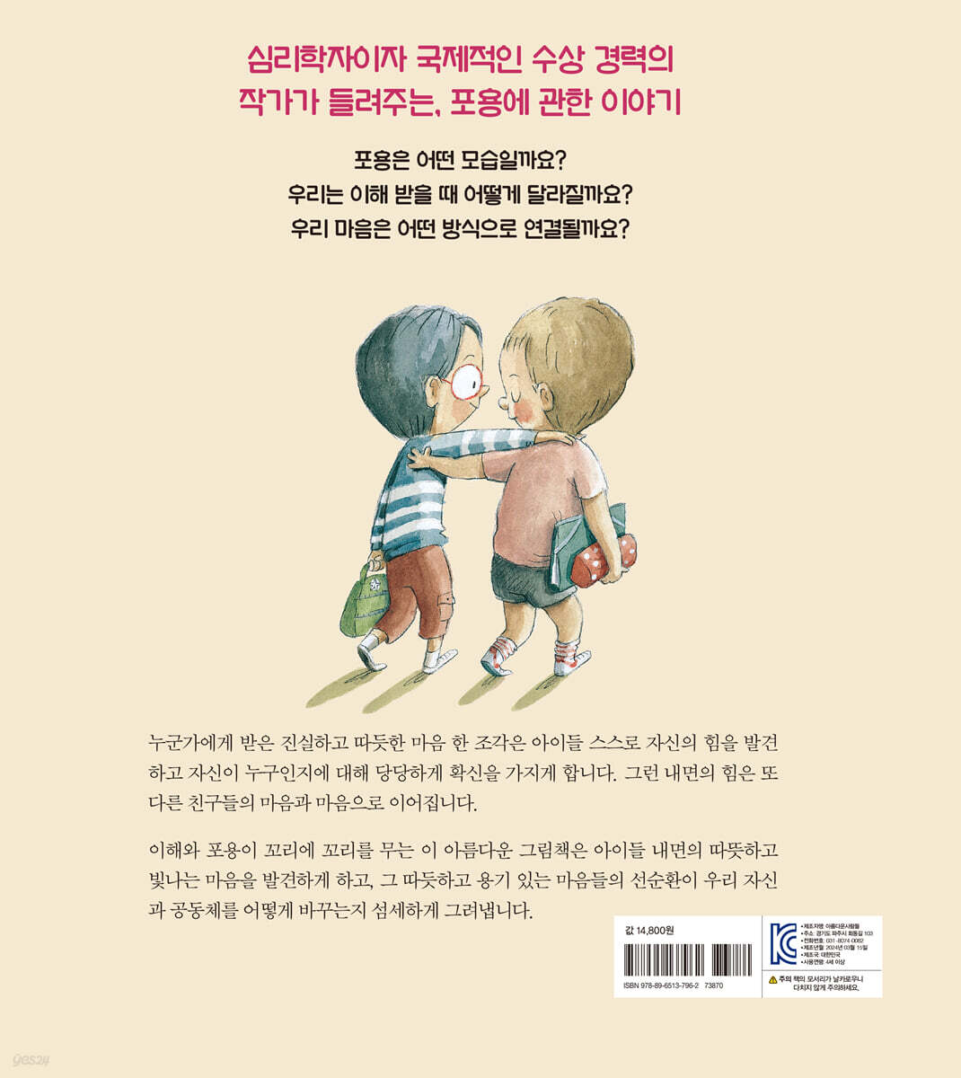 타인의 입장이 되어보는 것이 무엇을 의미하는지 이해하게 됩니다. 이 책은 다른 사람의 입장이 되어 보는 것의 중요성에 대한 따뜻한 이야기들이 담겨있습니다. 서로 다른 감정과 개성, 태도를 지닌 사랑스런 아이들이 일상에서 부딪히는 오해와 갈등, 상처를 어떻게 서로에 대한 배움과 연결의 기회로 만들어 갈 수 있는지 보여줍니다. 서로가 기꺼이 마음을 여는데 필요한 이해와 포용의 구체적이고 실천적 모습을 상황별로 보여줌으로써 아이들 내면의 선한 마음들이 일상의 태도로 표현될 수 있도록 안내합니다. 우리 마음은 어떤 방식으로 연결될까요? 배제가 아닌 포용, 마음과 마음을 연결하는 따뜻한 용기 때로는 다른 사람을 이해하는 것이 어려울 때가 있습니다. 그렇기 때문에 서로의 다름을 포용하는 대화가 필요합니다. 이해하고 이해받는 것이 우리를 연결해주기 때문입니다. 그럴 때 우리는 나와 세상을 위해 무언가를 할 수 있습니다. 이 책속의 아이들은 서로 함께 놀며 웃고 울고 장난치고 돕고 위로 하며 자신의 감정을 이해하고 다른 사람을 이해해 갑니다. 배제가 아닌 포용은 자신이 얼마나 따뜻하고 현명하며 용감하고 열린 마음을 가지고 있는지 자신의 가치를 깨닫고 믿게 합니다. 이 단단한 내면의 힘은 다른 사람들과 진정으로 연결되는 모든 감정을 소중하게 여기고 편견과 혐오, 두려움에 맞서 포용과 사랑, 용기를 실천하게 합니다. 친절한 마음 한 조각이 꼬리에 꼬리를 물고 우리 모두를 연결하는 이 사랑스런 그림책은 아이들에게 세상을 바라보는 따뜻한 시선을 갖게 하고 우리 삶의 진정한 아름다움을 느끼게 해줍니다. |