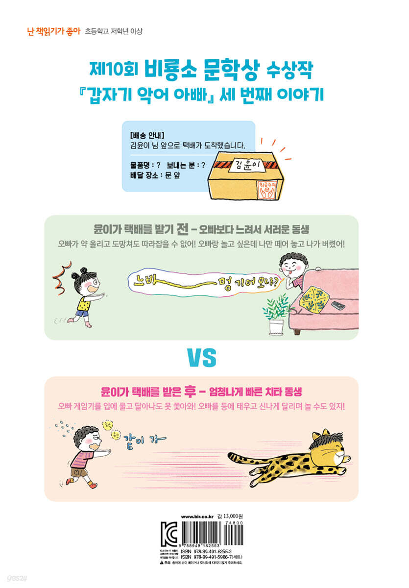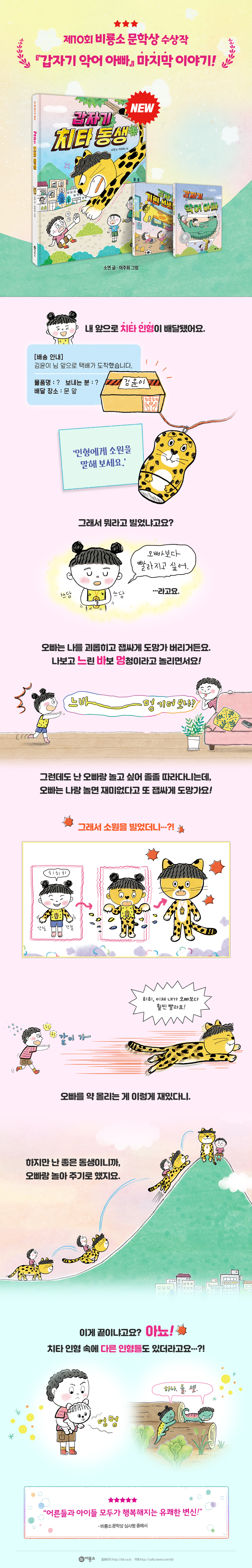 한 살 터울 남매 윤찬이와 윤이. 둘은 한때 정다운 남매였다. 아주 어릴 땐 아마도 서로가 유일한 친구였을 것이다. 동생 윤이와 잘 놀아 주던 오빠였지만, 윤찬이는 이제 친구와 노는 게 훨씬 즐겁다. 자꾸 따라붙는 동생은 귀찮으면서도, 괜히 자꾸만 놀리고 싶다. 약이 올라 씩씩대며 쫓아오는 동생에게 ‘느바멍(느린 바보 멍청이)’라는 별명도 지어 줬다. 윤이는 그런 오빠가 미우면서도 여전히 같이 놀고 싶고, 오빠 가는 곳에는 다 따라가고 싶다. “왜? 내 생일이니까 같이 놀자! 응?” “너랑 노는 건 재미없어!” 오빠는 현관문을 열고 후다닥 나가 버렸어요. 예전에는 오빠가 잘 놀아 줬어요. 도화지로 보드게임도 만들어 줬고요. 같이 편 먹고 게임도 자주 했어요. 그런데 언제부터인가 친구와만 놀고 나와 놀아 주지 않아요. 그래서 속상해요. 나는 오빠를 따라 나왔어요. 멀리서 놀이터 쪽으로 달려가는 오빠가 보였어요. 이번에는 꼭 따라잡을 거예요. 머리카락이 바람에 날리도록 뛰었어요. 골목 끝까지 쫓아갔지만, 오빠는 어디에도 보이지 않았어요. 갑자기 사라져 버린 거예요. _본문에서 그런 윤이 앞에 웬 택배가 도착한다. 치타 인형이다. ‘인형에게 소원을 말해 보세요’라고 적힌 쪽지와 함께. 달그락달그락 소리가 나는 것이, 러시아 인형 마트료시카처럼 안에 여러 개의 다른 인형이 더 들어 있나 보다. 집에 돌아온 오빠는 인형을 만져 보겠다며 쫓아오고, 윤이는 달아나며 인형을 안고 소원을 빈다. “오빠보다 빨라지고 싶어!” 장난치려고 다가오는 오빠에게서 도망치고도 싶고, 또 자기를 따돌리고 놀러 나가 버리는 오빠를 놓치지 않고 따라잡고 싶은 마음도 담겼을 것이다. 소원은 즉시 이루어져 윤이는 치타가 되고, 오빠를 향해 으르렁대며 입을 쩍 벌린다. 입장이 바뀌었다. 이제 윤이가 오빠를 실컷 놀릴 차례다! 겁에 질린 오빠의 모습을 보니까 실실 웃음이 나왔어요. 나를 그렇게 놀리더니 쌤통이지 뭐예요. 이번에는 다리를 이리저리 움직여 봤더니 다리에 힘이 들어갔어요. 당장이라도 달리고 싶어서 몸이 근질근질했어요. 먼저 오빠 방으로 가서 게임기를 입으로 물었어요. 오빠가 가장 아끼는 거예요. “내놔!” 오빠가 소리쳤어요. 나는 이때다 싶어서 앞발로 현관문을 열고 밖으로 나왔어요. 몸이 가벼워서 하늘도 날 수 있을 것 같았어요. 오빠가 나를 부르며 쫓아왔지만 따라잡을 수 없었어요. 오빠는 거북이보다 느렸거든요. 히히. _본문에서 하지만 놀리는 재미도 잠시, 뼛속까지 오빠바라기인 윤이는 오빠를 괴롭히는 친구들을 겁주어 쫓아 주고, 오빠와 신나게 놀아 보기로 한다. “같이 놀자. 응?” 오빠가 간절한 눈빛으로 말했어요. 마음이 조금 흔들렸어요. 생각해 보니 함께 노는 것도 재미있을 것 같았어요. 고민하다가 오빠에게 가서 몸을 낮췄어요. 오빠는 내 뒷다리를 붙잡더니 기어올라서 등에 탔어요. “말랑말랑 푹신한데?” 오빠가 몸을 손가락으로 콕 눌렀어요. 손가락이 쑤욱 들어갔다 나왔죠. _본문에서 ‘말랑말랑 푹신한’ 감촉은 ‘갑자기 시리즈’ 속 변신 동물들의 공통적인 특징이다. 아빠가 악어로 변했을 때도, 아빠라는 확신이 있기에 아이들은 무서워하지 않았다. 악어의 딱딱한 피부와 다르게 손가락으로 콕 누르면 쏙 들어갔다 나오는 악어 아빠의 피부는 아이들을 안심시켜 주고 편안하게 만들어 주었을 것이다. 그건 기린 선생님도 마찬가지였다. 아이들은 악어 아빠의 푹신한 등에서, 또 기린 선생님의 등과 목에서 편안히 기대어 쉬기도 하고 신나게 놀기도 했다. 치타로 변한 윤이도 말랑말랑 푹신했다. 이런 일을 한두 번 겪는 게 아닌 윤찬이와 윤이는 당황하고 겁먹을 필요가 없다. 신나게 놀면 된다는 걸 잘 아니까. ◆ 사라진 오빠를 찾는 방법 윤이는 오빠를 등에 태우고 신나게 달리며 모처럼 둘만의 즐거운 놀이 시간을 보낸다. 하지만 마냥 맘 놓고 놀 수만은 없다. 동네 한복판에 치타가 나타났다는 신고가 빗발치는데, 경찰이 출동하지 않을 리 없다. 마취총을 어깨에 멘 구조대원과 함께 말이다. 위기는 그것만이 아니다. 윤이가 다음으로 귀여운 강아지로 변신했을 때는 엄마의 개털 알레르기로 인한 폭풍 재채기와 강아지 데리고 당장 나가라는 엄마의 호령이 이어진다. 하지만 무엇보다도 가장 큰 위기는 몰래 카멜레온으로 변신한 윤찬이가 집 앞 화단에서 사라져 버린 일이다. 윤이는 오빠를 영영 찾지 못할까 봐 겁에 질리지만, 이내 아주 적절한 방법이 떠오른다. 간절한 마음으로 카멜레온 인형을 쓰다듬었어요. “오빠를 찾고 싶어.” 카멜레온 인형 눈빛이 보라색으로 반짝 빛났어요. 또다시 온몸이 가렵기 시작했어요. “히히히. 히히히.” 먼저 엉덩이를 긁었더니 긴 꼬리가 튀어나왔어요. 몸과 얼굴을 긁자 서서히 카멜레온이 되었어요. “오빠!” 나는 카멜레온이 되자마자 소리쳤어요. “윤이야, 나 여기 있어.” 카멜레온으로 변했더니 오빠 목소리가 들렸어요. _본문에서 카멜레온의 모습으로 상봉한 남매. 지금까지는 변신 동물과 아이들이 함께 노는 장면들이 연출됐다면, 이번엔 모두가 변신하여 카멜레온의 모습일 때만 할 