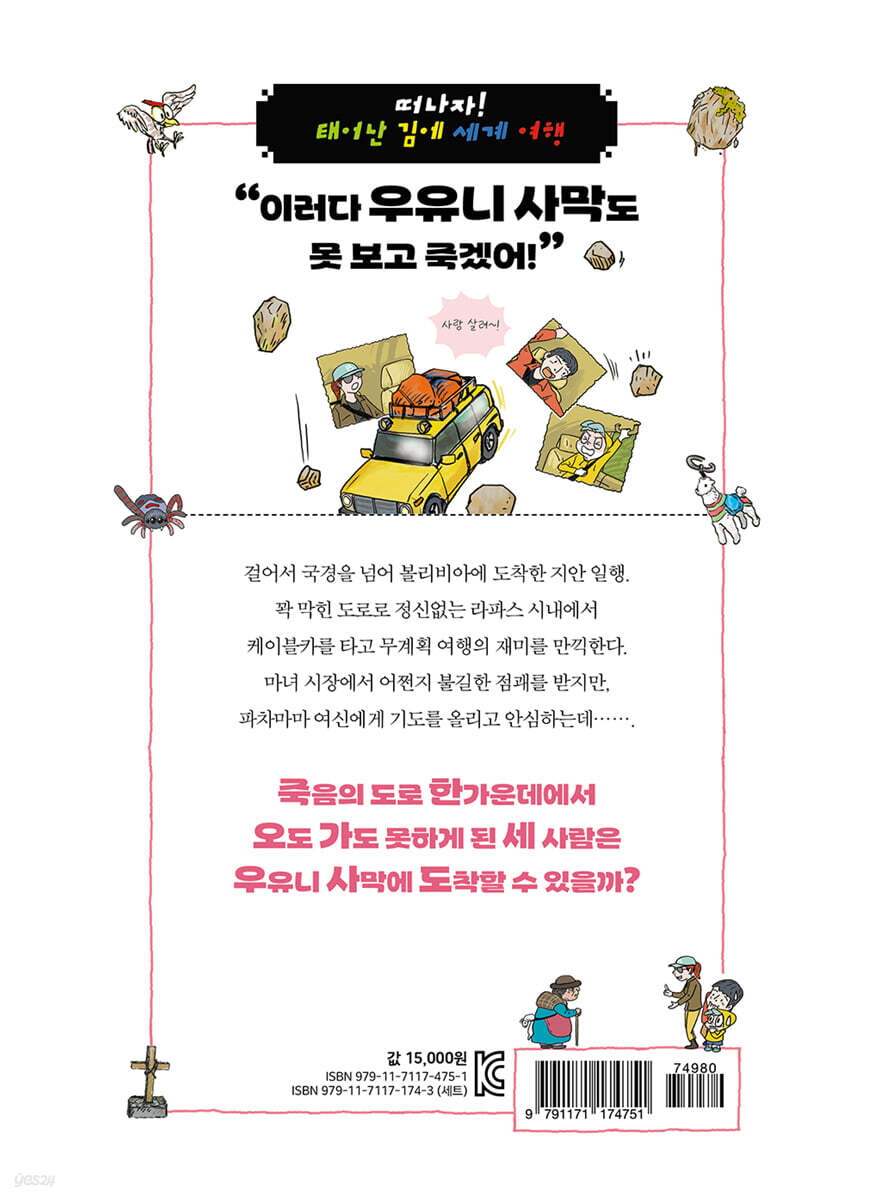 사람 냄새 나는 여정을 통해 볼리비아 문화를 만끽하고, 뜻밖의 여정이 선사하는 여행의 즐거움을 느끼자! MBC ‘태어난 김에 세계일주’가 시청자들의 사랑을 받은 것은 여행지에 살고 있는 현지 사람들의 문화에 흠뻑 젖어 보는 문화인류학적 순간들 때문이다. 이 여행은 꼭 가야 할 곳과 꼭 먹어야 할 것을 중심으로 이어지지 않는다. 계획도 없이 고생스러워 보이는 여행의 매력은 그곳에 사는 사람들과 그 사람들의 생활을 직접 함께하면서 다른 세계의 사람들을 알아가는 데에 있다. 이런 여정을 담은 동화 ‘태어난 김에 세계 일주’ 시리즈는 아이들이 세계의 문화와 세계의 사람들을 이해하는 과정에 도움이 된다. 정보를 담은 문장들에서는 알 수 없는, 현재를 사는 사람들의 생생한 이야기를 통해 우리와 다른 사람들의 삶을 제대로 이해하는 기회가 될 것이다. 시리즈 두 번째 권에서는 페루에 이어 볼리비아에 도착한 지안 일행이 무계획 여행의 즐거움을 만끽하고 위기를 헤쳐 나가며 환상적인 우유니 사막에 도착하는 여정을 그린다. 티격태격 무계획 여행의 자유로움과 뜻밖의 위기가 선사하는 유쾌한 만남! 수상한 스케치북에서 흘러나온 무지개 회오리에 휘말려 당황한 것도 잠시, 지안과 우주는 버들과 함께 페루에 이어 볼리비아 여행을 즐기기 시작한다. 꽉 막힌 도로로 정신 하나 없는 라파스 시내에서 무계획 여행의 묘미를 십분 발휘하며 자유롭게 볼리비아를 누비는 세 사람. 마녀 시장에서 어쩐지 불길한 점괘를 받지만, 파차마마 여신에게 기도를 올린 후 안심한다. 하지만 역시 여행에 위기가 찾아오고, 데스 로드에서 오도가도 못하는 신세가 되는데…. 우유니 사막으로 향하는 세 사람의 여정에는 예상하지 못한 일들이 벌어지지만, 그 덕에 이들은 새로운 친구를 사귀고 유쾌한 여행을 이어 나간다. 마녀 시장에서 점 보기, 닭 잡기 대소동, 소금 호텔의 침대 맛보기까지. 통통 튀는 여행기를 따라 가다 보면 읽는 이도 어느새 볼리비아에서 함께 여행하는 즐거움을 느낄 것이다. 이렇게 떠나기는 아쉽다! 볼리비아의 숨은 이야기까지 쏙쏙 이야기에 자연스럽게 녹아든 볼리비아의 문화와 지리적 특성, 특산물과 명소들을 그냥 지나치기 아쉬운 만큼 장마다 정보 페이지를 삽입했다. 지안과 우주가 주고받는 대화를 통해 마녀 시장과 볼리비아의 야생 동물 등 볼리비아만의 자연과 문화를 자세히 설명하고 있다. 더불어 다양한 시각 자료를 활용해 볼리비아의 지리적 특성과 분위기를 직관적으로 느낄 수 있게 구성하였다. 다음 여정도 기대하세요! 만화방에서 또 다시 무지갯빛 회오리에 휘말린 지안과 우주. 둘의 여행은 꿈이 아니었다! 그렇게 이번에는 인도에서 무계획 여행이 시작된다. 갠지스강에서 인도 사람들의 삶을 엿보고, 현지인의 결혼을 축하하며 여행을 흠뻑 즐기는 지안과 우주, 두 사람… 아니, 세 사람? 어쩐지 다시 세 사람이 된 지안 일행의 여행을 기대해 주세요! |