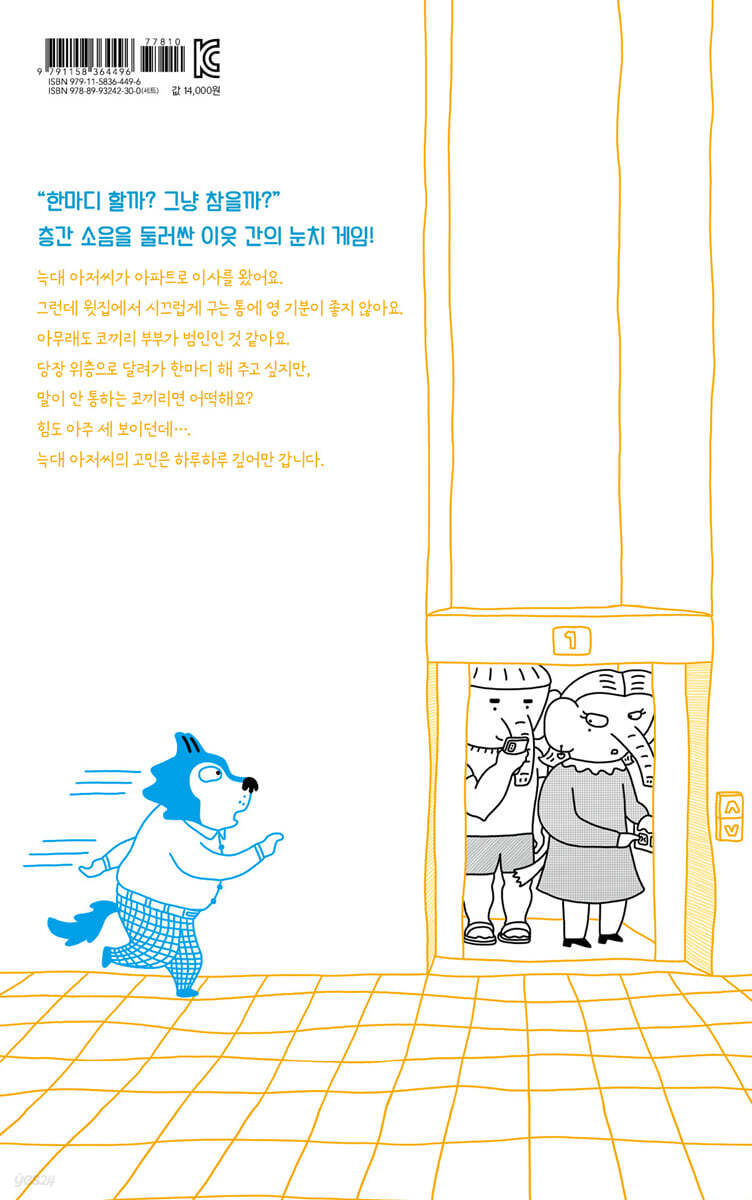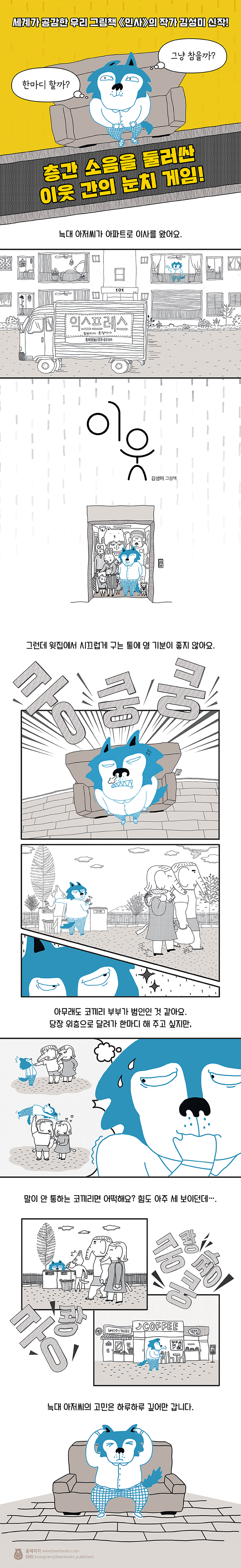 소심한 늑대 아저씨의 또 다른 고민이 시작되었다! 그림책 《인사》에서 이웃집 여우 아이와 누가 먼저 인사하느냐를 두고 눈치 게임을 벌였던 소심한 늑대 아저씨가 아파트로 이사를 왔습니다. 그런데 새집에서 보내는 새로운 나날을 제대로 즐기기도 전에 또다시 고민에 빠지고 맙니다. 윗집에서 쿵쿵거리는 소리가 끊이지 않는 까닭이지요. 참다못해 수위실에 이야기를 하려고 들면 금세 잠잠해지는 것도 몹시 약 오르는 일입니다. 도대체 위층에 누가 사는 건지 궁금하기 짝이 없습니다. 그러던 어느 날, 쓰레기를 버리러 나갔던 늑대 아저씨 눈에 101동 쪽으로 가는 코끼리 부부가 들어옵니다. 그것도 늑대 아저씨가 사는 라인 쪽으로 가는 모습이 말이지요. 무거운 쌀 포대를 가뿐히 둘러멘 아내, 그리고 굵은 팔뚝과 튼실한 가슴팍을 자랑하는 남편. 아무래도 범인은 저 코끼리 부부 같습니다. 아니나 다를까, 그날 저녁에도 위층에서 쿵쾅대는 소리에 온 집 안이 들썩거립니다. 당장이라도 달려가 한마디 해 주고 싶지만, 소심한 늑대 아저씨는 차마 용기를 내지 못합니다. 말이 안 통하는 코끼리면 어떡해? 힘도 아주 세 보이던데…. 나 같은 건 한주먹감일걸. 오만 가지 생각이 머릿속을 오가는 탓이지요. 얄밉게 구는 여우 아이한테도 말 한마디 못했던 늑대 아저씨인걸요. 늑대 아저씨는 이 골치 아픈 문제를 슬기롭게 잘 해결할 수 있을까요? “그 기분 알지, 알지, 잘 알지!” 누구나 공감할 만한 이야기를 누구보다 재치 있게 풀어내는 작가 그림책 《인사》로 세계 여러 나라 독자들에게 깊은 공감을 불러일으켰던 김성미 작가가 새로운 그림책 《이웃》을 가지고 돌아왔습니다. 작가는 전작 《인사》에서 이웃 어른에게, 이웃 아이에게 먼저 인사할까 말까 망설이다 오해가 차곡차곡 쌓이고 불편한 마음이 눈덩이처럼 불어나는 과정을 맛깔나게 풀어냈더랬지요. 이런 경험이 비단 우리만의 것은 아니었던지, 《인사》는 프랑스, 호주, 중국, 대만에 번역 출간되어 현지 독자들에게도 많은 사랑을 받고 있습니다. 그 후속작인 《이웃》은 늑대 아저씨가 아파트로 이사를 오면서 시작됩니다. 전작의 후반부에서 아저씨가 이삿짐 트럭을 타고 도착한 곳이 바로 이 아파트였던 것이지요. 늑대 아저씨는 새집으로 오자마자 집합 주택에 사는 대한민국 사람이라면 누구나 겪고 있는 문제와 마주하게 됩니다. 그렇습니다. 바로 층간소음 문제지요. 늑대 아저씨는 소시민의 대표 주자답게 문제를 일으킨(사실은 일으킨 것으로 추정되는) 이웃에게 말 한마디 못 하고 애만 태웁니다. 나와 별반 다르지 않은 그 마음을 족집게처럼 쏙쏙 집어내 보여 주는 것만으로도 키들키들 웃음이 나오고 분한 마음이 반은 풀리는 것 같습니다. 그러면 이어지는 이야기에서는 늑대 아저씨의 속을 후련하게 풀어 주느냐고요? 글쎄요? 이웃 간의 문제에 있어서는 누구도 일방적인 가해자나 피해자일 수 없다는 점만 이야기해 두기로 하지요. 김성미 작가는 전작에서 그랬듯 이번 작품에서도 보통 사람들의 ‘작은 마음’을 깊숙이 들여다보고, 그 안에서 깊은 공감과 유쾌한 웃음을 끌어냅니다. 작가가 돋보기를 들이대는 일상의 순간순간들을 함께 들여다보며 “알지, 알지, 잘 알지!” 하고 무릎을 치다 보면, 어느새 내 ‘작은 마음’을 볶아 대던 문제도 ‘별거 아니네.’ 싶어지지요. 김성미 작가의 돋보기가 다음은 어떤 ‘작은 마음’으로 향할지 벌써 궁금해집니다. |
