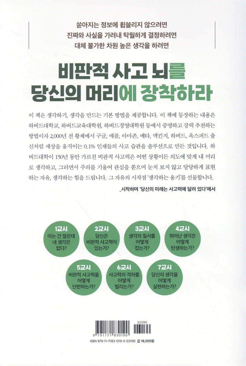 --- p.6, 「당신의 미래는 사고력에 달려 있다」중에서 정보가 차고 넘쳐 머릿속은 작동되기 일쑤이며 가짜, 진짜, 허위, 실제가 교묘하게 뒤섞여 판단을 흐리게 하는 정보 과부하 시대에 생각하기의 기본은 비판적으로 사고하기입니다. 비판적 사고란 의도한 대로 의미 있는 결과를 만드는 의식적인 생각 작업을 말합니다. 비판적 사고력은 근거가 되는 정보를 합리적으로 검토하고 걸러 내는 ‘비판적으로 생각하기’, 전반적인 사고 과정을 모니터링하고 컨트롤하는 ‘반성적으로 생각하기’, 이 모든 과정을 주도하는 자기 자신을 살피고 점검하는 ‘메타 인지’라는 세부 사고 기술이 작동할 때 비로소 가능한 차원 높은 사고 능력입니다. --- p.9, 「당신의 미래는 사고력에 달려 있다」중에서 연구 결과를 더 자세히 보면, 글쓰기를 통해 비판적 사고와 성찰이 가능하고 새로운 아이디어와 해결책을 만들 수 있으며 자신의 생각을 다른 사람들에게 효과적으로 전달할 수 있습니다. 그러니 결과적으로 학업 과정은 물론 향후 사회에 진출한 이후에도 성공할 가능성이 높을 수밖에 없습니다. --- p.28, 「하버드 글쓰기 수업은 글쓰기를 가르치지 않는다」중에서 자기 머리로 생각한다는 것, 스스로 생각한다는 것 역시 그 자체로 바람직한 결과를 만든다는 보장은 아닙니다. 바람직한 사고력은 스스로 생각하기를 너머 의도에 맞는 의미 있는 결과를 가져오게끔 의식적으로 사고하는 과정을 필요로 합니다. 살아가는 힘으로써 사고력은 이런 수준입니다. 노벨의학상을 수상한 생물학자 크리스티아네 뉘슬라인폴하르트가 말했죠. ‘생각할 용기’가 탁월함의 기본 조건이라고요. “많은 사람이 감히 생각할 용기를 내지 못한다. 다른 사람의 얘기를 너무 많이 듣지 말고 스스로 결정하고 스스로 생각하는 용기가 필요하다.” --- p.57, 「스스로 생각하는 사람을 넘어 제대로 생각하는 사람으로」중에서 소크라테스는 상대가 누구든 직접적인 가르침 대신 그에 적절한 질문을 하고 상대는 질문에 대답을 하며 스스로 깨우치게 하는 방식의 문답법 가르침으로 유명합니다. 이 방식은 비판적 사고의 핵심이어서 지금껏 비판적 사고를 촉진하고 장려하는 핵심 기법으로 사용됩니다. 소크라테스의 질문을 듣고 답을 하고 또 질문받고 답을 모색하는 과정을 통해 스티브 잡스는 아무도 생각하지 못한 통찰을 얻고 싶었을 것입니다. 그리고 그 통찰을 자신의 기술에, 사업에 반영하고 싶었을 것입니다. --- p.67, 「왜 스티브 잡스는 소크라테스를 만나고 싶어 했을까?」중에서 비판적 사고는 의도에 맞게 의미 있는 결과물을 만들기 위해서 의식적으로 생각을 만들어 가는 작업입니다. 비판적 사고력이라는 엔진이 문제 상황을 분석하고 이해하여 정보에 입각한 결정을 내리려면 연료를 필요로 합니다. 연료란 다양하고 구체적인 자료들인데, 이런 자료를 토대로 한 증거 기반 생각 만들기가 비판적 사고입니다. 문제 상황 → 비판적 사고 → 해결책 --- p.74, 「우리는 의도한 대로 결과를 만들 수 있어야 한다」중에서 비판적 사고력은 오래전부터 그 중요성이 강조되어 각종 채용 시험에서 킬러 문항으로 자리 잡았습니다. 대학 입시 국어 시험, 토익(TOEIC), 공무적격성평가(PSAT), 법학적성시험에서 제시문을 읽고 추론과 비판적 사고를 통해 문제에 맞는 답을 해야 하는 방식의 시험은 오래전에 도입됐죠. 심지어 2025년 시행되는 9급 채용 시험에서조차 공무원에게 필요한 실제 직무 능력을 측정하기 위한 비판적 사고 능력 여부를 평가합니다. --- p.80, 「정보 과부화 시대의 새로운 요건, 고차원 사고」중에서 가짜 생각이 만들어지는 이유는 어디서 읽고 듣고 보고 한 것을 늘어놓는 것이, 남의 생각과 남의 글을 그대로 베끼는 것이, 좋다는 것을 긁어모아 붙이는 짜깁기하는 것이 생각하기인 줄 알아서입니다. 내 머리로 생각한 것이 아니니 남의 생각을 훔치는 것인 줄 모르기 때문입니다. 비판적으로 생각할 줄 모른다는 증거입니다. 그러니 그가 하는 말이나 글은 다른 사람이 이미 한 말과 글이고 그러니 당연히 진부하고 당연히 평범합니다. 그럼 당연히 상대에게 전해지지도 통하지도 않습니다. --- p.151, 「그래서 네 생각이 뭐야?」중에서 3찰 포맷 사고법은 비판적인 사고를 촉진합니다. 하버드 프로젝트 제로에서 제시하는 비판적 사고 루틴 ‘보기, 생각하기, 궁금해하기(See,Think, Wonder)’처럼 대상을 면밀히 관찰하고 분석하여 사고 과정에 반영하고 이를 토대로 섬세하고 정교하게 사고하도록 돕습니다. 3찰 포맷 사고법은 비판적 사고 루틴을 구성하는 세 가지 생각 기술 ‘비판적으로 생각하기, 반성적으로 생각하기, 생각하는 자기 자신을 생각하기’를 자연스럽게 구사하도록 반영한 사고 도구입니다. --- p.157, 「하버드생은 세 번 생각한다」중에서 비판적 사고도 혁신적인 사고도 원샷으로는 절대 불가능합니다. 뭔가를 주의 깊게 접하고(관찰), 관련하여 일어나는 느낌과 생각을 포착하고, 또 내게 저장돼 있던 어떤 지식과 생각과 연결하고(성찰), 그런 과정에서 생각의 단편들이 뭉치고 흩어지다 보면 스파크가 일고, 마