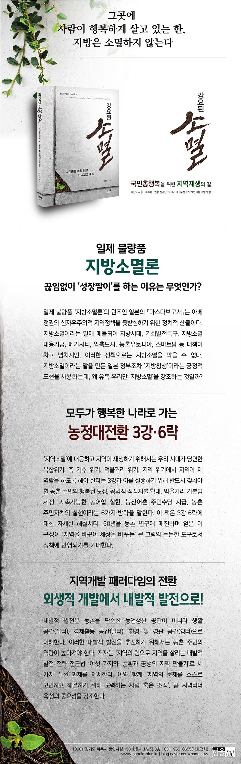 --- p.18, 「프롤로그」중에서 소멸할 수도 없고 소멸해서도 안 되는데, 왜 ‘지방소멸’을 말하는가. 지방 인구감소와 수도권 집중이 심각하기 때문일 것이다. 그렇지만 ‘지방소멸론’이 과연 수도권 집중과 지방쇠퇴의 심각성을 일거에 사회적으로 이슈화하여 지방을 살릴 대책 마련을 촉구하기 위한 순수한 의도에서 나온 것일까. ‘지방소멸론’의 원조인 ?마스다보고서」중에서는 정치적 산물이라는 점에 유의해야 한다. 아베 정권의 신자유주의적 지역정책(로컬 아베노믹스)을 강력하게 뒷받침하기 위해 ‘지방소멸’이라는 폭력적 언어로 일종의 충격요법을 사용한 것이다. --- p.44, 「1장지역은 소멸하지 않는다」중에서 성장주의자들은 저출생을 경제성장으로 해결할 수 있다고 말한다. 경제가 성장하면 젊은이들이 일자리를 얻기 쉬워지고, 생활에 여유가 생겨 결혼을 하고 아이들도 낳을 것이라는 얘기다. 이 말은 심각한 오류에 빠져 있다. 지금의 초저출산은 경제가 성장하지 않아서가 아니라 서울공화국과 재벌공화국이라는 말로 상징되는 잘못된 성장 때문에 생긴 현상이다. 우리 사회의 구조적 문제로 접근해야 한다. 지금의 초저출산은 우리 사회의 현실을 근본적으로 성찰하고 우리 사회를 새롭게 재구성할 비상한 각오로 임해야 장기적으로 해결할 수 있다. --- p.92, 「1장지역은 소멸하지 않는다」중에서 인구소멸 운운하는 사람들은 노동력이 감소해 경제성장이 둔화할 것을 과도하게 염려하는 성장주의자들이다. 그리고 이들은 또한 고령화로 인한 노인 인구에 대한 부양 부담이 복지 비용 증가로 이어져 성장에 저해가 될 것을 염려한다. 심지어 군대는 누가 가고 나라는 누가 지키느냐고 걱정한다. 인구가 감소한다고 나라가 망하는 것도 아니고, 대한민국이 소멸하는 것도 아니며, 국민의 삶이 반드시 나빠지는 것도 아니다. 그에 맞게 사회를 재구조화하면 된다. 인구감소를 경제성장의 관점이 아니라, 행복의 관점에서 보면 긍정적인 측면이 많다. 인구가 줄면 사람의 가치가 귀해진다. 먹고살기 위한 치열한 경쟁도 약해질 것이다. 요즈음 태어나는 아이들은 과거 우리 어릴 때와 비교하면 얼마나 귀하게 자라는가? --- p.85~86, 「1장지역은 소멸하지 않는다」중에서 먼저, 국민총행복을 위해 가장 중요한 것은 건강이다. ??동의보감??에 “식약동원(食藥同源)”이라 했듯이 몸에 좋은 음식을 먹어야 건강하다. 정체불명의 수입 농산물에 우리의 건강을 맡길 수는 없다. 우리의 곡물자급률은 20%, 식량자급률은 40%, 칼로리자급률은 35% 수준에 지나지 않는다. OECD 국가 가운데 가장 낮다. 일상생활에 필요한 칼로리의 3분 2 이상을 외국에 의존하고 있다. 식량주권을 지키고 국민의 먹을거리 기본권을 보장하기 위해서는 우리 농업이 좀 더 힘을 내야 한다. --- p.152, 「2장지역재생을 위한 패러다임의 전환」중에서 생산주의 농정에서 다원적 기능 농정으로 전환하기 위해서는 농(農)에 대한 인식의 전환이 필요하다. 즉, 생산(산업) 관점에서 다기능(지역) 관점으로 전환해야 한다. 생산(산업) 관점에 따르면 농업의 역할(목표)은 식량을 값싸게 공급하는 것이다. 이를 위해 농업생산 규모를 키워 농업생산성을 높이고 비용을 최소화한다. 농업의 기계화, 현대화, 시설화가 추구되고 정부는 그에 필요한 자금을 보조한다. 따라서 정부의 지원은 대농과 기업농에 집중된다. 대량 생산을 추구하기 때문에 농업생산이 단작화하는 경향이 있고, 농산물 판매는 중앙(대도시)의 대규모 시장을 지향한다. 고투입 농법을 지향하기 때문에 환경에 부담을 준다. --- p.174, 「3장지역을 살리는 농정 혁신 가이드라인」중에서 나는 전국 8개 도의 지역리더들과 함께 ‘국민총행복과 농산어촌개벽대행진 전국추진위원회’를 결성하여, 2021년 10월부터 2022년 1월까지 전국 8개 도 18개 시?군을 순회하며 ‘국민총행복과 농산어촌개벽대행진’을 하고 민회(民會)를 개최했다. 민회에서 농민들은 우리를 행복하게 해주지 않아도 좋으니 “더 이상 불행하게 만들지 마라”며 절규했다. “왜, 우리의 생존 기반인 농지를 빼앗아 가느냐?”, “왜 산업폐기물을 우리 농지에, 우리 밥상에 마구 버리느냐?”, “기업이 버린 오염물질과 오폐수 때문에 식수와 농업용수를 사용할 수 없다”, “풍력 발전의 소음 때문에 청력을 잃었다”, “송전탑 설치로 동네가 둘로 갈라져 싸운다”, “태양광 시설을 왜 도시에는 하지 않으면서 우리 논밭에 하느냐?” 등 “이대로만 살게 해달라”고 호소했다. --- p.286, 「4장농어민이 행복해야 국민이 행복하다」중에서 쌀 의무 수입량을 재협상하여 의무 수입량을 줄이고 수입쌀을 해외 원조 등에 사용해 수입쌀로 인한 쌀 공급 과잉 문제를 해결해야 한다. 우리나라는 2015년 쌀 시장 전면 개방 당시 수입쌀 40만 8700t에 대해 5% 관세율할당(TRQ)으로 특혜를 주고, 나머지는 512%의 관세를 매기기로 했다. 40만 8700t은 국내소비량 8%를 기준으로 한 것인데, 지금은 쌀 소비가 많이 줄어 전체 소비량의 12%에 해당한다. 농민들은 쌀 소비량이 줄면 의무 수입량도 줄어야 한다며 재협상을 요구하고 있다. 일리 있는 