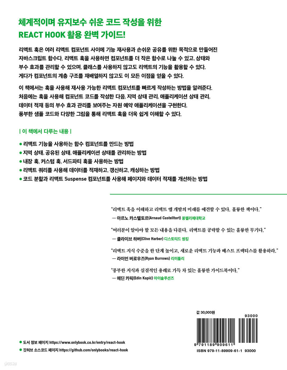리액트 훅을 이해하고 리액트 앱 개발의 미래를 예견할 수 있다. 훌륭한 책이다. - 아르노 카스텔토르(Arnaud Castelltort) (몽펠리에대학교)