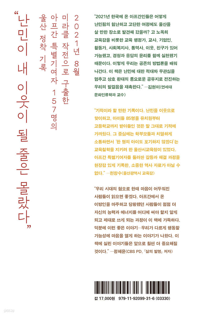 “기적이라 할 만한 기록이다. 난민을 이웃으로 맞이하고, 아이들 85명을 유치원부터 고등학교까지 받아들인 것은 말 그대로 기적에 가까웠다. 그 중심에는 학부모들과 치열하게 소통하면서 ‘한 명의 아이도 포기하지 않겠다’는 교육철학을 지키려 한 울산시교육청이 있었다. 아프간 특별기여자를 둘러싼 갈등과 해결 과정을 현장감 있게 기록한, 소중한 역사 자료가 아닐 수 없다.” - 천창수 (울산광역시 교육감)