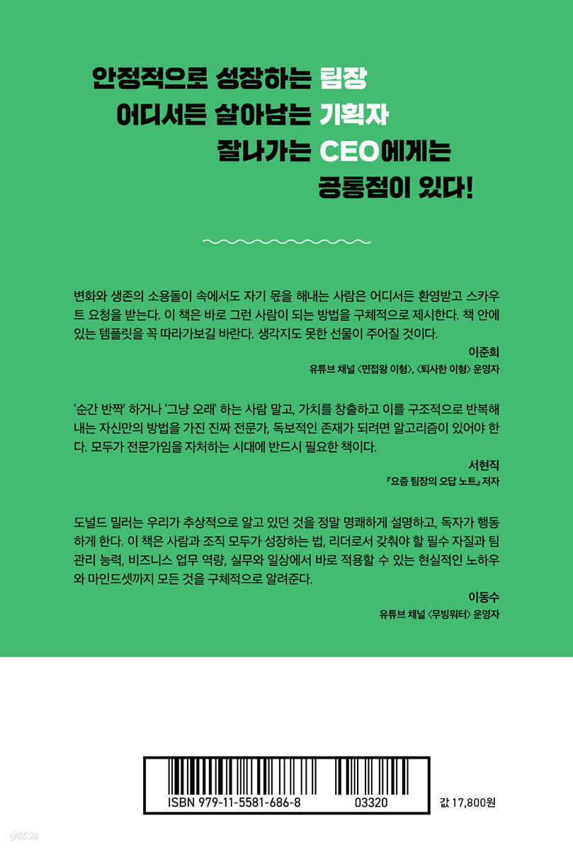 도널드 밀러는 우리가 추상적으로 알고 있던 것을 정말 명쾌하게 설명하고, 독자가 행동하게 한다. 이 책은 사람과 조직 모두가 성장하는 법, 리더로서 갖춰야 할 필수 자질과 팀 관리 능력, 비즈니스 업무 역량, 실무와 일상에서 바로 적용할 수 있는 현실적인 노하우와 마인드셋까지 모든 것을 구체적으로 알려준다. - 이동수 (유튜브 채널 [무빙워터] 운영자)