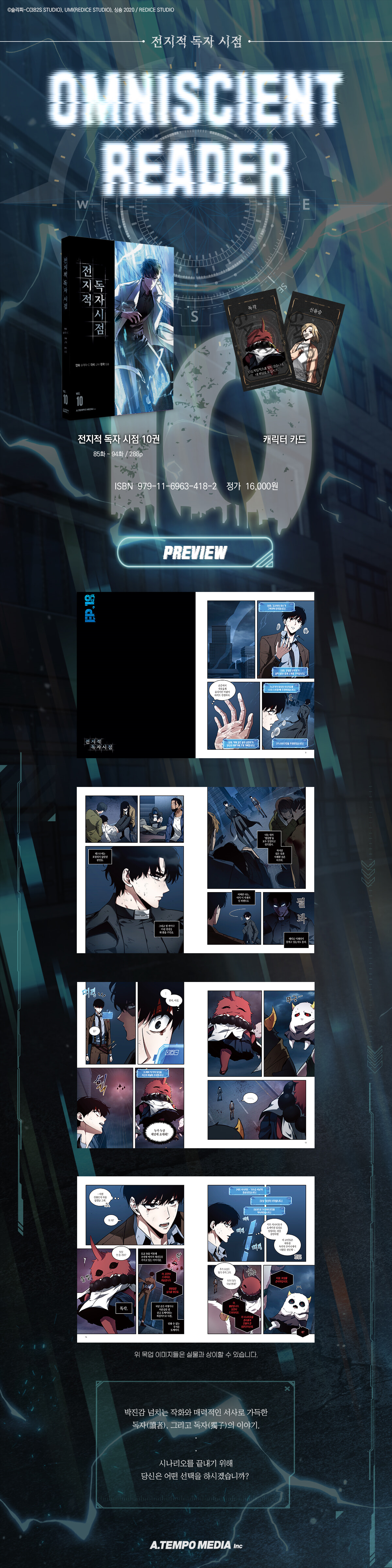 레전드 판타지 웹 소설 마침내 웹툰으로. 총 연재 횟수 3,149회 평균 조회 수 1.9회 평균 댓글 수 1.08개 10년 넘게 나 혼자 읽어온 소설의 완결을 본 그날. 소설 속 세계는 현실이 되었고, 이 세계의 결말을 알고 있는 유일한 독자가 되었다. 이것은 독자(讀者)의 설화. 동시에, 독자(獨子)의 설화. 단, 한 사람의 독자를 위한 이야기다. [지금부터 메인 시나리오가 시작됩니다.] |