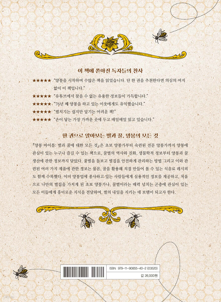 따뜻한 봄이 오면 탐스럽게 핀 꽃 사이로 주위를 바쁘게 날아다니는 곤충들을 만날 수 있다. 그중에서도 노란색과 검정색 털옷을 입은 귀여운 벌들은 왱왱 소리를 내며 유독 눈에 띈다. 도시 사는 현대인들이야 꿀벌보다는 이들 활동의 결과물인 꿀에 더 익숙하겠지만 우리는 역사를 통해 인간과 꿀벌이 오랜 세월 지속적인 관계를 맺어 왔음을 알 수 있다. 선사시대의 암각화에서도 꿀을 얻으려는 선조들의 노력을 볼 수 있고 꿀과 밀랍, 이것들로 만드는 다양한 상품은 이미 전 세계적인 산업의 한 축이 되었다. 하지만 21세기에 들어서면서 꿀벌의 수는 무서운 속도로 감소하고 있다. 무리 지어 사는 벌들이 갑자기 사라지는 ‘벌집군집붕괴현상(Colony Collapse Disorder)’은 2006년 미국에서 보고되고 2022년 우리나라에서도 갑작스럽게 나타나 지금까지도 그 원인을 밝히지 못하고 있다. 꿀벌들을 죽음으로 내모는 이 현상은 전 세계적으로 확대되고 있는데, 우리나라도 제주도에서 시작해 양봉농가에서 꿀벌이 연쇄적으로 사라지는 이상 현상이 나타나면서 지구상에서 벌들이 사라지고 있다는 뉴스기사와 시사 프로그램의 집중 취재가 이어졌다. 정부에서는 양봉농가의 피해 사실을 대대적으로 조사했지만 이렇다 할 대책을 내놓지 못하고 있다. 우리는 꿀벌이 얼마나 쉽게 죽는지 그리고 식물의 수분 작용을 돕는 꿀벌의 활동이 세계 농업 경제에 얼마나 지대한 영향을 끼치는지를 심각한 문제가 발생한 후에서야 비로소 깨달았고, 꿀벌의 중요성은 재조명되기 시작했다. 두 눈 뜨고 꿀벌의 멸종을 지켜보고 싶지 않다면 우리는 지금부터라도 꿀벌에 관해 깊이 고민해봐야 한다. 『양봉 바이블: 벌과 꿀에 대한 모든 것』은 양봉가에게 유용한 정보를 최대한으로 전달하고자 한 노력의 산물로, 초보 양봉가부터 숙련된 전문 양봉가까지 벌과 양봉이 궁금한 독자를 위해 꿀벌의 역사와 진화, 생물학적 정보부터 양봉과 꿀 생산에 관한 정보까지 담았다. 꿀벌을 돌보고 벌집을 안전하게 관리하는 방법 그리고 이와 관련된 여러 가지 제품에 관한 정보는 물론, 꿀을 활용해 직접 만들어 볼 수 있는 식음료 레시피도 함께 수록했다. 이미 양봉업에 종사하고 있는 사람들에게 실용적인 정보를 제공하고, 처음으로 나만의 벌집을 가지게 된 초보 양봉가나, 꿀벌이라는 매력 넘치는 곤충에 관심이 있는 모든 독자에게 흥미로운 정보를 제공하여 이들의 내일이 지속되는 데 도움 되는 것이 이 책의 목표이다. 벌이 왜 인간에게 그토록 필요한지, 우리가 어떻게 벌에 의존하게 되었는지, 왜 벌 없이는 살 수 없는지를 이 책을 읽으면 정확히 이해하게 될 것이다. 꿀벌은 식량 생산의 중심이며, 꿀벌이 없다면 인간이 물과 공기 및 토양을 오염시키기 시작한 이후 많은 동물이 그랬던 것처럼 인류도 멸종될 것이다. “양봉가라면 누구나 가지고 있어야 할 책! 언젠가 내 손으로 직접 벌을 기르기 전에 양봉에 대한 궁금증을 해소할 책을 찾았다.” ―미국 아마존 독자 “실용적인 양봉 정보 외에도 역사, 생물학, 요리법 등 관련 지식을 다양하게 얻을 수 있다. 나 같은 초보자에게 좋은 책이다.” ―영국 아마존 독자 |