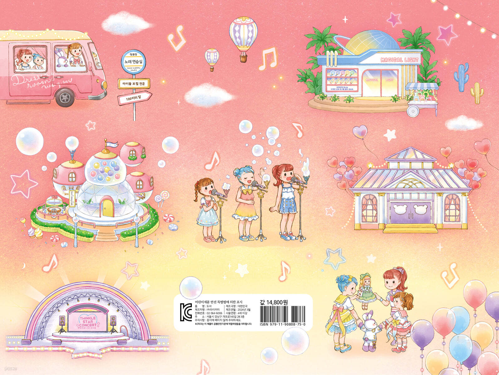 두근두근 쿵쾅쿵쾅 뛰는 심장 소리와 함께 시작된 오디션! 나도 무대 위에서 반짝반짝 빛나는 아이돌 스타가 될 수 있을까요? 레이의 꿈은 아이돌 가수가 되는 거예요. 매일 토끼 인형 토토를 앞에 두고, 거울을 보며 춤추고 노래하지요. 오늘도 거울 앞에서 노래를 흥얼거리는데, 갑자기 거울이 밝게 빛나면서 누군가의 목소리가 들려왔어요. 거울에 비친 레이의 인형이 말을 하고 있었어요! 인형은 레이에게 손을 내밀었어요. 레이가 용기를 내어 손을 잡자, 눈앞에 하늘도 길도 반짝반짝 빛나는 세상이 펼쳐졌답니다. “나는 루티라고 해. 너라면 꼭 멋진 아이돌 가수가 될 것 같아서 오디션에 초대했어. 오디션에서 너의 멋진 모습을 모두에게 보여 줘!” 레이는 루티의 응원에 힘입어 오디션에 참가하고, 노래와 춤도 열심히 연습해요. 또 나만의 멋진 마이크와 춤추기 좋은 구두, 화려한 무대 의상과 깜찍한 소품, 마지막으로 마법의 응원 봉까지 고르면, 어느새 아이돌 가수로 데뷔할 준비가 모두 끝이 나지요! 과연 레이는 꿈에 그리던 멋진 아이돌이 될 수 있을까요? 관객들의 뜨거운 환호성과 박수 소리에 둘러싸이는 것은 어떤 기분일까요? 두근두근, 오늘은 무엇을 고를까? 다정한 이야기와 사랑스러운 그림 속에 ‘마음에 드는 것’을 고르는 즐거움과 설렘이 가득! 마법의 문을 열고, 매일매일 새로운 아이돌 가수로 변신해 보아요! 아이들은 무대 위에서 반짝반짝 빛나는 아이돌 스타를 좋아하고 동경해요. 영상을 보며 예쁜 옷을 입고 무대에서 춤추고 노래하는 자신의 모습을 상상하곤 하지요. 《아이돌이 되는 마법의 문》은 바로 이러한 소녀들의 반짝이는 꿈에서 태어난 책이에요. 아이들은 표지를 여는 순간부터 마법처럼 책 속으로 빨려 들어가요. 책 속에는 심장이 쿵쾅쿵쾅 뛰는 오디션 이야기뿐만 아니라 나만의 커스텀 마이크, 화려한 무대 의상과 구두, 귀여운 소품, 마법의 응원 봉 등 아이돌 스타에게 필요한 아기자기하고 사랑스러운 소품이 가득해요. 아이들은 자연스럽게 책 속 주인공에게 이입해, 마치 진짜 가게에서 물건을 고르는 것처럼 내 마음에 쏙 드는 것을 하나씩 골라요. 그리고 멋지게 변신할 내 모습을 상상하면서 두근거리는 설렘과 즐거움, 기쁨 등 다양한 감정을 느끼게 되지요. 책의 이야기는 뜨거운 환호성과 박수 소리 속에서 무대를 마친 소녀가 집으로 돌아오면서 끝이 나요. 하지만 우리 집 공주님의 이야기는 끝나지 않아요. 어린 공주님의 취향은 그날의 기분이나 마음에 따라 계속해서 바뀌기 때문에, 책을 펼칠 때마다 선택도 달라지거든요. 그래서 몇 번이고 책을 펼쳐 보면서, 매일매일 새로운 모습의 아이돌 스타로 변신하지요. 아이돌 스타를 꿈꾸는 친구들에게 행복한 선물이 될 특별한 그림책입니다. |