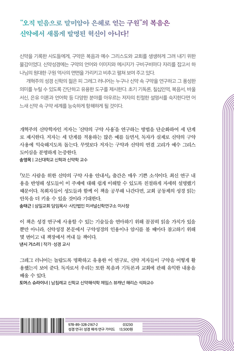신약의 구약 사용이라는 주제는 최근에 흥미로운 진전과 발견을 보여 줬지만, 불행하게도 관련 연구는 대부분 전문적이라서 일반 독자가 쉽게 다가가기 힘들었다. 이제 그레그 러니어는 놀랍도록 명확하고 유용한 이 연구로 신약 저자들이 구약을 어떻게 활용했는지 여러 가지 예를 제시함으로써 그 간극을 메워 주었다. 독자로서 우리는 또한 복음과 기독론과 교회에 관해 유익한 연구들을 얻을 수 있다. - 토머스 슈라이너 (남침례교 신학교 신약해석학 제임스 뷰캐넌 해리슨 석좌교수)
