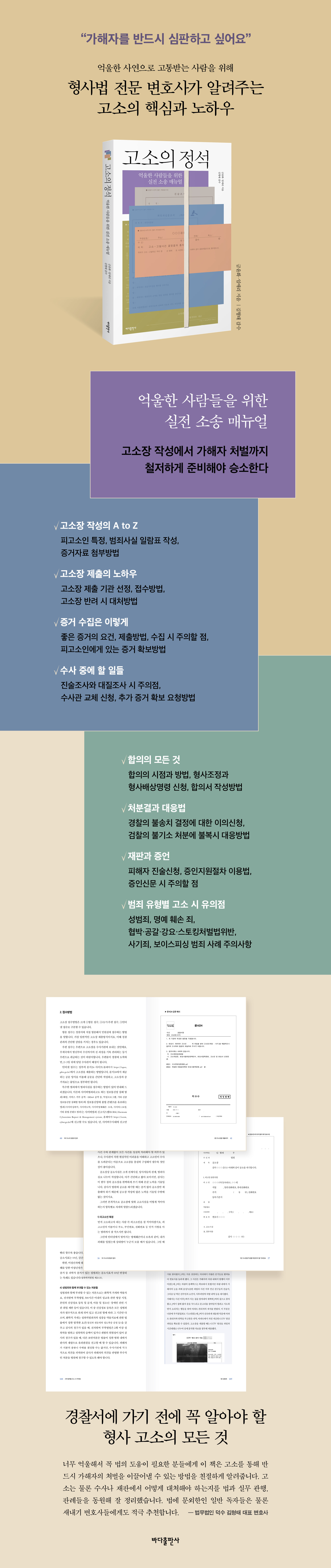 범죄 피해를 당한 사람은 고소장만 내면 가해자가 구속되고 처벌받을 것이라 생각한다. 하지만 실제 현실은 전혀 다른 것이 보통이다. 고소인의 바람과 달리 수사는 느릿느릿 하세월로 진행되기 일쑤고, 구속 수사를 하는 경우는 많지 않다. 증거 부족으로 기소 자체가 되지 않는 경우도 많고, 이 경우 피의자가 고소인을 무고죄로 역고소해 되레 수사를 받는 처지에 놓이기도 한다. 억울한 마음에 감정적으로 혹은 빨리 돈을 받아낼 생각으로 섣불리 고소해서는 가해자 처벌이라는 소기의 목표를 이루기 어렵다. 《고소의 정석》은 길고 어려운 싸움을 각오하고 현재 고소를 생각하시는 분들에게, 가해자를 처벌하기 위해 확실하게 준비하고 제대로 고소하는 방법을 알려준다. 저자들은 범죄 피해자 대리를 주로 맡아온 형사법 전문 변호사들로, 억울한 상황을 고소로 해결하려다가 더 억울해진 경우들을 많이 보고 이 책을 쓰게 되었다. 저자들이 현장에서 10년간 쌓은 형사 고소의 전문지식과 노하우가 가득 담겨 있는 이 책의 주요 특징은 다음과 같다. 첫째, ‘고소장에는 어떤 내용을 적어야 할까?’ ‘고소할 때 꼭 변호사가 필요할까?’ ‘고소할 때 드는 비용과 걸리는 시간은?’ 등 처음으로 형사 고소를 해보려는 분들이 가장 궁금해할 사항들을 간단한 질의응답 형식으로 명쾌히 설명한다. 둘째, 고소장 작성과 제출 이후의 전반적 절차, 즉 증거 수집부터 경찰서 진술조사와 피의자 대질조사, 합의, 불만족스러운 처분결과에 대한 불복과 재판 증인 진술까지, 수사와 재판의 각 단계별로 고소인이 해야 할 일과 상황별 대응법을 자세히 알려준다. 셋째, 범죄 관련 법조문과 판례를 쉽게 풀어 설명하고, 생생한 범죄 사례를 예시하며, 관련 공문서 서식을 다양하게 수록하고 작성법을 보여줌으로써 법과 완전히 먼 삶을 살아온 분이라도 쉽게 이해할 수 있도록 돕는다. 마지막으로, 성범죄부터 명예에 관한 죄, 협박 · 공갈 · 강요 · 스토킹처벌법위반, 사기죄, 횡령죄와 배임죄, 무고와?위증에?관한?죄, 업무방해죄, 문서에 관한 죄, 보이스피싱 범죄까지 9가지 범죄 유형별로 고소 시 주의할 점을 알려준다. 다음은 책의 내용 일부를 간추린 것이다. 합의의 시점과 방법 합의란 ‘가해자의 피해자에 대한 피해 회복’과 ‘피해자의 가해자에 대한 처벌불원’ 둘 다를 의미하는 실무 용어다. 피해의 일부 회복이라도 원하는 고소인뿐 아니라 피해자의 처벌불원의사가 감형의 요인이 되는 가해자 모두에게 합의는 가장 중요한 과정이다. 합의는 고소 전, 수사 단계, 재판 단계에서도 가능하다. 하지만 수사 초기에 너무 일찍 합의 의사를 드러내면 수사관의 수사 의지가 약해질 수 있으니, 합의 의사를 물어볼 때 “지금으로서는 처벌이 우선일 것 같습니다”라고 강력한 처벌 의지를 밝히는 편이 좋다. 검찰 단계에서는 합의 외에도 ‘형사조정’이라는 특별한 제도가 있다. 피해자와 피의자 모두 합의 의사가 있다면, 검사는 사건을 형사조정에 회부한다. 검찰 형사조정 단계로 가면, 피해자의 전화번호나 인적 사항이 피의자 측에 직접 노출되지 않으며, 직접 시간을 내 검찰청에 가지 않더라도 전화만 몇 번 받으면 해결될 수 있다는 장점이 있다. 하지만 검찰 형사조정에서 합의를 하면 대부분 각하 처분으로 끝나는 경우가 많으므로 상대방을 처벌하지 못할 수도 있음을 감안해야 한다. 재판 단계에서도 합의 외에 ‘형사배상명령’을 신청할 수 있다. 형사배상명령이란 법원이 유죄판결을 선고하면서 피해자의 손해를 배상하라고 명하는 것으로, 판결 선고 때 배상명령이 확정되면 민사소송의 판결처럼 피고인의 재산을 압류하는 등 강제집행을 할 수 있다. 하지만 형사배상명령은 상해죄, 절도 · 사기 · 횡령죄, 성폭력범죄 등 법률(소송촉진 등에 관한 특례법 제25조 제1항)에 정한 범죄에만 가능하며. 치료비나 위자료, 책임 범위가 불분명한 물적 손해는 각하될 수 있으니, 재판 단계에서 배상명령에만 의존하지 말고 적극적으로 합의를 보는 편이 좋다. 처분결과에 불복하는 법 경찰은 고소된 사건이 혐의가 없다고 여기면 불송치 결정을 내리고 수사를 종결한다. 불송치 결정에는 혐의 없음(범죄가 인정되지 않거나 증거가 불충분할 경우), 죄가 안 됨(‘정당방위’처럼 법률상 범죄 성립 조각 사유가 있는 경우), 공소권 없음(친고죄나 반의사불벌죄에서 고소가 취소되거나 처벌불원의사가 있을 경우), 각하(형사상 죄가 아닌 경우나 미성년자라 형사처벌이 안 될 경우 등) 등이 있다. 경찰의 불송치 결정에 대해, 고소인은 소속 관서의 장에게 이의신청을 함으로써 구제를 받을 수 있다. 고소인이 이의신청을 하면 경찰은 지체 없이 검찰에 사건을 송치해야 하고, 검사는 90일 이내에 재수사를 요청할 수 있다. 불송치 결정한 사건도 검찰에 서류가 넘어가 검토되기는 하지만, 이의신청 없는 사건은 따로 관리되고 검사의 재수사 요청도 1회만 가능하므로, 가해자 처벌을 원하는 고소인은 적극적으로 이의신청을 하는 것이 바람직하다. 이의신청 기한은 따로 정해져 있지 않지만, 가급적 검사가 기록 검토를 마치고