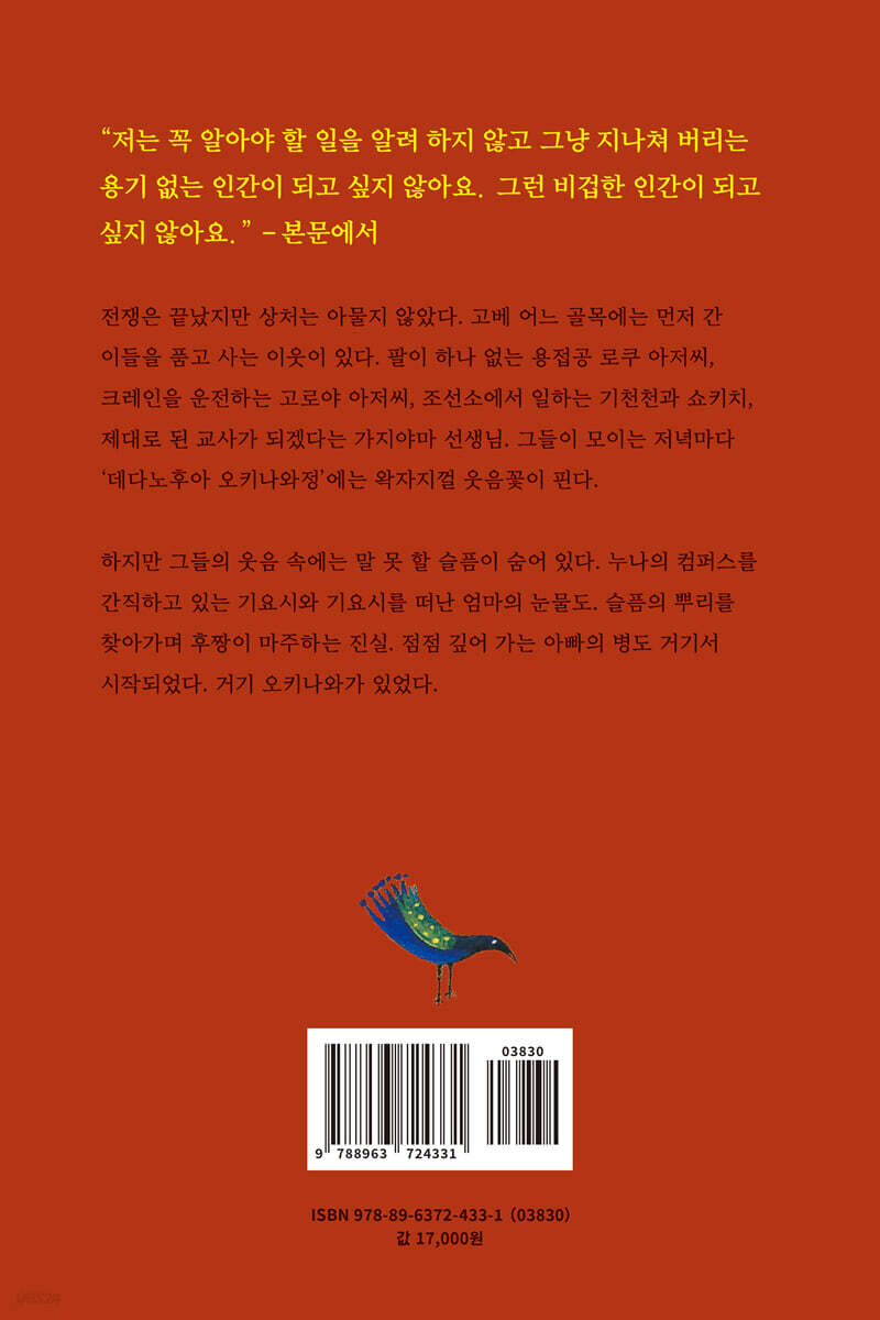 하이타니 겐지로는 책을 쓰고 더 이상 글을 쓸 수 없을 것 같다, 작품 속에서 내가 살고, 살아 내고, 그리해서 생명이 끝난 느낌이었다, 고 했다. 이 책은 단행본으로 나오기 전에 2년 동안 교육 잡지에 연재되었다. 절반쯤 연재했을 때 하이타니 겐지로는 열아홉 살 소녀가 보낸 편지를 받았다. “선생님, 너무나도 마음이 지쳤어요. 가만히 있으면 짓눌려 버릴 것 같아서 고통스러워요. 사흘 내내 학교 도서관에 들러서 이달 호까지 읽어 버렸어요. 왜죠, 선생님. 왜 그렇게 무서운 거예요? 어떻게 그렇게 따뜻해요? 사람이 너무 많아서 울지 않으려고 했지만, 눈물이 나와서 난처했어요.” 비극적인 전쟁을 겪은 오키나와 사람들. 가족을 끌어 오던 무게에 짓눌려 자살한 큰형. 그들의 삶과 죽음으로 엮어 낸 소설이어서 그랬던 것일까? 견딜 수 없는 비극을 겪은 사람들이, 이런 세상이 어디 있을까, 싶게 따스한 온기를 나누며 살아가니, 그렇게 무서우면서도 그렇게 따뜻했을까? 극단적 정서가 횡횡하는 오늘날, 목화솜같이 따뜻한 소설이라 했던 옮긴이의 말에 깊이 고개가 끄덕여진다. 오키나와 이야기다. “적의 수류탄이 아니다. 나는 그저 보통 목수일 뿐, 군인이 아니었다. 오키나와를 지켜 준다고 온 군대가 우리에게 죽으라고 했다. 명예롭게 죽으라고 수류탄을 주었다. 군대는 나라를 위해, 천황 폐하를 위해 죽으라고 말했다. 우리를 모두 한데 모으고, 그 한복판에서 수류탄의 안전핀을 뽑았다.” 소설 속 문장이다. 그러나 상상으로 만든 문장이 아니다. 실제로 있었던 역사적 사실이다. 자식을, 가족을 그렇게 보낸 사람들은 어떻게 살아갈 수 있을까? “살아 있는 사람만의 세상은 아니야. 살아 있는 사람들 속에 죽은 사람들도 함께 살고 있어서 인간은 따뜻하고 착한 마음을 가질 수 있단다.” 고베 어느 골목에 모여 사는 이웃의 이야기다. 그들이 모이는 ‘데다노후아 오키나와정’에는 웃음이 넘친다. 서로가 서로를 보아주고 보듬는 목소리가 흐른다. 그들이 사는 모습, 그들이 품고 사는 이야기를 어린 후짱의 눈으로 그렸다. 책을 읽다가 문득, 이 책이 사람들 이야기를 가만히 들어 주는 느낌이다. 지독하게 고통스럽게 살아온 사람들의 이야기를. 그래서 한없이 따뜻하다. 새로 편집을 끝내며, 전쟁통에 딸을 잃은 로쿠 아저씨가 기요시를 조사하겠다며 온 형사에게 한 말이 오래 남을 것 같다. “당신들의 인생이 무엇과도 바꿀 수 없는 것과 마찬가지로 이 아이의 인생도 무엇과도 바꿀 수 없소. 사람을 사랑한다는 건 모르는 사람의 인생을 아는 것이오.” |