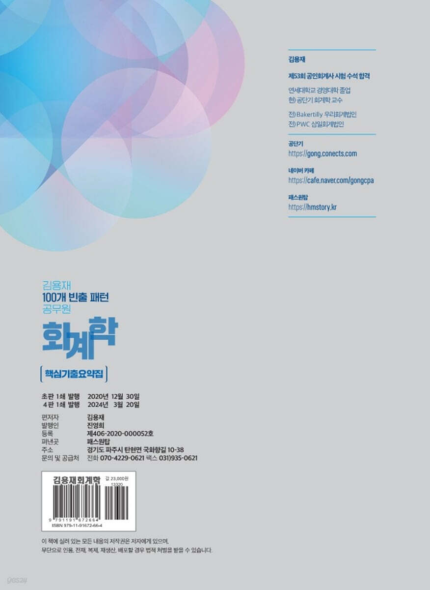 공무원 회계학에는 자주 출제되는 ‘정형화된 패턴’이 있습니다. 그 패턴을 숙지하는 것이 회계학 고득점의 핵심입니다. 패턴별 풀이법을 미리 계획해놓지 않고서는 실전에서 제한된 시간 안에 빠르고 정확하게 문제를 풀 수 없습니다. 저는 10년간의 공무원 기출문제를 분석하여 가장 자주 나오는 출제 유형 100개를 선정하였습니다. 그리고 이 100개 패턴들에 대해서 풀이법을 상세히 설명할 것입니다. 패턴 회계학은 전부 풀이법에 대한 책입니다. 2. 중요 주제에 집중 여러분은 ‘학자’가 아니라 ‘수험생’입니다. 시험 합격 전까지는 시험에 자주 나오는 주제들을 위주로 공부하시고, 나머지 주제들은 시험 합격 이후에 배우셔도 전혀 늦지 않습니다. 책이 얇다고 불안해하지 마세요. 책이 얇기에 여러분은 핵심을 더 잘 기억할 수 있는 것입니다. 3. 패턴 회계학의 구성 (1) 핵심 요약집+기출문제집 각 패턴별 풀이법을 설명한 뒤, 각 패턴의 풀이법을 연습해볼 수 있는 문제를 패턴별로 2문제씩 약 200문제를 선별하였습니다. 1문제로도 충분히 정리할 수 있는 패턴은 1문제만 실었고, 2문제로 정리하기 어려운 패턴은 3문제까지 실어놓았습니다. (2) 재무회계-정부회계-원가관리회계 수험생들이 정부회계를 다른 주제에 비해서 어려워합니다. 정부회계를 어려워하는 이유는 딱 한 가지입니다. 정부회계는 상대적으로 늦게 배워서 재무회계나 원가관리회계에 비해 공부를 덜 하기 때문입니다. 이러한 문제를 막기 위해서 정부회계를 원가관리회계 앞에 배치해놓았습니다. 정부회계를 포기하고서는 현실적으로 합격이 어렵습니다. 꼭 정부회계를 정복하길 바랍니다. 4. 계리사 기출문제 수록 제가 계리사 문제를 활용하는 이유는 두 가지입니다. 첫 번째는 난이도입니다. 계리사 문제는 공무원 7급 시험과 난이도가 비슷합니다. 기출문제만큼 실제 난이도를 정확히 반영하고 있는 문제는 없습니다. 기출문제를 보면서 실제 난이도가 어떤지 여러분께서 직접 느끼시길 바랍니다. 두 번째는 계리사 시험에서 출제되었던 문제가 공무원 시험에 출제된 사례가 많습니다. 패턴 회계학에 있는 계리사 문제들은 이후에 얼마든지 공무원 시험에 출제될 가능성이 있으니 주의 깊게 보시길 바랍니다. 패턴 회계학 공부법 1. 1회독: 30일 공부법 패턴 회계학은 100개의 패턴을 하루 분량으로 나누어 놓았습니다. 하루에 3~5개의 패턴씩 공부하시면 30일이 걸립니다. 푸는 문제가 패턴당 2문제씩이기 때문에 하루에 푸는 문제가 6~10개입니다. 풀이법까지 같이 읽더라도 2시간이면 하루 분량을 충분히 끝낼 수 있을 것입니다. 2. 2회독: 하루 공부법 패턴 회계학에 실려있는 문제가 총 200문제밖에 되지 않기 때문에 시험 직전에 하루 안에 전부 푸는 것도 가능합니다. 실전에서는 20문제를 20분 안에 풀어야 하기 때문에, 200문제면 200분 안에 풀 수 있는 분량입니다. 시험 직전에 하루 날을 잡아 오전에 200문제를 전부 풀고, 오후에 오답 풀이를 하면 하루 안에 회계학 전 범위를 볼 수 있습니다. 3. ‘코어 회계학’ 활용 코어 회계학은 기본이론 강의와 심화이론 강의에서 사용하는 교재로 10년간의 9급 및 7급 공무원 회계학 기출문제를 담고 있습니다. 이미 이 교재에 실려있는 문제만으로도 훈련이 충분히 가능하다고 생각합니다. |