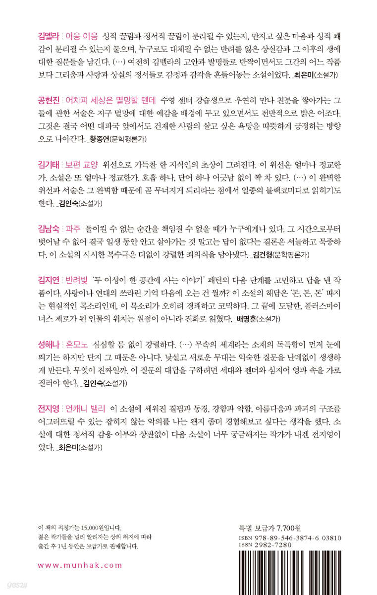 공현진의 「어차피 세상은 멸망할 텐데」는 수영 센터의 강습반에서 꼴찌를 도맡아 하는 주인공 ‘주호’와 ‘희주’가 세상의 눈치를 보지 않고 저만의 속도로 호흡하며 꿋꿋하게 연대해나가는 “사랑스럽”고도 “진중한(심사평. 문학평론가 김건형) 작품으로, 망해가는 세계에서 우리가 어떻게 희망을 발견할 수 있을지를 생각하게 한다. 김기태의 「보편 교양」은 고전읽기 수업을 맡은 국어 교사 ‘곽’이 어느 날 학부모에게서 민원을 받은 후 평온했던 그의 내면에 균열이 생기는 순간을 포착한 문제작으로, 정교하고 촘촘한 문장에 녹아 있는 지식인 화자의 위선이 크나큰 아이러니를 불러일으킨다. 김남숙의 「파주」는 화자 ‘나’의 남자친구 ‘정호’에게 괴롭힘을 당했던 군대 후임 ‘현철’의 복수 서사와 아이들을 가르치는 학원 선생인 ‘나’가 겪어온 자기혐오의 문제를 겹쳐놓으면서 폭력의 구조를 질문케 하고 인간관계의 역학을 확장시키는 수작이다. 김지연의 「반려빚」은 전 애인과 동거를 하면서 생긴 일억 육천의 빚을 마치 가족인 양 ‘반려빚’으로 여기는 ‘정현’의 이야기를 통해 서로 사랑하는 관계에서조차 이해타산과 채무가 발생할 수밖에 없는 자본주의 사회의 비극과 그 구조의 약자인 청년 세대의 고통을 통렬하게 펼쳐 보인다. 성해나의 「혼모노」는 몸주로 모시고 있던 장수 할멈 신이 홀연히 떠나 이른바 ‘신빨’이 다해버린 삼십 년 차 박수무당 ‘문수’와 그의 앞집으로 들어온 ‘신애기’의 기 싸움이 인상적인 활극으로, 무속 문화라는 독특한 세계를 실감나게 그려냄으로써 눈에 보이지 않는 신 앞에 선 인간의 믿음과 불신, 진정성을 질문하는 강렬한 소설이다. 전지영의 「언캐니 밸리」는 야간 택시 운전기사 ‘나’가 과거에 태웠던 한 손님이 염산 테러를 당했다는 사실을 알게 된 후 벌어지는 고딕풍 스릴러이다. 사건의 무대를 부유층이 주로 거주하는 폐쇄적인 마을로 설정함으로써 부자와 빈자, 미와 추, 정상성과 비정상성 사이에 존재하는 인간의 불안과 나약함을 형상화한 야심 넘치는 이야기이다. ★ 젊은작가상은 작품활동을 시작한 지 십 년이 넘지 않은 작가들이 한 해 동안 발표한 중단편소설을 대상으로 한다. 계간 『문학동네』의 계간평 코너를 맡은 박서양, 이소, 임정균, 전승민 평론가가 2023년에 발표된 중단편소설을 성실하고 꼼꼼하게 검토해주었고, 이 작업을 바탕으로 성현아, 전청림, 최다영 평론가가 각자의 추천작을 더하고 함께 선고심을 진행해 총 스무 편의 작품이 본심에 올랐다. 본심 심사위원으로는 김건형, 황종연 평론가와 김인숙, 배명훈, 최은미 소설가가 위촉되어 2024년 1월 26일에 본심 심사가 열렸다. 김멜라의 「이응 이응」은 성에 대한 대담한 상상력과 ‘반려’와 ‘사랑’에 대한 천착이 두루 지지를 받으며 대상작으로 선정되었다. 김지연의 「반려빚」과 공현진의 「어차피 세상은 멸망할 텐데」는 청년 세대의 현실과 그 고투를 생생하게 그려낸 점에서 눈길을 끌었고, 김기태의 「보편 교양」과 성해나의 「혼모노」는 위선과 위악을 세밀하게 포착하면서도 재치 있는 문장으로 주목받았다. 김남숙의 「파주」와 전지영의 「언캐니 밸리」는 인간의 폭력성, 불안이라는 주제를 인물들의 관계와 공간을 통해 효과적으로 형상화하는 솜씨가 돋보였다. 이렇게 일곱 명의 수상자를 꼽고 나서 보니, 젊은작가상을 처음 수상하는 신인 작가들이 상대적으로 많다는 결과가 또한 반가웠다. 이들의 다음 작품이 더욱 기대된다. 재기 넘치는 젊은 작가들의 활약을 독자들에게 소개할 수 있어 기쁘다. 이번 젊은작가상 수상작품집도 독자 여러분에게 즐거운 독서의 시간을 선물해줄 것이라 믿어 의심치 않는다. _‘심사 경위’에서 ★ 김멜라, 「이응 이응」 성적 끌림과 정서적 끌림이 분리될 수 있는지, 만지고 싶은 마음과 성적 쾌감이 분리될 수 있는지 물으며, 누구로도 대체될 수 없는 반려를 잃은 상실감과 그 이후의 생에 대한 질문들을 남긴다. (…) 여전히 김멜라의 고안과 발명들로 반짝이면서도 그간의 어느 작품보다 그리움과 사랑과 상실의 정서들로 감정과 감각을 흔들어놓는 소설이었다. _최은미(소설가) “나는…… 다른 인사가 있었으면 좋겠어요. 이를테면, 뺨을 맞대거나 포옹하거나, 아니면 반가운 사람이 상대를 안아서 들어올릴 수도 있겠죠. 너무 반가우니까. 반갑고 좋으면 개는 오줌을 싸잖아요. 물론 인간은 팬티를 입지만. 이를테면, 반가운 마음에 상대를 안고서 빙글빙글 돌면……”(문장웹진 2023년 5월호) · 2014년 『자음과모음』 신인문학상을 수상하며 작품활동을 시작했다. 소설집 『적어도 두 번』 『제 꿈 꾸세요』, 장편소설 『없는 층의 하이쎈스』, 산문집 『멜라지는 마음』이 있다. 문지문학상, 이효석문학상, 2021년, 2022년, 2023년 젊은작가상을 수상했다. 공현진, 「어차피 세상은 멸망할 텐데」 수영 센터 강습생으로 우연히 만나 친분을 쌓아가는 그들에 관한 서술은 지구 멸망에 대한 예감을 배경에 두고 있으면서도 전반적으로 밝은 어조다. 그것은 결국 어떤 대파국 앞에서도 건재