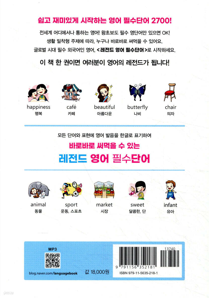 1. 영어 필수 어휘 약 2,700개! 왕초보부터 초·중급 수준의 영어 학습자를 위한 필수 어휘집으로, 일상생활에서 꼭 필요한 대표적인 주제 24개를 선정하였고, 추가로 9개의 주제를 포함하여 약 2,700개의 어휘를 담았습니다. 24개 주제별 어휘 학습 후 ‘꼭 써먹는 실전 회화’의 짧고 재미있는 상황을 통해 회화에서 실제로 어떻게 응용되는지 확인해 보세 요. 그리고 각 챕터의 마지막에는 간단한 ‘연습 문제’가 있어 테스트도 할 수 있습니다. 2. 눈에 쏙 들어오는 그림으로 기본 어휘 다지기! 1,000여 컷 이상의 일러스트와 함께 기본 어휘를 쉽게 익힐 수 있습니다. 재미있고 생생한 그림과 함께 학습하는 기본 어휘는 기억이 오래 남습니다. 3. 바로 찾아 즉시 말할 수 있는 한글 발음 표기! 기초가 부족한 초보 학습자가 영어를 읽을 수 있는 가장 쉬운 방법은 바로 한글로 발음을 표기하는 것입니다. 영어 발음이 우리말과 일대일로 대응하지 않지만, 여러분의 학습에 편의를 드리고자 미국에서 사용하는 표준 발음과 최대한 가깝게 한글로 표기하였습니다. 초보자도 자신 있게 말할 수 있습니다. 4. 말하기 집중 훈련 MP3! 이 책에는 영어 알파벳부터 기본 단어, 기타 추가 단어까지 원어민의 정확한 발음으로 녹음한 파일이 들어 있습니다. MP3 영어만으로 구성된 ‘영어’ E 버전과 영어와 한국어를 이어서 들을 수 있는 ‘영어+한국어’ K 버전, 두 가지 파일을 제공합니다. 학습자 수준과 원하는 구성에 따라 파일을 선택하여, 자주 듣고 큰 소리로 따라 하며 학습 효과를 높여 보세요. 쉽고 재미있게 시작하는 영어 필수 단어 영어는 세계 어디에서나 통하는 언어로서, 필수 외국어입니다. 꼭 배워야 하는 언어라고 강조하는 자체가 군더더기죠! 요즘은 옹알이하는 어린아이 때부터 영어 교육을 시작하며, 그 열풍은 시간이 가도 식을 줄 모릅니다. 그렇게 열심히 시간과 노력, 비용을 투자하는데, 많은 사람들은 여전히 영어가 어렵다고 말합니다. 외국어 학습을 좋아하는 한 사람으로서, 왜 그럴까 생각해보니 아마 공부와 실생활에서 쓰는 영어가 달랐기 때문이 아닐까 싶습니다. 언어란, 학문이 아니라 생활에 필요한 실용적인 도구입니다. 그런 도구를 학문처럼 공부했으니, ‘아, 영어 공부 많이 한 것 같은데, 외국인 앞에만 서면 한없이 작아지는구나!’라며 탄식할 수밖에 없었던 것이 아닐까요? 그럼 이제 ‘나도 영어 잘하고 싶다’고 마음먹은 여러분! 늘 작심삼일로 처음 시작만 공부했던 책이 책꽂이에 가득 있는 여러분! 이번에는 내 입에서 영어가 자연스럽게 나올 수 있도록 해 보자 결단하고, 본 책을 통해 실천에 옮기기를 바랍니다. 본 책은 상황에 따라 적재적소에 쓸 수 있는 다양한 주제별 단어를 익히고, 예문을 살펴보며 내 실력으로 만들 수 있도록 구성되어 있습니다. 이 모든 것은 수준이 어려운 것보다는 꼭 필요한 것들로만 엄선했기에, 부담 없이 학습을 시작할 수 있습니다. 뭔가 거창한 시작보다는 작지만 꾸준한 발걸음으로 나아가세요! 그렇다면 영어에 자신 있는 내 모습이 곧 현실로 다가올 것입니다. |