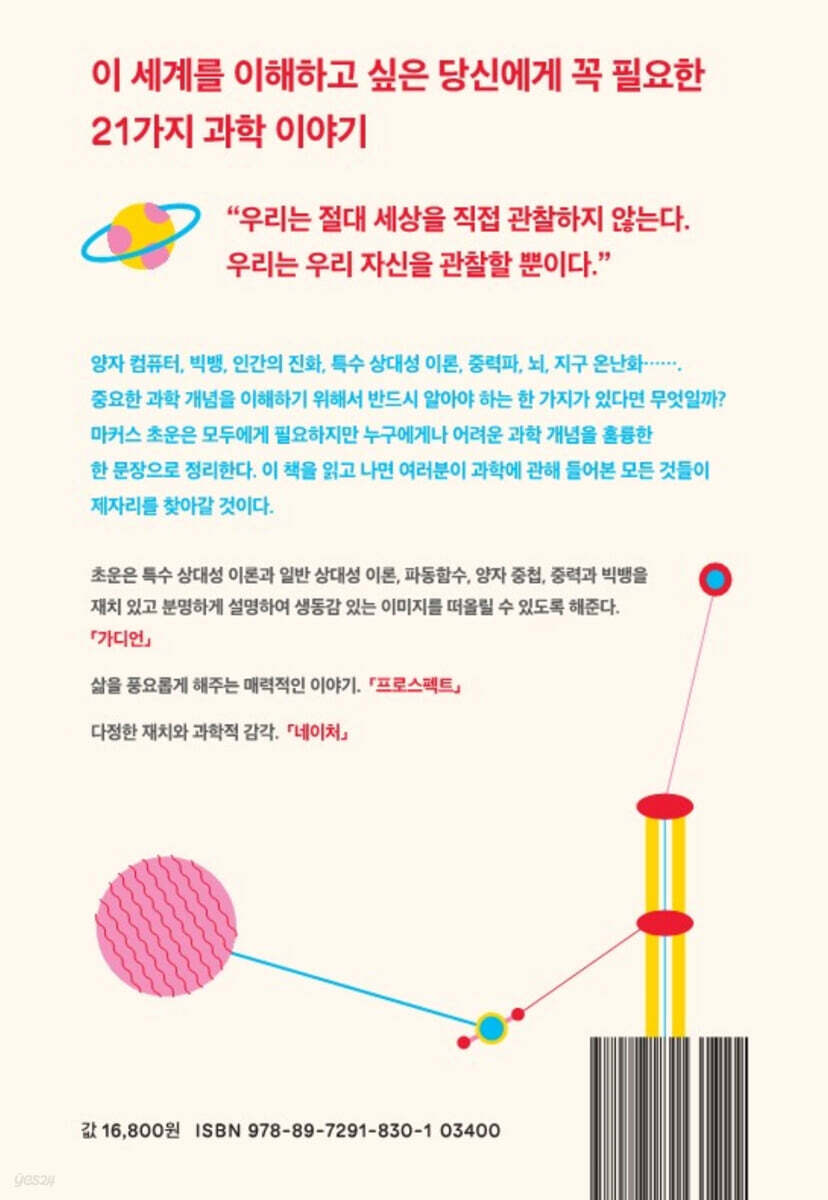 1 중력 모든 물체는 다른 모든 물체를 끌어당긴다 2 전기 우리는 중력보다 1만의 10억 배의 10억 배의 10억 배의 10억 배나 더 강한 힘을 이용해서 세상을 움직인다 3 지구 온난화 이산화탄소와 같은 분자가 지표면에서 방출되는 빛을 흡수해서 열을 대기 중에 가둔다 4 태양이 뜨거운 이유 태양에는 많은 물질이 있다 5 열역학 제2법칙 사물을 정돈하는 방법보다 무질서하게 만드는 방법이 훨씬 더 많아서, 확률이 모두 같다면 질서는 점진적으로 무질서로 변한다 6 판 구조론 지구의 지각은 마치 갈라진 포장도로처럼 부서져 솟아오르는 마그마에 따라 서로 부딪친다 7 양자 이론 입자는 파동처럼 행동할 수 있고, 파동은 입자처럼 행동할 수 있다 8 원자 원자는 자연의 알파벳이어서, 배열을 달리하면 장미나 은하 그리고 신생아도 만들 수 있다 9 진화론 식량 자원이 제한될 때 어떤 유기체가 경쟁에서 성공적으로 살아남아 후손을 남기도록 해주는 특성은 다음 세대에서 더 흔하게 나타난다 10 특수 상대성 이론 빛은 따라잡을 수 없다 11 뇌 뇌의 가장 중요한 활동은 뇌 자체의 변화를 만들어내는 것이다 12 일반 상대성 이론 중력은 가속이다 13 인간의 진화 현 인류와 그들의 조상의 특징을 말해주는 세 단어는 이주, 이주, 이주이다 14 블랙홀 시공간에 충분한 질량이 밀집되면 빛을 포함한 어떤 것도 빠져나갈 수 없는 무한히 깊은 구덩이가 등장한다 15 표준모형 세계의 복잡성은 세 가지의 기본 힘으로 결합된 세 종류의 기본 구성 요소들의 배열로 탄생한다 16 양자 컴퓨터 양자 컴퓨터는 평행 우주에 존재하는 스스로의 복사본을 활용하거나 정말 그렇게 하는 것처럼 행동한다 17 중력파 중력파는 시공간에서 울리는 북의 진동이고, 공간의 목소리이다 18 힉스장 물질의 기본적인 구성 요소는 고유한 질량을 가지지 않고, 힉스장과의 상호작용을 통해서 질량을 얻는다 19 반물질 전하가 없는 광자가 전자로 바뀌면 그 전자의 전하는 정반대의 전하를 가진 반입자에 의해서 상쇄되어야 한다 20 중성미자 물질 세계에서 중성미자는 거의 존재감이 없는 유령 같은 입자이지만, 우주 전체에서는 두 번째로 흔한 입자이다 21 빅뱅 우주는 뜨겁고 밀도가 높은 상태에서 시작되었고, 그후에는 팽창과 냉각을 계속하고 있다 감사의 말 용어 해설 주 역자 후기 인명 색인 |