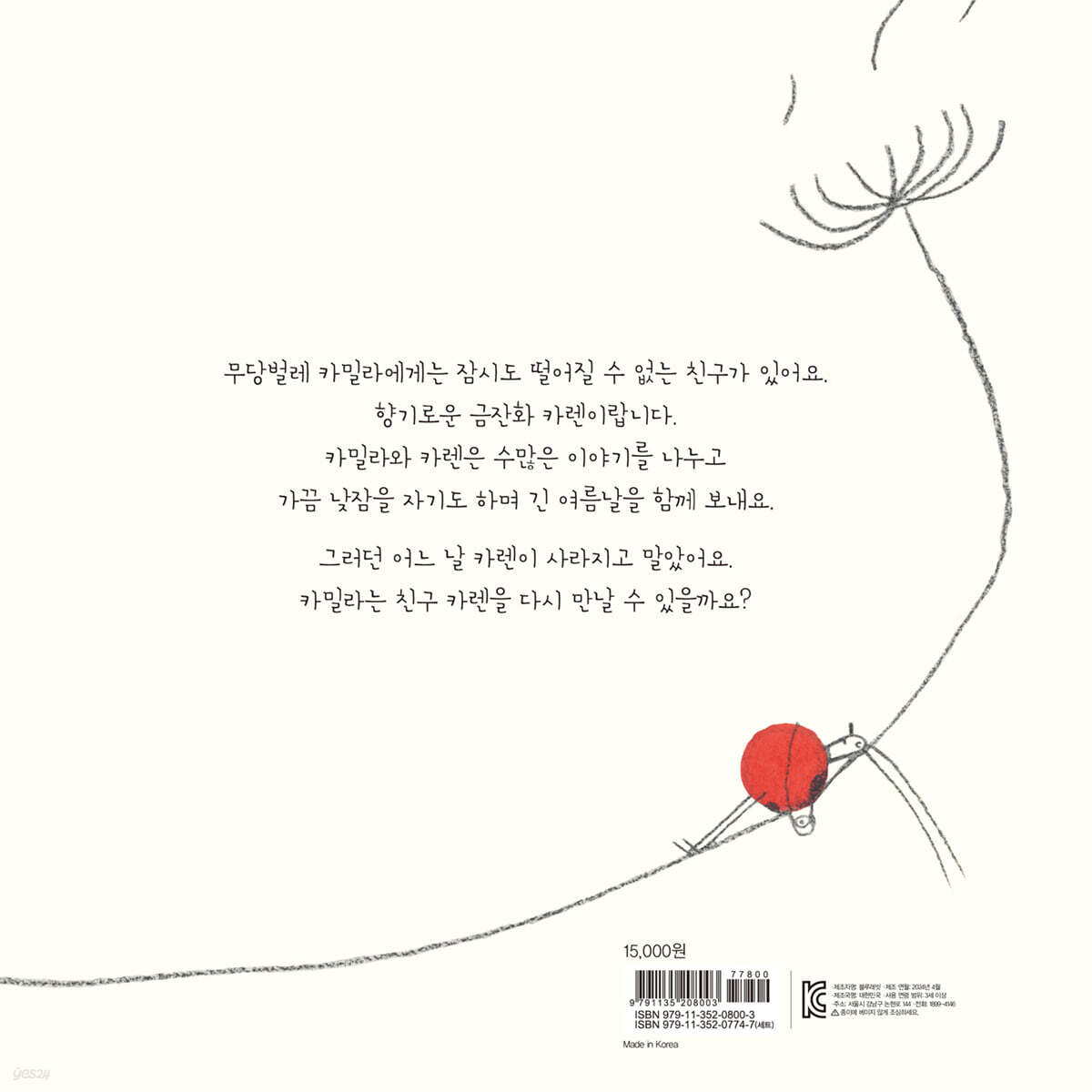 2017 말레르바상 그림책 부문 수상 작가 마르코 스칼치오네가 서정적으로 그려 낸 두 친구의 아름다운 우정 이야기. 계절의 흐름을 소재로 하여 우정의 깊은 가치를 일깨워 준답니다. 금잔화 카렌이 갑자기 사라진 이유, 그리고 두 친구가 다시 만나게 되는 극적인 전개의 바탕에는 계절이 흐르고 있지요. 곳곳에 숨어 있는 자연의 법칙을 발견하며 읽다 보면 이야기가 더욱더 흥미로울 거예요. 꿈과 행복을 파는 토끼책방에 친구들을 초대합니다! 토끼책방은 처음 그림책을 만나는 아이들도 책에 재미를 느끼고 차근차근 책 읽는 습관을 들여 책을 사랑하는 아이로 성장할 수 있도록 세계 각국에서 엄선한 창작 그림책 컬렉션을 선보입니다. 베스트셀러 작가의 신간에서부터 세계 유명 도서전에 전시된 아트북까지, 아이들의 상상력과 호기심을 깨우는 재밌는 이야기와 미적 감수성을 키우는 아름다운 그림을 만나 보세요. |