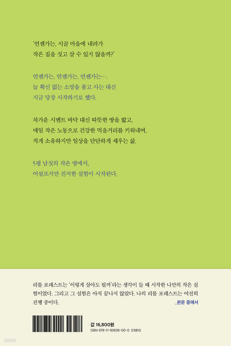 적게 소유하고, 직접 지어 먹으며, 가볍게 살아가기 버리지 않는 건강한 미니멀리즘으로 많은 독자들의 사랑을 받은 『어느 날 멀쩡하던 행거가 무너졌다』의 이혜림 작가가 이번에는 적게 소유하고, 직접 지어 먹으며, 풍만한 일상을 만들어가는 삶에 대한 에세이 『나만의 리틀 포레스트에 산다』로 돌아왔다. 오래전부터 시골 생활에 대한 꿈을 키워온 저자는 일종의 예행연습처럼, 도심 속에서 흙을 밟고 텃밭을 가꾸는 방법을 찾아 나섰다. 3년간 주말 농장을 꾸리며 도심 속 자급자족 실험을 시작했고, 그간의 이야기를 이 책에 담았다. 제철 채소를 심고, 직접 빵을 굽고, 요거트와 그래놀라를 만들어 먹는 삶. 손수 머리도 잘라보고 전기 없는 밤도 보내보며, 자신만의 방식으로 단순하지만 풍족한 생활의 기본을 세워간다. ‘언젠가는 시골 마을에 내려가 작은 집을 짓고 살 수 있지 않을까?’ 이런 확신 없는 소망을 품고 사는 대신 지금 당장 할 수 있는 일을 시도한다. 차가운 시멘트 바닥 대신 따뜻한 땅을 밟고, 매일 작은 노동으로 건강한 먹을거리를 키워내며, 적게 소유하지만 일상을 단단하게 세우는 삶. 5평 남짓한 작은 땅에서, 어설프지만 진지한 실험이 시작된다. “그냥 해보자, 실패해도 괜찮아.” 자립을 향한 끊임없는 실험과 시도의 기록 작은 텃밭 ‘리틀 포레스트’는 저자만의 작은 실험이었다. ‘이렇게 살아도 될까’, ‘이렇게 살아보고 싶어’라는 생각이 들 때 시작한 실험, 남들의 경험을 듣기보다는 직접 부딪치며 해나가는 실험. 끊임없는 시도로 가득 차 있는 『나만의 리틀 포레스트에 산다』에는 ‘실험, 연습, 배움’ 그리고 ‘직접, 손수, 스스로’라는 단어가 자주 등장한다. 시작은 영화 〈리틀 포레스트〉였다. 영화 속 혜원처럼 시골에서 손수 먹을거리를 키워 먹는 삶을 동경했다. 그래서 주말 농장을 시작했다. 한 번도 해본 적 없었던 밭일을 시도하면서부터 일상에서 도전해보고 싶은 일도, 스스로 해낼 수 있는 일도 조금씩 늘어났다. 손수 해보는 모든 일은 무척이나 어설펐다. 그러나 외식하는 대신 집밥을 만들어 먹고, 돈 써서 하던 일들을 직접 해내면서부터 허리가 꼿꼿하게 펴지고 중심이 단단해지는 기분이 들었다. 지금 가진 것을 다 잃어도 다시 시작할 수 있을 것 같은 자신감, 아무것도 없는 땅에서도 살아낼 수 있을 것 같은 용기를 얻었다. 서툴지만 자립하고 싶다는 마음은 비로소 나 자신을 먹여 살릴 수 있다는 감각에 가 닿았다. 텃밭을 경작해서 필요로 하는 것들을 스스로 가꿔 먹을 수 있게 되었듯, 저자는 앞으로 삶에 필요한 게 생길 때마다 몸소 배워 익히며 살아가겠다는 의지를 보여준다. 리틀 포레스트는 여전히 진행 중이다. “마음이 울적한 날엔, 나만의 작은 숲으로!” 작은 숲에서 받은 치유, 작고 단단한 삶을 향한 걸음 마음이 복잡하고 울적한 날엔 나만의 작은 숲으로 향한다. 저자는 그곳에서 계절과 삶의 리듬을 되찾았다. ‘리틀 포레스트’를 만나기 전까지, 매번 시간에 쫓기듯 살며 식사를 대충 때우기 일쑤였다. 일 때문에 바쁘고 정신이 없으니 어쩔 수 없이 일상을 놓아버릴 수밖에 없다고 생각했다. 하루하루가 불안정하다고 느꼈고, 무엇을 해도 제대로 하는 기분이 들지 않았다. 늘 뭔가를 더 해야만 할 것 같아 불안했다. 식사를 대하는 태도가 곧 삶을 대하는 자세임을 깨달은 것은 ‘리틀 포레스트’를 만난 뒤였다. 텃밭에서 작물을 길러 식사를 정성껏 챙겨 먹기 시작하면서, 몸은 물론 일상을 보내는 방식 또한 변하기 시작했다. 하나를 먹더라도 제대로 먹고, 하나를 하더라도 제대로 하는 삶을 살게 된 것이다. 그 시간을 몸소 겪어내며, 빠르게 성취하는 것 혹은 바른 모양을 갖는 것만이 정답이 아님을 깨달았다. 하고 싶었던 일은 지금 해보자고, 실패해도 괜찮다고, 뭐든 최고로 잘 해낼 필요는 없다고, 작은 숲이 그에게 일러주었다. 듣고 싶었던 말을 아무렇지 않게 해주는 친구처럼, 이번엔 저자가 독자에게 속삭인다. “그냥 해보자, 실패해도 괜찮아.” 나만의 작은 숲에서 받은 치유의 이야기, 조화롭고 자연스러운 삶, 작고 단단한 삶을 향해 나아가는 이야기가 여기에 있다. 리틀 포레스트, 이제 이곳은 당신의 안식처다. |