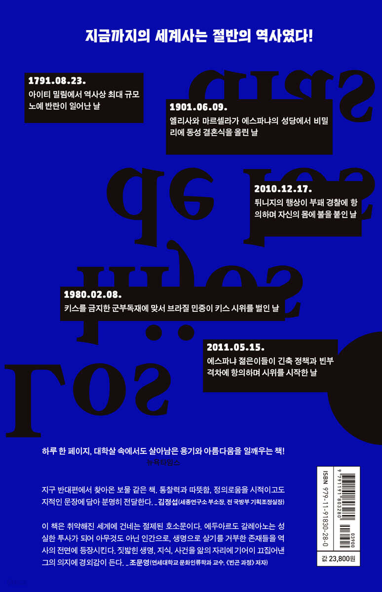 오스카르 리녜이라는 아르헨티나에서 사라진 수천 명의 청년 중 한 명이다. 그는 군사 용어로 ‘이송’되었다. 같은 수용소에 갇혀 있던 피에로 디 몬테는 그가 남긴 마지막 말을 들었다. “너에게 이야기하고 싶은 것이 있어. 그거 알아? 나는 아직 사랑을 해본 적이 없어. 사랑 한번 못 해봤는데 저들은 나를 곧 죽일 거야.” --- p.183 8월 29일 사랑하는 백인 형제여 나는 태어났을 때도 흑인이었소 자랄 때도 흑인이었고, 태양이 나를 바라볼 때도 흑인이었소. 아플 때도 흑인이었고, 죽을 때도 흑인일 것이오. 그런데 당신은 어땠소. 당신이 태어날 때는 장밋빛이었다가 자랄 때는 백인이었소. 태양이 비칠 때는 붉은색이었다가 추위를 느끼면 파란색이 되었소. 두려울 때는 푸른색이 되었고 아플 때는 노란 색이 되었소. 죽을 때는 회색이 될 거요. 그렇다면 우리 중 누가 진짜 유색인종이오? --- p.260 9월 2일 1939년 히틀러는 폴란드가 도이칠란트를 침공할 거라는 이유를 들어 폴란드를 공격했다. 150만 명의 도이칠란트군이 폴란드 땅에 피를 뿌렸다. 비행기는 폭탄을 비처럼 쏟아부었고, 히틀러는 ‘예방 전쟁’이라는 자신의 독트린을 발표했다.치료보다는 예방이 나으며, 남이 나를 죽이기 전에 내가 먼저 죽이는 것이 낫다는 것이었다. 히틀러는 학교라도 만든 걸까. 그때부터 다른 나라를 집어삼키려는 국가들이 ‘예방 전쟁’이란 개념을 사용하고 있으니 말이다. --- p.265 10월 18일 1929년 오늘, 캐나다의 법은 여자도 사람이란 사실을 처음으로 인정했다. 물론 여성들은 자신이 사람이라고 생각했지만, 법은 그렇지 못했다. ‘법적인 정의엔 여성이 포함되지 않는다’라는 대법원의 판결이 있었다. 이에 에밀리 머피, 넬리 맥클렁, 아이린 팔비, 헨리에타 에드워즈, 루이스 맥키니 등은 차를 마시며 모의했다. 그녀들은 대법원을 굴복시켰다. --- p.313 12월 17일 2010년 오늘 아침 무함마드 부아지지는 여느 날과 마찬가지로 과일과 채소를 실은 수레를 끌고 튀니스 어디론가 가고 있었다. 다른 날과 마찬가지로 경찰이 와서 어처구니없는 죄목을 지어내 벌금을 징수했다. 그러나 그날 아침 무함마드는 벌금을 내지 않았다. 경찰은 그를 폭행했고, 수레를 뒤집고 땅에 흩어진 과일과 채소를 짓밟았다. 그러자 무함마드는 자신의 머리에서 발끝까지 석유를 붓고 불을 붙였다. 노점상보다 작았던 그 작은 불꽃은 며칠 만에 전체 아랍 세계에 퍼졌다. 더는 아무것도 아닌 인간으로 살고 싶지 않았던 사람들의 마음에 불을 댕긴 것이다. --- p.376 |