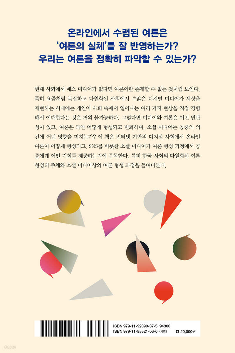 ‘공중’은 누구인가│여론은 무엇으로 구성되는가│여론에 영향을 미치는 요인 2장 여론 지도자는 누구인가 여론 지도자의 속성과 대인 커뮤니케이션 효과│여론 지도자로서 대통령은 어떻게 영향을 미치는가│온라인 여론 지도자는 누구인가│여론을 형성하는 사회 세력은 무엇인가 3장 언론은 여론을 어떻게 형성하고 틀 짓는가 매스 미디어는 여론 형성에 어떻게 작용하는가│공중은 여론 형성에 어떻게 참여하는가│매스 미디어는 정책 여론에 영향을 미친다 4장 온라인 여론은 어떻게 형성되는가 온라인 여론과 SNS 공론장은 어떻게 만들어지는가│SNS는 온라인 여론을 정확히 반영하는가│공중은 온라인 여론에 어떻게 참여하는가│소셜 미디어가 촉발한 온라인 불매 운동 여론│소셜 미디어에서 이슈는 어떻게 확산되는가 5장 SNS는 선거 여론을 어떻게 움직이는가 SNS는 선거 캠페인에서 어떻게 활용되었나│정치인은 SNS를 어떻게 이용하는가│SNS와 선거 결과│소셜 미디어는 공론장이 될 수 있을까 6장 여론을 정확히 파악하는 것은 가능한가 소셜 미디어는 온라인 여론에 어떤 문제를 초래하였나│여론의 허상│여론 조사는 ‘진짜 민심’을 반영하는가│공천 과정과 여론 조사│여론 조사와 여론 조사 보도의 한계를 극복하려면│진정한 여론 형성 주체로서의 공중을 위하여 부록 1│여론 조사 방법 부록 2│소셜 미디어를 활용한 여론 조사 방법 참고 문헌 찾아보기 |