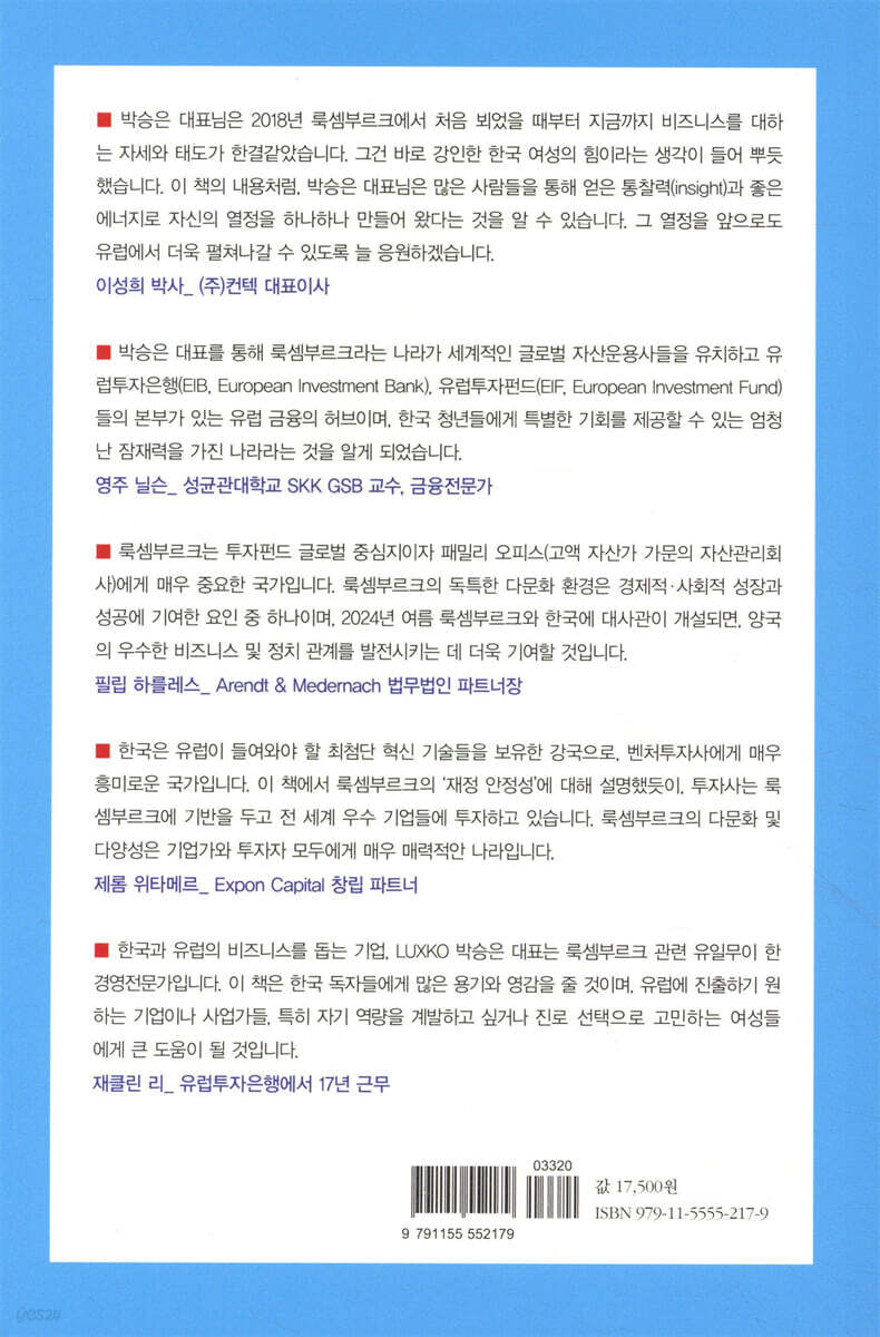 2007년 룩셈부르크에 있는 유럽투자은행(EIB)에 근무할 때 처음 만난 활기차고 호기심 넘치던 박승은 씨는 당시 룩셈부르크 한국 첫 여성 기업 대표였습니다. 그 후 몇 년간 경력 단절이 있었지만, 그녀는 한국과 유럽의 비즈니스를 돕는 기업, LUXKO를 창업했습니다. 그 후 많은 어려움을 극복하고, 이제는 룩셈부르크 관련 유일무이한 경영전문가로 변신했습니다. 이 책은 한국 독자들에게 많은 용기와 영감을 줄 것을 확신하며, 또한 유럽에 진출하길 원하는 기업이나 사업가들, 특히 자기 역량을 계발하고 싶어하는, 혹은 진로 선택의 갈림길에서 고민하는 여성들에게 큰 도움이 될 것입니다. - 재클린 리 (유럽투자은행에서 17년 근무)