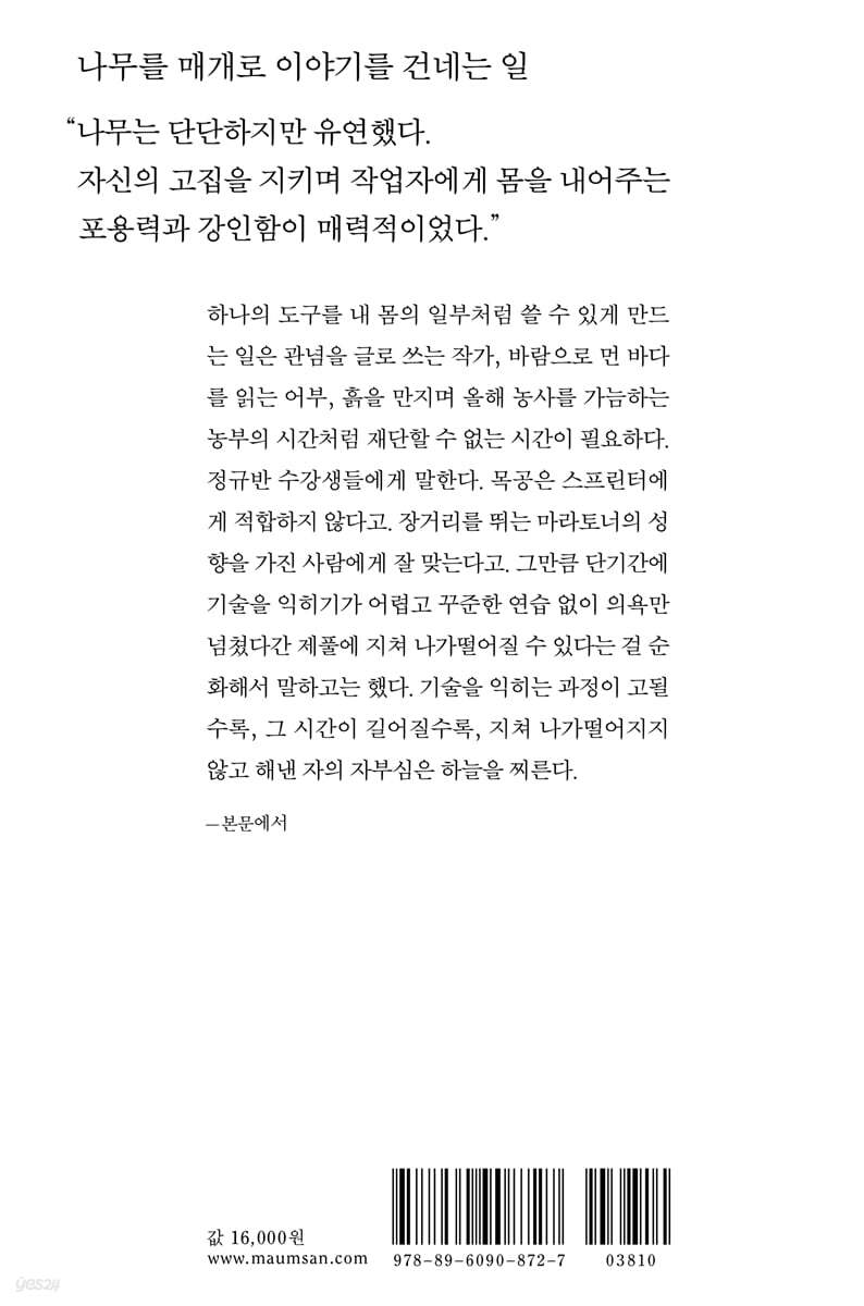 --- pp.23~24 작업자로서의 고민이 깊어지면서 내면은 진작부터 다른 것과 사투하고 있었다. 해를 거듭할수록 더욱 또렷하게 들리는 목소리에 달달 볶이고 있었는데, 주문받은 가구를 제작하고 교육을 하는 행위를 통해 현상 유지(공방을 운영하고 먹고살기)를 위한 수단에 머물고 있음을, 작업실을 차린 궁극적인 목적에 대해서는 손 한 뼘만큼도 정진하지 못했음을 스스로에게 고백하는 목소리였다. --- p.42 너무 쉽게 경계를 풀었나, 젊어서 만만한가, 내가 예민했나, 그의 진심을 곡해했나, 이 지역 목공하는 사람들 다 이런가, 내가 여자라 만만한가. 거를 틈도 없이 거친 생각들이 봇물 터지듯 솟아났다. 하지만 내가 더 늙고 그가 젊었어도, 내가 남자고 그가 여자였어도, 그와 나의 공통점이 목공이 아니었어도 이 감정은 달라지지 않았을 것이다. --- p.50 작업실을 연 이래 가장 충만한 시간이 찾아왔다. 목표했던 학비와 생활비를 모으자마자 요란스럽던 작업실 문을 닫았다. 가구 주문 제작을 받지 않고 신규 수강생도 모집하지 않았다. 기존 수강생들이 오는 시간을 제외하고는 계속 나무를 깎았다. 예정된 수순이었고 마음은 다소 차분했다. --- pp.87~88 사물을 만드는 즐거움은 노력한 만큼 대가를 얻는 데 있었다. 정성과 시간만 들여 직접 빚어낸 사물들은 언제든 주변에 머물며 즐거움을 주었다. 이 즐거움은 물질에서 오는 만족감만을 뜻하지는 않는다. 원하는 사물을 내 손으로 만들 수 있다는 건 생각을 글로 정리하고, 그림으로 세상을 재해석하고, 타인의 감정에 공감하는 능력처럼 삶을 살아가는 데 긍정적인 힘을 불어넣었다. 비유하자면 온라인게임에서 스킬 업 아이템을 장착하는 셈이다. --- p.121 집도 사는 사람을 닮듯이 작업실은 작업자를 닮는다. (…) 작업실은 제작자의 모습, 가치관, 작업 습관, 작은 행동 하나하나가 응축된 과거의 공간이며 미래로 나아가는 공간이다. --- p.202 기술을 익히는 과정이 고될수록, 그 시간이 길어질수록, 지쳐 나가떨어지지 않고 해낸 자의 자부심은 하늘을 찌른다. 특히 목수의 자부심이 그렇다. 애석하게도 부단한 노력 끝에 체득한 기술은 목수의 기본 소양일 뿐 자랑거리는 아니다. 나무라는 재료를 가지고 일상의 사물을 만들기 위해 갖춰야 하는 능력이지 그 자체가 최종 목적이 아니기 때문이다. --- pp.205~206 |
