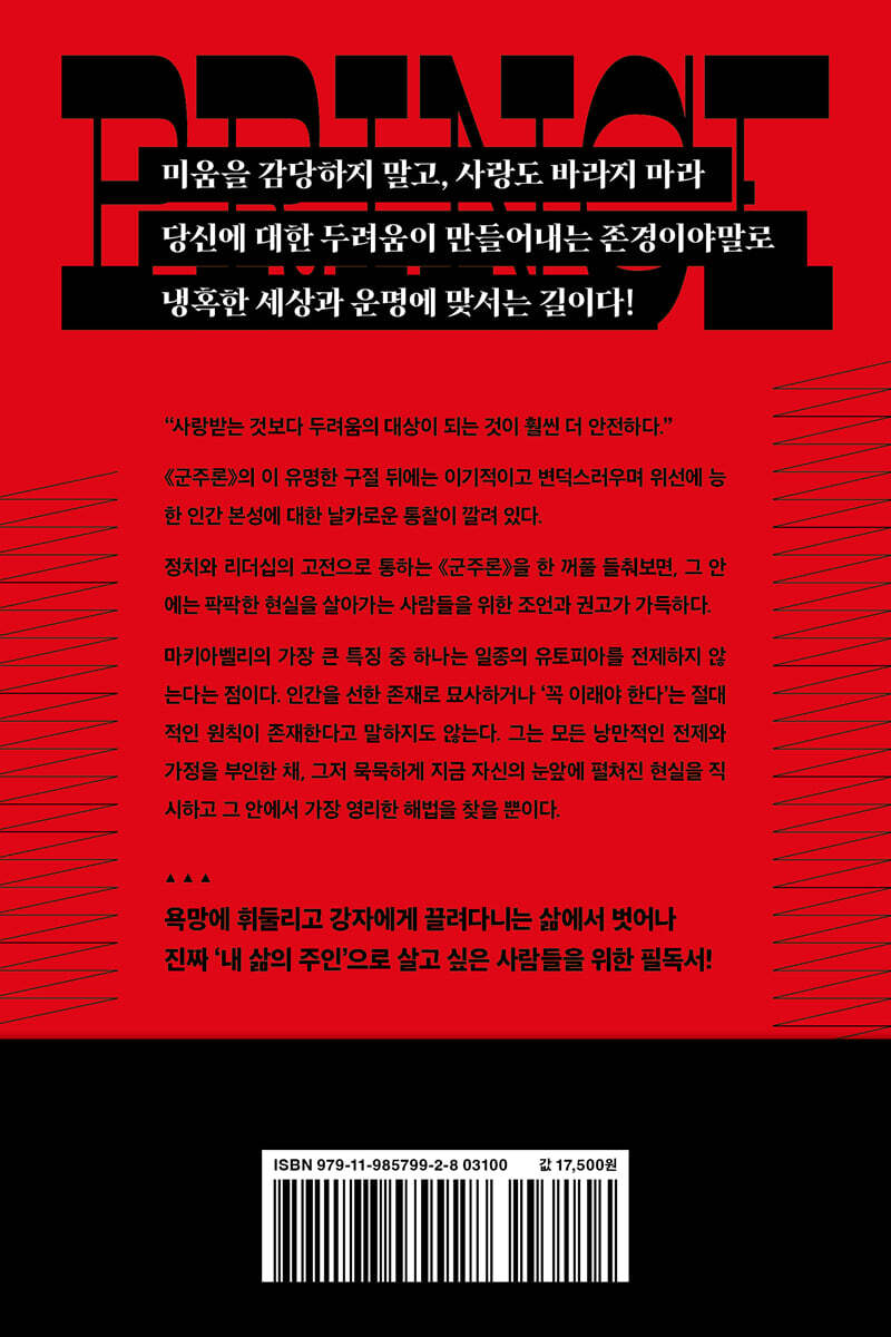 ‘타임’ ‘뉴스위크’ 선정 세계 100대 도서! 역사상 가장 논쟁적인 책 《군주론》에서 길어올린 매운맛 인생 조언 《군주론》은 16세기 이탈리아의 외교관이자 정치 이론가인 니콜로 마키아벨리가 신생 군주를 위한 지침서로 쓴 일종의 논문이다. 군주가 어떻게 하면 권력을 쟁취하고 오래도록 유지할 수 있는지를 통찰한 정치와 리더십의 고전인 동시에, 역사상 수많은 권력자들의 흥망성쇠와 인간 군상에 대한 날카로운 분석이 담긴 인문학 책이기도 하다. 이러한 《군주론》이 유독 화제인 것은, 절대 읽어서는 안 될 ‘악마의 책’이라는 평가와 세계 유수 언론과 명문대 등이 선정한 필독서라는 상반된 평가를 동시에 받기 때문이다. ‘목적이 수단을 정당화한다’는 마키아벨리의 정치철학이나 ‘인간은 본래 이기적이고 탐욕적인 존재’라는 시선, ‘교활한 여우처럼 위장과 속임수에 능하라’는 조언, 반종교적 행동 등은 당시 윤리에 반하는 위험한 생각처럼 보였다. 실제로 로마 교황청은 《군주론》을 금서로 지정했고, 권모술수나 기회주의 등을 일컫는 말로 ‘마키아벨리즘’이라는 용어가 생겼을 정도이니, 주류 사회의 비난이 어느 정도였는지 짐작할 만하다. 하지만 이런 인식들에는 커다란 오해와 편견이 작용했다고 할 수 있다. 사실 마키아벨리는 시민의 자유와 공동체의 이익을 중요하게 생각하는 공화주의에 대한 강렬한 꿈을 키워 왔고, 《군주론》에서 군주는 대중의 지지를 통해 자신의 세력을 넓혀야 하고 동시에 포퓰리즘을 경계해야 한다는 등 오늘날 이상적인 민주주의자의 모습을 보여주기도 했다. 그럼에도 권력의 냉정한 역학관계, 팍팍한 현실과 인간의 어두운 면모 등 곧잘 불편한 진실을 드러내는 마키아벨리의 언어는 논란을 일으키기에 충분했다. 그래서 《군주론》은 누가 어떤 의도로 읽느냐에 따라 매우 다르게 읽히는 책이다. 권력자들의 교본인 동시에 강자가 되기 위한 약자의 전략서 이 책 《사랑받기보다 차라리 두려운 존재가 되라》는 군주론의 핵심 메시지 가운데 하나인 ‘주어진 운명을 돌파하는 법’에 초점을 맞추었다. 저자는 마키아벨리가 《군주론》의 독자로 상정한 메디치가의 신생 군주 ‘로렌초 2세’와 오늘날 이 책을 읽을 독자들이 처한 현실에서 공통점을 찾았다. 로렌초 2세는 권력이라는 신세계 앞에서 햇병아리이자 초심자에 불과했다. 거기다가 주변의 경쟁 국가들이 호시탐탐 침략의 기회를 엿보았고, 이미 기득권을 장악하고 있던 교황과 귀족들은 어린 군주 따위야 언제든 좌지우지할 수도 있었다. 자신에 대한 지지 세력도 미미하고 권력을 능숙하게 다뤄본 경험도 없던 신생 군주의 마음은 잔뜩 움츠러들 수밖에 없었다. 어떻게 보면 이 세상에서 확고한 배경과 기반 없이 고군분투하는 우리들과 비슷한 입장이다. 이미 앞서간 경쟁자들이 수두룩하고, 성공한 자들은 자신의 기득권을 그리 쉽게 내어줄 태세가 아니다. 미래에 대한 비전과 희망도 막막한 상태이다. 마키아벨리의 《군주론》이 혼란했던 국내외 정세 속에서 이제 막 권력을 잡으려는 신생 군주를 위한 지침서였다면, 지금의 이 책은 냉혹한 현실 사회와 주어진 운명에 맞서 원하는 것을 얻기 위해 고군분투하는 모두를 위한 책이다. 마키아벨리는 고루한 꼰대가 가질 법한 낡고 구시대적인 관점에 머물지 않았다. 인간 본성에 대한 냉정한 직시, 사람을 움직이고 내 편으로 만드는 기술, 임기응변과 융통성의 중요성, 운명과 인간의 대결에서 인간이 승기를 잡기 위한 무기는 무엇인지 등, 순진한 믿음과 바람을 배제한 상태에서 현실적으로 무엇이 가장 현명하고 강한 전략인지를 탐구해 나갔다. 이 책 제목의 배경이 된 《군주론》의 유명한 구절, “사랑받는 것보다 두려움의 대상이 되는 것이 훨씬 더 안전하다”는 말 또한 가혹한 운명 앞에 강자가 되기 위한 약자의 전략을 담고 있다. 다만 이 때의 ‘두려움’은 오늘날 ‘존경’의 의미로 해석하는 것이 옳다. 누군가를 무력으로 제압하는 두려움이 아니라, 주변의 잡음을 차단하고 자신을 잘 통제하며 실력을 키우는 철저한 자기관리에 가깝다. 이러한 사람이라면 누군가에게 속거나 휘둘리지 않을 수 있고, 자신에 대한 미움을 감당할 필요도 없으며, 사랑받길 갈망할 필요도 없다. 정치와 비즈니스, 그리고 일상에 필요한 시대를 초월한 지혜 인간 행동에 대한 마키아벨리의 예리한 분석과 변화하는 상황에 대한 적응력의 강조는 특히 빠르게 진화하는 오늘날에 더욱 빛을 발한다. 500여 년 전에 쓰인 이 책은 시대를 초월한 통찰력으로 오늘날 정치, 비즈니스, 그리고 일상의 영역에서 협상, 의사결정, 영향력 등에 관한 귀중한 무기를 제공할 것이다. 책의 1부 ‘상식의 뒤편에서 찾아낸 삶의 새로운 무기’는 《군주론》의 대표적인 세계관 ‘포르투나(Fortuna)’와 ‘비르투(Virtu)’의 대결에서 출발한다. 다른 말로, ‘인간의 힘으로는 어쩔 도리가 없는 운명’ vs. ‘자기 자신의 역량으로 고군분투하는 개인’ 간의 대결이다. 이 싸움에서 이기려면 기존의 상식과 관행을 뛰어넘는 새로운 무기가 필요하다. 마키아벨리가 