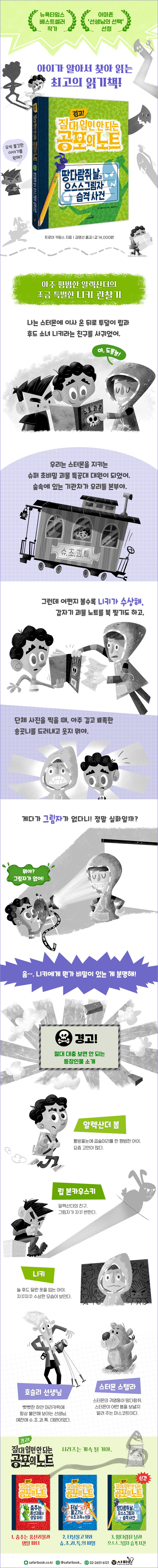 알렉산더가 우연히 발견한 〈공포의 노트〉에는 상상력 넘치는 온갖 무시무시한 괴물들로 가득하다. 각각의 괴물들을 그려 놓은 그림과 함께 서식지, 먹이, 특징 그리고 물리치는 방법 등이 적혀 있어 무서워하거나 당황하지만 않는다면 거뜬히 괴물을 이겨 낼 수 있다. 이 시리즈는 공포의 노트에 있는 괴물들이 스터몬에 나타나 도시를 위험에 빠뜨리지만 아이들의 힘으로 물리치는 이야기여서 그야말로 통쾌하다. 어린이 독자들이 이 시리즈를 좋아할 뿐 아니라 자발적으로 계속 읽게 되는 이유 중 하나도 아이들 스스로의 힘으로 괴물을 물리치고 세상을 구하기 때문이다. 그리고 무서운 괴물 이야기지만, 어찌 보면 귀여울 수도 있고 물리칠 방법도 있다 보니 지나치게 공포스럽지 않아 저학년 아이들이 읽기에 자극적이거나 해롭지 않다. 무엇보다 이 시리즈는 책을 읽고 나서 스스로 독후 활동까지 한다는 점에서 더욱 만족감이 커진다. ‘나만의 공포의 노트’를 만들거나 친구들 혹은 가족과 괴물 퇴치 모임을 만들고 회원 카드를 만드는 모습도 목격하게 될 것이다. 독서 습관을 키워 주고 싶다면, 제대로 된 문장력과 문해력, 문제 해결력을 키워 주고 싶다면 만화보다 〈공포의 노트〉 시리즈를 권한다. 늘 함께하는 그림자가 갑자기 괴물로 변한다면? 알렉산더는 아빠와 함께 간 옷가게 탈의실에서 느껴지는 오싹한 기운에 얼어붙고 만다. 알 수 없는 그림자가 거울 속에서 뱀처럼 꿈틀대더니 당장이라도 덮칠 듯이 스르르 움직였기 때문이다. 알렉산더가 깜짝 놀라 탈의실에서 뛰쳐나온 사이 으스스한 그림자 뱀은 감쪽같이 사라져 버린다. 그 뒤로도 학교에서 망치 모양 그림자가 립의 그림자를 내려쳐 불쑥 뿔이 솟아나고, 아빠의 그림자가 티라노사우루스 모양으로 변한 것을 보게 되자 알렉산더는 이 모든 일들이 괴물 때문이라고 확신한다. 그러다 알렉산더는 뜻밖의 곳에서 괴물의 존재를 다시 만난다. 반 단체 사진 속에 그림자 괴물들이 찍힌 것이다. 이 그림자 괴물들의 정체는 무엇이고, 대체 왜 나타난 걸까? 〈경고! 절대 열면 안 되는 공포의 노트〉 시리즈의 세 번째 이야기 《땅다람쥐 날과 으스스그림자 습격 사건》에서는 그림자 괴물이 등장한다. 언제나 발밑에 있어서 가끔은 잊고 지내는 내 그림자가 갑자기 나와 다른 모습이 되거나 내 뜻대로 움직이길 거부하고 멋대로 움직인다면 어떨까? 혹은 어느 날 갑자기 괴물이 되어 나를 해치려 들거나 멋대로 꿈틀거리거나 다른 모양이 되고 덩치를 키운다면 그야말로 소름 끼칠 것이다. 이번 이야기는 그림자 괴물과 그림자가 없는 친구를 통해 자신이 가진 당연한 것에 대해 생각해 보게 될 것이다. 차이를 인정하고 우정 지키기 알렉산더는 비밀 조직 ‘슈.초.괴.특.’의 특공대원으로 함께 활동하게 된 립과 니키를 무척 의지하고 신뢰한다. 그런데 어느 날, 니키에게서 몇 가지 수상한 점을 발견하게 되는데…. 수상한 점 하나, 갑자기 괴물 노트의 한 쪽을 확 찢더니 화를 낸다. 수상한 점 둘, 단체 사진을 찍을 때 절대 웃으려 하지 않는다. 수상한 점 셋, 송곳니가 이상할 정도로 길고 뾰족하다. 수상한 점 네 번째, 그림자가 없다. 수상한 점 다섯 번째, 빛이 있는 곳에서는 항상 후드를 뒤집어쓰고 있다. 볼수록 이상하다고 생각하던 찰나에 뜻밖에도 니키가 먼저 알렉산더와 립에게 자신의 정체를 밝힌다. 만약 친한 친구의 놀라운 비밀을 알게 된다면 나는 어떻게 할까? 생각했던 것과 전혀 다른 친구의 모습을 보거나 친구가 나에게 엄청난 사실을 숨기고 있었다는 걸 알게 된다면? 그런 경우 우정이 더 돈독해지기도 하지만, 대개 모래성처럼 순식간에 허물어져 버리는 경우가 많다. 친구의 비밀이 나에게 해를 주고 나쁜 것이 아니라면 친구를 있는 모습 그대로 받아들이고 인정해 주는 것이 진정한 친구이다. 친구가 용기 내어 고민을 이야기할 때 잘 들어 주고 인정해 주고 상처받지 않도록 배려하는 따뜻한 마음은 우정을 지켜 나가는 기본이다. 또한 내가 친구에게 그랬듯이 나도 친구에게서 같은 위로를 받을 수 있는 날이 올 수 있다. 그러나 친한 친구라 해도 문제가 되는 행동은 그냥 덮지 말고 서로에게 충고해 주고 받아들이는 태도도 꼭 필요하다. 알렉산더와 립은 니키의 정체를 알게 되자 상처를 주고 갈등도 겪게 된다. 하지만 비밀을 털어놓은 니키의 용기를 인정하고, 괴물로부터 스터몬을 지켜 내려는 진정성에 마음을 돌려 다시 친구로 받아들이게 된다. 세 친구의 갈등과 화해의 과정은 진정한 친구가 무엇인지 생각해 보는 기회가 될 것이다. 추천사 √ “괴상하면서도 우스꽝스러운 눈빛의 캐릭터들, 공포감을 극도로 높이는 뛰어난 전개 방식, 괴물들과의 전면전까지, 작가의 기획과 능력이 돋보이는 작품이다.” _[커커스 리뷰] √ “재치 넘치는 유머로 가득한 놀라운 책!” _[학교도서관저널] |