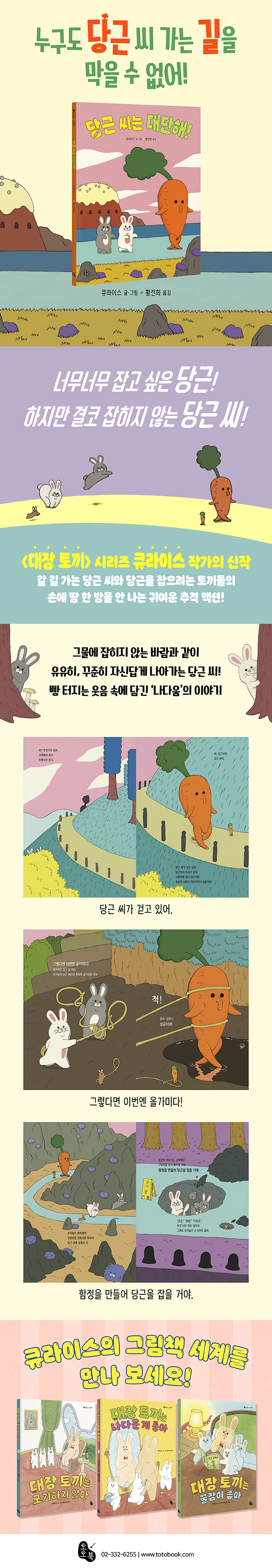 저쪽에서 무언가 다가옵니다. 아! 당근 씨예요. 당근 씨는 사람처럼 걷지요. 풍성한 이파리 머리카락을 휘날리면서요. 토끼들이 당근을 발견했습니다. 배에서 꼬르륵 소리가 나고 입에서 침이 흐릅니다. 당근은 너무 맛있으니까요! 토끼는 당근을 쫓습니다. 그런데 당근은 쫓기지 않습니다. 이야기는 이렇게 이상하게 흘러갑니다. 쫓고 쫓기는 이야기가 아닙니다. 잡고 잡히는 이야기도 아니지요. 그렇다고 맞서 싸우는 격렬한 투쟁의 이야기도 아닙니다. 어쩌면 투쟁 너머의 이야기이지요. 당근 씨가 자신만의 속도와 모양으로 유유히, 독특하게, 꾸준히 제 갈 길을 가는 이야기입니다. 《당근 씨는 대단해!》 속 당근 씨는 단단하고 잘생긴 다리를 가진 것도 아니고, 빠르고 힘차게 뛰는 것도 아닙니다. 부드럽게 휘어진 곁뿌리 같은 팔과 다리로 사부작사부작 한들한들 당근 걸음으로 걷습니다. 잡히기 쉬운 당근처럼 보입니다. 포기를 모르는 토끼들은 당근 씨를 잡으려고 올가미를 던지고, 함정을 파고, 덫을 놓습니다. 당근 씨는 어떻게 할까요? 올가미를 끊고, 함정을 기어오르고, 덫을 부수고 이겨낼까요? 토끼들을 잡아서 가두고 벌을 줄까요? 아니요, 그것은 당근 씨의 방법이 아닙니다. 당근 씨는 아주 독특하게 자신다운 방법으로 잡히지도 않고 멈추지도 않고 가려던 곳을 향해 나아갑니다. 숨 하나도 안 막히고, 손에 땀도 한 방울 생기지 않는 이 추격 액션 이야기는 웃음과 함께 이상하게도 뭉클한 감동을 줍니다. 당근 씨처럼 나를 얽어매는 것들에 붙잡히지 않고 자유롭게 나아가고 싶어집니다. 소리에 놀라지 않는 사자와 같이, 그물에 걸리지 않는 바람과 같이 《당근 씨는 대단해!》 속 토끼들은 당근을 먹고 싶어서 부지런히 쫓습니다. 하지만 당근 씨는 자신을 ‘맛있는 당근’이라는 대상이 된 채로 두지 않습니다. 당근 씨는 가고 싶은 곳이 있고, 자신만의 발걸음이 있습니다. 그래서 나를 붙잡는 것과 싸우지 않습니다. 자기 자신으로 사는 것에만 관심이 있습니다. 그래서 누구도 당근 씨를 막을 수 없습니다. 올가미를 던져 잡으면 스르륵스르륵 구부렁구부렁 주우욱주우욱 늘어나서 빠져나가고, 함정에 빠뜨리면 이파리 머리카락을 휭휭 돌려서 중력을 떨치고 날아가 버립니다. 그리고 아주아주 커다란 모자로 덮쳐서 잡으면……. 아, 그 감동적인 장면은 직접 그림으로 만날 수 있도록 말을 아끼겠습니다. 다만 당근 씨는 덫마저 자신의 일부로 만들어 버린다는 것만 살짝 알려드릴게요. 당근 씨는 마치 소리에 놀라지 않는 사자와 같이, 그물에 잡히지 않는 바람과 같이 나아갑니다. 자신을 잡았던 올가미도, 자신을 쫓아다니는 토끼도 돌아보지 않습니다. 올가미와 싸우지 않고 토끼들과 대적하지 않습니다. 당근 씨는 당근 걸음으로 한 발 다음 한 발, 그리고 또 한 발 걷습니다. 바람은 그물과 싸우지 않으니까요. 우리는 어쩌면 나를 붙드는 그물에 마음을 매어 두고 그물과 씨름하느라 나 자신을 그저 ‘맛있는 당근’으로 ‘그물에 걸린 당근’으로 두는 것이 아닐까요? 그물을 끊으려 애쓰다가 더 칭칭 감긴 채로 있는 것은 아닐까요? 그러다가 내가 자유로운 바람이었다는 것마저 잊은 것은 아닐까요? 아, 당근을 쫓는 토끼들 이야기를 하지 않을 수가 없습니다. 토끼들의 귀여운 추격은 ‘추격의 도’를 보여 줍니다. 함정을 판 토끼들은 함정 계획이 실패한 다음 함정을 다시 메웁니다. 다른 이들이 빠져서 다치면 안 되니까요. 그리고 휴식이 필요할 때는 카페 심포니에서 차를 마시며 한숨 돌리기도 하지요. 그뿐인가요? 자신의 취향을 살려서 그냥 모자가 아니라 아주아주 근사한 모자로 당근을 잡고 싶어 합니다. 이것 또한 이 책에서 주는 이상한 감동 중 하나입니다. 쫓더라도 내 식대로, 내 식대로 쫓느라 잡지 못한다 해도 그래도 역시 내 식대로 쫓는 토끼를 보노라면 토끼들도 역시 ‘토끼 걸음’을 걷고 있구나 깨닫게 됩니다. 큐라이스 작가는 교훈을 목표로 이야기를 만들지 않습니다. 그저 어떤 관계와 상황을 보여 주고는 예상 밖의 진행으로 독자를 사로잡습니다. 단순하면서도 섬세하고, 독특하면서도 친근한 그림으로 펼쳐지는 《당근 씨는 대단해!》를 통해 큐라이스 그림책 세계를 함께 누리며 토끼와 함께 당근 씨를 따라가 보아요. 아마 당근 씨도 토끼도 우리를 쳐다보지 않겠지만, 우리는 우리 걸음으로 가면 되지요. 참, 아주아주 귀여운 아기 토끼와 아기 당근의 이야기가 숨어 있어요. 저절로 입꼬리가 올라가는 귀여운 친구들도 만나 주세요! |