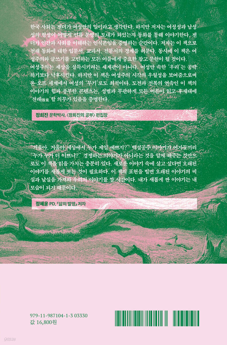 한국 사회는 젠더=‘여성 문제’로 간주한다. 젠더에 관한 한 최악의 관점이다. 이 책은 여성성과 남성성의 형성 과정이 어떻게 인류 문명의 토대가 되었는지 보여주고, 인간과 사회를 이해하는 인식론으로서 한국 사회에서 젠더의 지적인 지위를 높인다. 다양한 사례와 다방면에 걸친 저자의 박식함과 통찰 덕분에, 이 책은 여성주의와 글쓰기를 고민하는 사람에게는 중요한 참고문헌이 될 것이다. 여성주의는 세상을 설득하려는 세계관이 아니다. 이 책은 여성주의 시각의 우월성을 드러내므로, 온-오프 세계에서 여성의 ‘무기’로도 더할 나위 없다. 한편 도전과 전복의 연속인 이야기의 힘과 풍부한 콘텐츠는, 성별과 무관하게 모든 어른이 읽고 후대에 ‘전래(傳來)’할 의무가 있음을 증명한다. 성차별이 젠더 갈등으로 둔갑한 이 시대가 혼란스럽기만 한 모든 남성과 여성에게 권한다. - 정희진 (문학박사, <정희진의 공부> 편집장) |