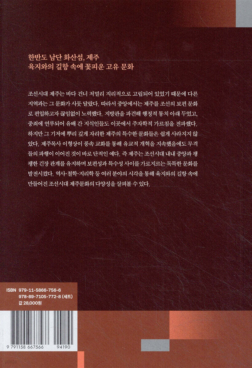 조선시대 제주학풍의 형성과 전개_김학수 Ⅰ. 머리말 Ⅱ. 15~16세기 주자학적 지식문화의 갈래 Ⅲ. 17세기 주자학풍의 강화 Ⅳ. 17세기 이후 기호·영남학풍의 이원적 수용과 전개 Ⅴ. 맺음말 제주목사 이형상의 풍속 교화와 폐정 개혁_이남옥 Ⅰ. 머리말 Ⅱ. 이형상의 누습 인식과 풍습 교화 Ⅲ. 이형상의 폐정 인식과 개혁 정책 Ⅳ. 맺음말 제주 도학자 변경붕의 철학사상_이창일 Ⅰ. 머리말 Ⅱ. 기호학파의 표준 입장 Ⅲ. 실존적 문제의 성리학적 해석 Ⅳ. 미완의 유서와 박물학적 관심 Ⅴ. 맺음말 제주 인쇄문화의 전개와 가치_김소희 Ⅰ. 머리말 Ⅱ. 조선 전기 제주 간행물의 특징 Ⅲ. 조선 후기 제주 간행물의 특징 Ⅳ. 제주 인쇄문화의 보편성과 특수성 제2부 지리환경과 공간 제주의 자연환경과 인문환경_정치영 Ⅰ. 머리말 Ⅱ. 제주의 자연환경 Ⅲ. 제주의 인문환경 Ⅳ. 맺음말 지도와 기록화로 본 조선 후기 제주 문화와 공간_정은주 Ⅰ. 머리말 Ⅱ. 제주지도의 변천 Ⅲ. 제주 공마 목장의 운영 Ⅳ. 제주 지방관의 순력과 명승유람 Ⅴ. 맺음말 신광수의 「탐라록」과 조선 후기 지식인의 제주 인식_박용만 Ⅰ. 머리말 Ⅱ. 지방관과 유배 지식인의 서로 다른 제주 인식 Ⅲ. 「탐라록서」에 나타난 당대 문인들의 인식 Ⅳ. 「탐라록」 수록 한시에 흐르는 시적 정서 Ⅴ. 맺음말 제3부 경제활동과 보건환경 제주 토지 소유와 매매의 한 양상_정수환 Ⅰ. 머리말 Ⅱ. 진주강씨의 사회적 위상과 토지 확보 Ⅲ. 명문을 통해 본 제주 토지 매매의 특징 Ⅳ. 맺음말 국가 의례와 제주 흑우 공급_이욱 Ⅰ. 머리말 Ⅱ. 희생제와 흑우 소용 Ⅲ. 흑우 진공 수효의 증가 Ⅳ. 흑우 목양과 수송 Ⅴ. 우역의 성행과 대응 Ⅵ. 흑우의 제향 공급 Ⅶ. 맺음말 제주 의료환경의 주변적 성격_김호 Ⅰ. 머리말 Ⅱ. 제주 약재 공급과 약국 운영 Ⅲ. 제주목사의 의료환경 조성 Ⅳ. 주변성에서 오는 제주의 열악한 보건환경 Ⅴ. 맺음말 제4부 생활문화의 다채성 제주 신화에 담긴 생활문화와 그 의미_강문종 Ⅰ. 머리말 Ⅱ. 신들의 옷과 집 Ⅲ. 신들의 음식 Ⅳ. 신들의 가정 불화 Ⅴ. 신들에게 중요한 나이 15세 Ⅵ. 신들의 사랑과 불륜 Ⅶ. 맺음말 갓 문화를 통해 본 제주 복식의 다름과 습합_이민주 Ⅰ. 머리말 Ⅱ. 제주 풍속과 복식 Ⅲ. 제주의 모자 Ⅳ. 갓 문화로의 습합 Ⅴ. 맺음말 조선 향약의 현대적 실천, 가시리의 마을만들기_한도현 Ⅰ. 제주도 마을의 원리로서 향약 Ⅱ. 제주 가시리의 향약과 마을만들기 Ⅲ. 커머닝의 실천과 현실 유토피아의 건설 |