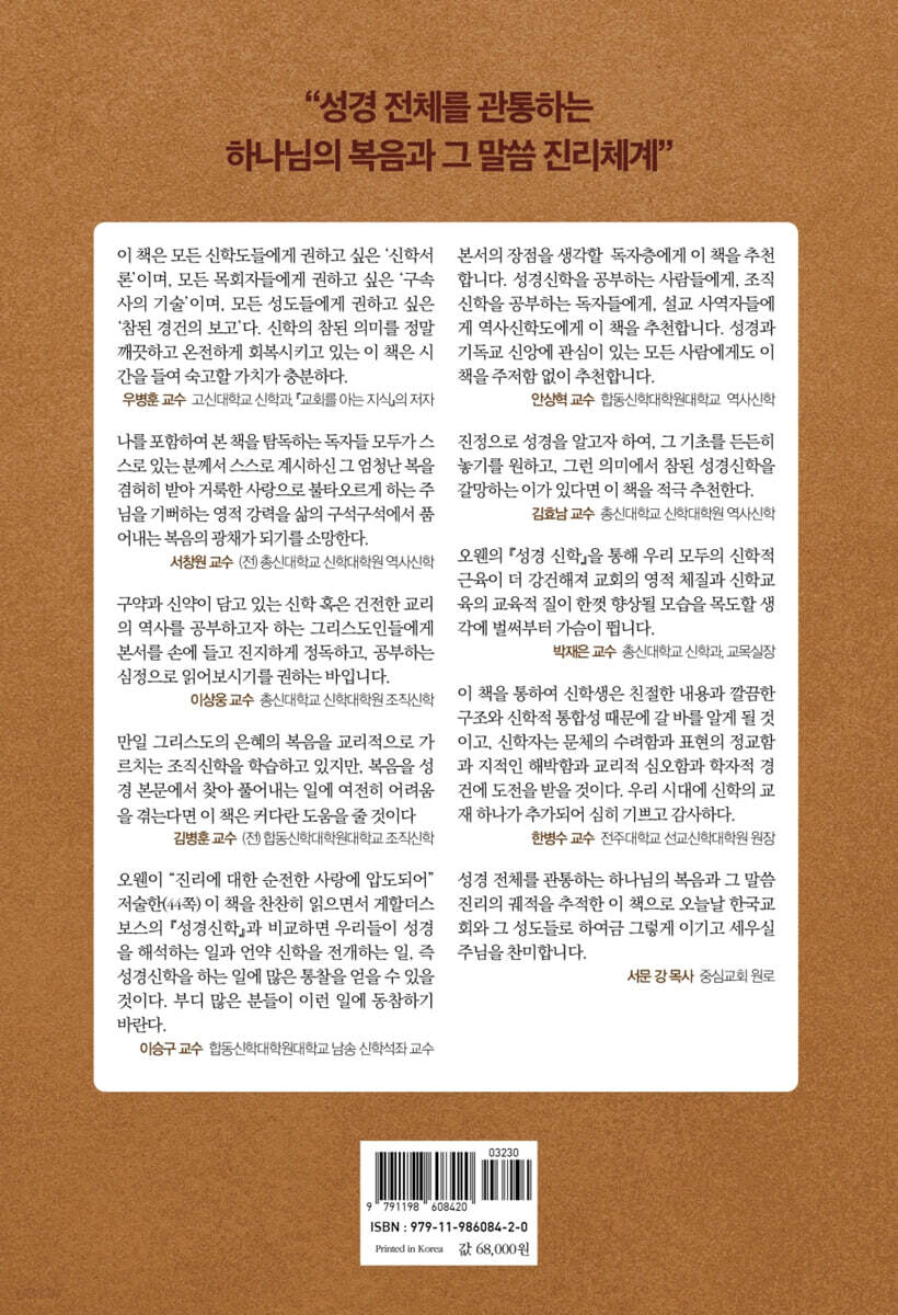 오웬의 『성경신학』을 통해 우리 모두의 신학적 근육이 더 강건해져 교회의 영적 체질과 신학교육의 교육적 질이 한껏 향상될 모습을 목도할 생각에 벌써부터 가슴이 뜁니다. - 박재은 (교수, 총신대학교 신학과, 교목실장)