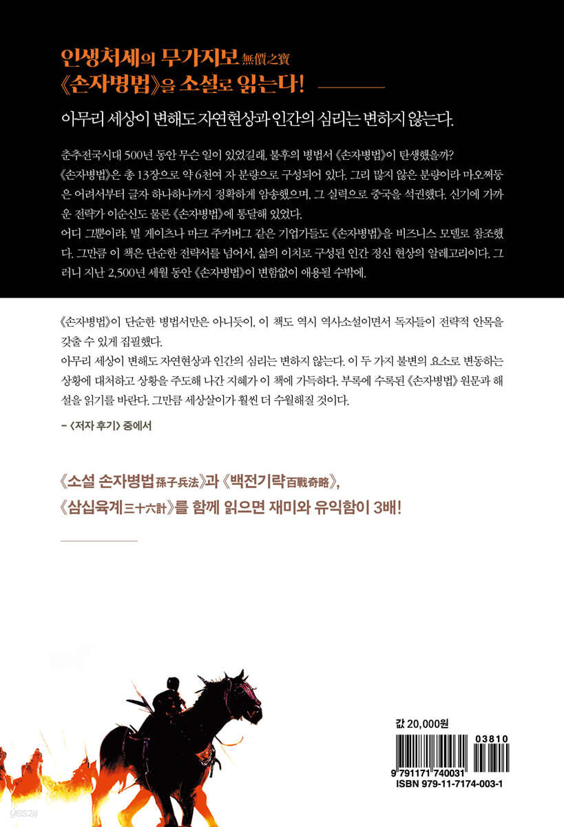 《손자병법》은 총 13장으로 약 6천여 자 분량으로 구성되어 있다. 그리 많지 않은 분량이라 마오쩌둥毛澤東은 어려서부터 글자 하나하나까지 정확하게 암송했으며, 그 실력으로 중국을 석권했다. 신기에 가까운 전략가 이순신李舜臣도 물론 《손자병법》에 통달해 있었다. 어디 그뿐이랴. 빌 게이츠나 마크 주커버그 같은 기업가들도 《손자병법》을 비즈니스 모델로 참조했다. 그만큼 《손자병법》은 단순한 전략서를 넘어서, 삶의 이치로 구성된 인간 정신 현상의 알레고리이다. 그러니 지난 2,500년 세월 동안 《손자병법》이 변함없이 애용될 수밖에. 《손자병법》이 단순한 병법서만은 아니듯이, 이 책도 역시 역사소설이면서 독자들이 전략적 안목을 갖출 수 있게 집필했다. 아무리 세상이 변해도 자연현상과 인간의 심리는 변하지 않는다. 이 두 가지 불변의 요소로 변동하는 상황에 대처하고 상황을 주도해 나간 지혜가 이 책에 가득하다. 부록에 수록된 《손자병법》 원문과 해설을 읽기를 바란다. 그만큼 세상살이가 훨씬 더 수월해질 것이다. - [작가 후기] 중에서 “춘추전국시대는 자고 나면 나라 하나가 사라질 만큼 한 치 앞을 내다볼 수 없었던 시기였다. 그처럼 요동치는 시기에 노자, 공자 등 제자백가들이 나와 인륜을 설파했고, 어부지리, 관포지교, 오월동주, 와신상담 등 수많은 사자성어가 나왔으며 시대를 관통하는 불후의 전략서인 《손자병법》도 탄생했던 것이다. 오늘날도 그 시대와 다르지 않다. 자고 나면 전대미문의 신기술이 나오며, 여러 직종의 소멸과 생성이 거듭되고 있다. 이런 시대가 더욱더 《손자병법》의 가치를 돋보이게 한다. 《손자병법》의 손자 孫子는 손무孫武와 그의 5대손 손빈孫?을 일컫는 존칭이다. 손무는 춘추시대에 오나라 합려闔閭를 도와 천하를 제패했고, 손빈은 전국시대에 제나라를 최고 강국으로 만들었다. 이들의 이야기가 바로 이 소설의 내용이다. 특히 손무는 하나라 이후 춘추시대까지의 역사적 전쟁 현장을 일 일이 답사하며 병법서를 만들어 냈다. 역사가 무엇인가? 인간이 만들어 놓은 자취들이다. 모든 역사에 공통점이 있으며, 그중 춘추전국시대야말로 인간의 야망에서 비롯된 도전과 응전이 모조리 드러난 현장이었으니, 춘추 초기 180여 제후국이 말기에 14개국으로 줄어들었고, 다시 전국시대에 7대 강국으로 재편되어 갔던 것이다. 그동안 전쟁만 1,600여 차례 벌어지면서 수많은 영웅호걸이 명멸하고 온갖 전술 전략이 난무했다. 이 소설은 그 시대를 배경으로 하여 손무와 손빈의 활약상을 그려내었다. ‘손자천독달통신孫子千讀達通神’이라고 하듯, 이 책을 읽고 또 읽으시라고 권유하고 싶다.” 저자의 말처럼 마오쩌둥, 이순신, 빌 게이츠, 마크 주커버그처럼 《손자병법》애독자는 아니더라도 꼭 한 번은 일독을 권한다. 소설을 읽다 보면 자연스럽게 병법 소개를 하고 있으며, 관련 고사성어도 익히게 된다. 어렵게만 생각했던 《손자병법》을 《삼국지》못지않게 재미 있는 소설로 풀어놓은 이 책을 읽다 보면 자연스럽게 인생 처세의 전술전략을 배울 수 있는 소중한 기회가 될 것이다. 많은 등장인물이 등장하기 때문에 [주요 등장인물]과 [손무와 손빈의 가계도]도 넣어 이해를 돕고 있다. 또한 오래도록 소장할 수 있도록 부록으로 《손자병법》 13편과 해석을 수록했다. 《소설 손자병법孫子兵法》이 이론서라면 《백전기략百戰奇略》과 《삼십육계三十六計》는 실천서라 할 수 있다. 따라서, 이 세 권은 인생을 살아가는 데 꼭 필요한 무가지보無價之寶 삼서三書로서 늘 머리맡에 두고 함께 읽으면 나날이 재미와 유익함이 배가倍加될 것이다. |