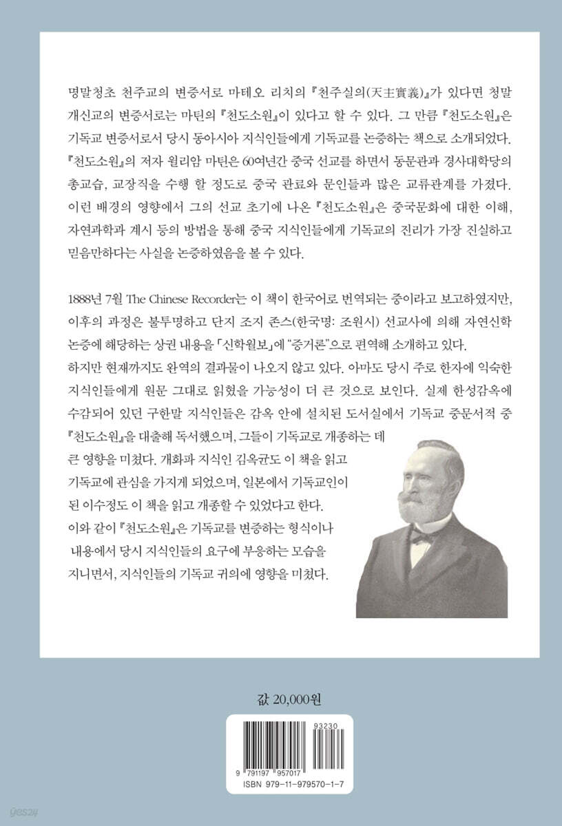 옮긴이의 말 감사의 말 서문 天道溯原序 서언 序言 인 天道溯原引 상권 上卷 제1장 별들로 증명하다 以星宿爲證 제2장 만물의 생성으로 증명하다 以生物爲證 제3장 인체로 증명하다 以人身爲證 제4장 영혼으로 증명하다 以靈魂爲證 제5장 금수와 곤충으로 증명하다 以禽獸昆蟲爲證 제6장 만물이 모두 주재자의 덕을 드러냄을 논하다 論萬物皆彰主宰之德 중권 中卷 제1장 하늘이 베푼 가르침을 사람이 가벼이 여길 수 없음을 논하다 論天垂敎爲人所不可少 제2장 선지자들의 예언으로 증명하다 以先知之預言爲證 제3장 이적으로 증명하다 以異能爲證 제4장 도의 운행으로 증명하다 以道之行爲證 제5장 교화로 증명하다 以敎化爲證 제6장 진리의 신묘함으로 증명하다 以道之妙?證 제7장 의심의 실마리를 풀어 참 도를 밝히다 釋疑端以明眞道 경교비문과 서문 景敎碑文?序 하권 下卷 제1장 성서의 원문과 번역문을 논하다 論聖書原文譯文 제2장 혼의 영생, 신체의 부활소생과 말일의 심판을 논하다 論魂之永生身之復甦與末日之審判 제3장 시조가 명을 어겨 사람에게 폐 끼침을 논하다 論始祖違命累人 제4장 예수가 죄를 속하고 사람 구원함을 논하다 論耶?贖罪救人 제5장 성령이 사람의 본성을 회복시킴을 논하다 論聖靈復人之本性 제6장 세상 사람들이 믿음으로 구원 얻음을 논하다 論世人賴信以得救 제7장 신자는 마땅히 성덕을 힘써 닦아야 함을 논하다 論信者當力修聖德 제8장 신자는 마땅히 항상 마음으로 기도해야 함을 논하다 論信者當恒心祈禱 예수께서 가르치신 기도 원문 耶?敎人祈禱原文 참회 기도문 형식 懺悔文式 일반 기도문 형식 祈禱文式 매 식사 감사 기도문 형식 每飯謝恩文式 제9장 신자는 마땅히 삼가 성례를 지켜야 함을 논하다 論信者當謹守聖禮 부록: 1858년 이후 추가된 장 상권 제2장 오행으로 증명하다 以五行爲證 하권 제10장 삼위일체를 논하다 論三位一體 해제 색인 |