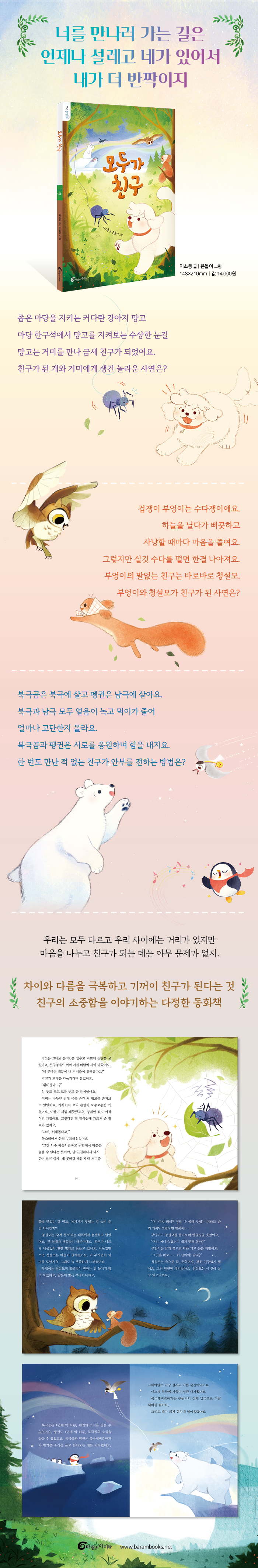 친구와 함께 행복해지는 삶 개와 거미는 서로의 눈을 통해 자신을 바라보고 그제야 자신이 꽤 근사한 존재라는 사실을 깨닫는다. 좋은 친구는 나 자신을 제대로 바라볼 수 있도록 돕고 내가 좀 더 괜찮은 사람이라고 느낄 수 있도록 이끌어준다. 그러나 그게 전부는 아니다. 친구는 함께하는 것만으로도 즐겁고 행복해서 자꾸자꾸 만나고 싶어지는 존재다. 「한밤에 깨어 있는 청설모와 한낮에 깨어 있는 부엉이」에서 수다쟁이 부엉이와 과묵한 청설모는 그저 함께 있는 시간이 설레고 좋아서 밤낮이 바뀌는 아침과 저녁 짧은 만남을 갖는다. 서로 활동하는 시간이 다른 데다 천적 사이인 청설모와 부엉이가 만나는 것은 그저 함께하는 게 좋아서이다. 수다쟁이 친구는 떠들고, 듣기 좋아하는 친구는 그저 귀 기울이는 시간. 그러는 동안 맹금류답지 않게 겁이 많은 부엉이는 사냥하는 어려움과 자신의 콤플렉스를 털어놓는다. 하지만 “사냥을 좀 못하면 어때? 네가 처음부터 사냥을 잘했다면, 우린 친구가 되지 못했을 거야.” 청설모 역시 기억력이 나쁘다는 약점이 있고, 그건 누구나 그렇다. 그리고 친구란 약점을 솔직히 털어놓고, 상대를 있는 그대로 바라봐주는 존재다. “진작 너한테 털어놓을 걸 그랬어. 마음이 얼마나 가벼운지 몰라!” 나를 있는 그대로 받아주고 응원까지 해주니 친구와 함께하는 일이 즐거울 수밖에. 「멀고 먼 곳으로 마음이 달려가요」에서 남극에 사는 펭귄과 북극에 사는 북극곰의 우정도 비슷한 처지에 대한 공감 때문이다. 지구온난화로 얼음이 사라지고 있는 북극. 북극곰은 얼음이 녹아서 살아가는 게 힘들지만 펭귄도 같은 상황일 거라는 생각으로 어려움을 극복해나간다. 비록 힘겹고 고통스러운 삶일지도 나 혼자만 그런 것이 아니라면 얼마나 위안이 되는지. 그리고 북극곰이 한번도 만난 적이 없는 펭귄과 친구가 된 까닭은 둘 사이를 오가며 이야기를 전달해주는 북극제비갈매기 덕분이다. 기억력이 좋은 제비갈매기는 둘 사이에서 마음 배달부 역할을 하고, 그러면서 또 그들에게 좋은 친구가 되어준다. 펭귄은 찬바람이 씽씽 부는 남극에서 북극곰을 생각하며 씩씩하게 살아가고, 북극곰은 얼음을 찾아 헤엄치며 녹초가 된 순간에도 펭귄을 떠올리며 힘을 낸다. 제비갈매기에게도 친구들의 마음을 전달해야 할 임무가 없다면 그 먼 거리를 날아가는 동안 훨씬 더 지치고 힘들었을 것이다. “특히 사나운 바람을 맞으면서 빙하 위에 서 있을 때 네 생각을 많이 해. 그럼 신기하게도 매서운 추위가 조금 누그러드는 것 같아.” 『모두가 친구』는 서로에게 너무나 다정한 친구들을 통해 우정이 얼마나 깊고 아름다운 관계인지 보여준다. 이들의 우정은 가족이나 연인간의 사랑만큼이나 애틋하면서도 보다 열려 있는 관계다. 나와 다른 존재를 이해하고 받아들이고 서로에게 힘이 되어준다는 것은 보통 마음으로 되는 것이 아니니까. 서로에게 자신의 세계를 열어 보여주고, 그로 인해 각자의 세계가 한층 넓어진다는 것은 우정의 가장 큰 덕목이 아닐까. 어린이들에게 친구와 우정이 소중한 이유이기도 하다. 이제 막 친구를 만나 우정 어린 사회생활을 시작하는 모든 어린이에게 권할 만한 책이다. |