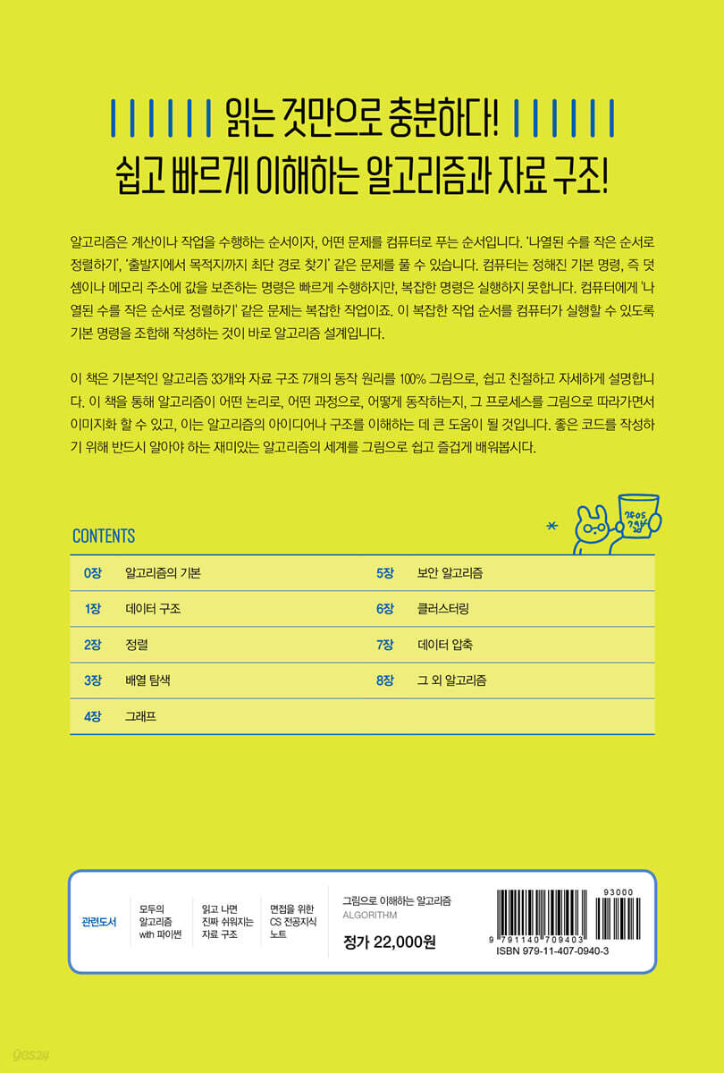 제목에서 말한 대로 그림이 책의 절반입니다. 그만큼 읽기 편하고 이해도 정말 잘됩니다. 또한 단순히 시험을 위한 알고리즘뿐 아니라 보안 알고리즘 등도 다루는데, 최근에 정말 많은 보안 알고리즘을 읽어 보았지만 이 책만큼 쉽게 정리된 책은 못 봤습니다. - 이장훈 (4년 차 DevOps 엔지니어)