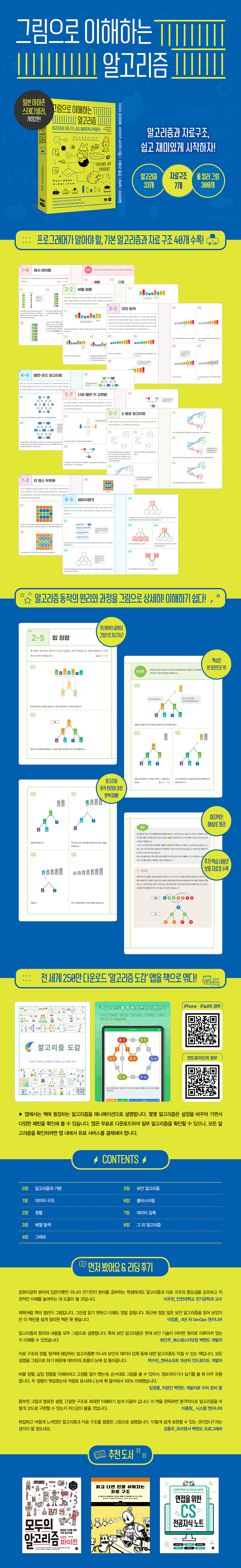 풍부한 그림과 명료한 설명, 간결한 구조로 최대한 이해하기 쉽게 이끌어 갑니다. 이 책을 완독하면 본격적으로 알고리즘을 어떻게 코드로 구현할 수 있는지 자신감이 붙을 것입니다. - 이종원 (시스템 엔지니어)