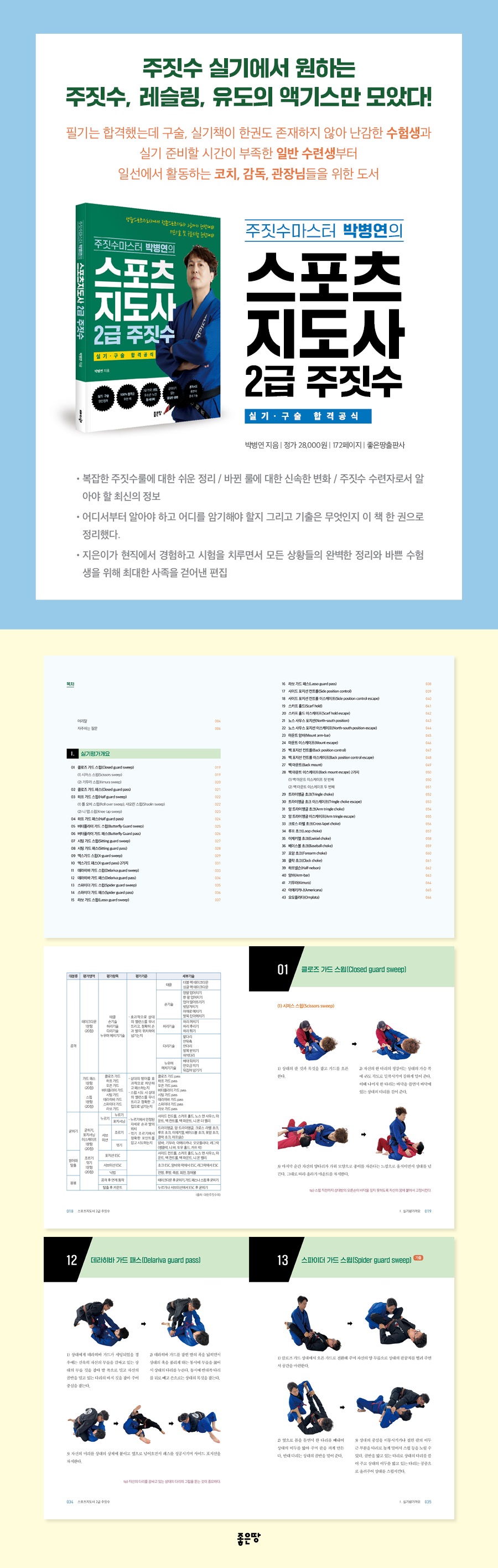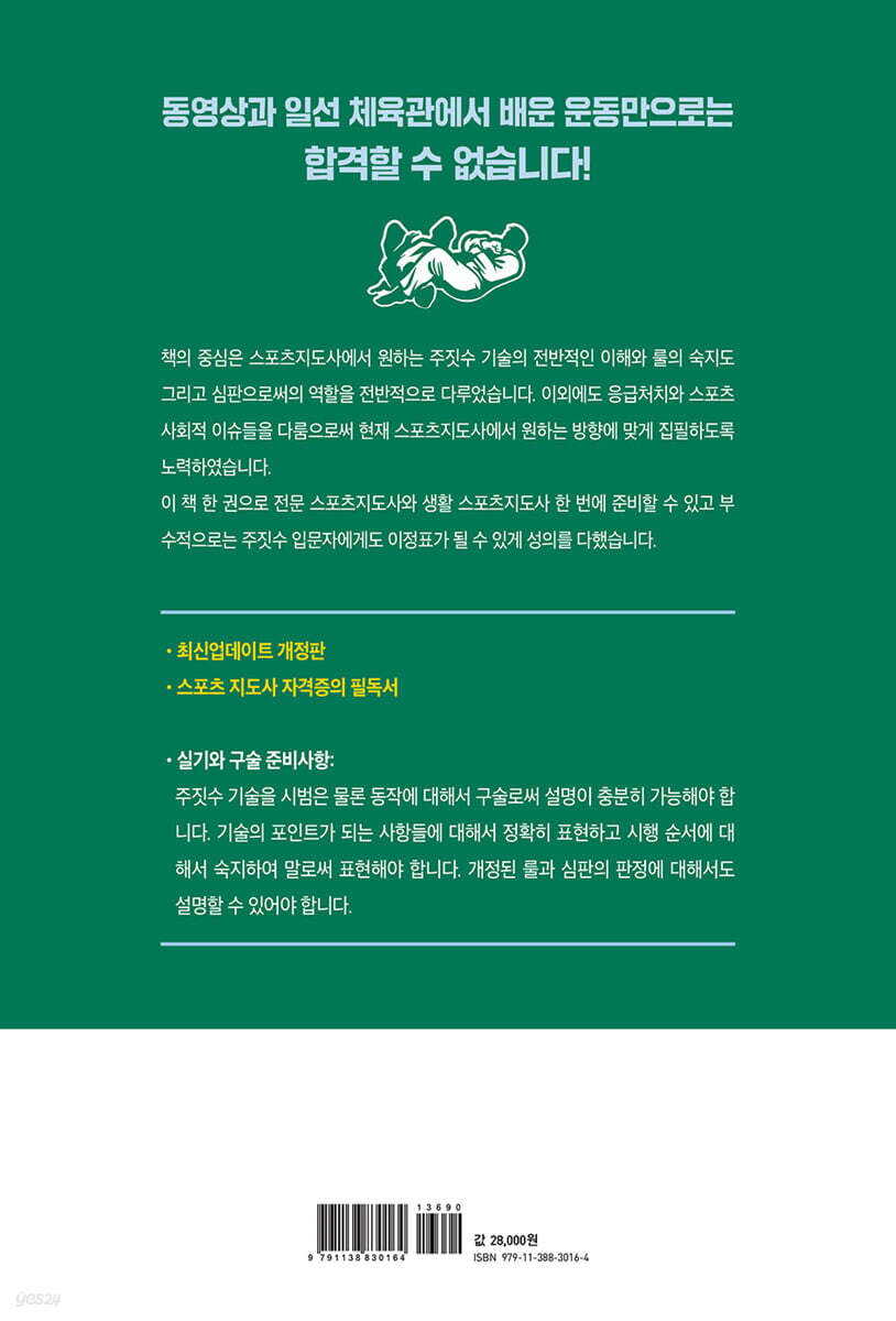 ㆍ 스포츠 지도사 자격증의 필독서 ㆍ 실기와 구술 준비사항: 주짓수 기술을 시범은 물론 동작에 대해서 구술로써 설명이 충분히 가능해야 한다. 기술의 포인트가 되는 사항들에 대해서 정확히 표현하고 시행 순서에 대해서 숙지하여 말로써 표현해야 한다. 개정된 룰과 심판의 판정에 대해서도 설명할 수 있어야 한다. 한국에서의 주짓수가 성장하고 발전하는 데 큰 전환점이 찾아왔다. 이제는 주짓수가 단순히 종합 격투기 선수나 일부 마니아 계층의 취미가 아닌 생활 스포츠로 자리매김하고 있다. 이러한 흐름 속에서 주짓수 스포츠지도사에 대한 관심과 수요가 높아지고 있다. 2022년에는 첫 스포츠지도사 시험이 개최되었고, 많은 인원들이 이에 응시했으며, 주짓수 종목으로 전문 스포츠지도사와 생활 스포츠지도사가 배출되었다. 이러한 긍정적인 동향과는 대조적으로, 시험을 준비하는 데 필요한 전문적인 교재의 부족이라는 어려움도 있다. 이 책은 그러한 어려움을 보완하는 데 도움을 줄 것이다. 저자는 본인의 체육관에서의 경험과 시행착오를 토대로 저술하였다. 주짓수 기술의 이해와 룰의 숙지, 심판 역할뿐만 아니라 응급처치와 스포츠 사회적 이슈 등을 포함하여 스포츠지도사 시험에 필요한 다양한 내용을 다루고 있다. 이를 통해 전문 스포츠지도사와 생활 스포츠지도사를 한꺼번에 준비할 수 있으며 주짓수 입문자들에게도 유용한 지침서가 될 것이다. |