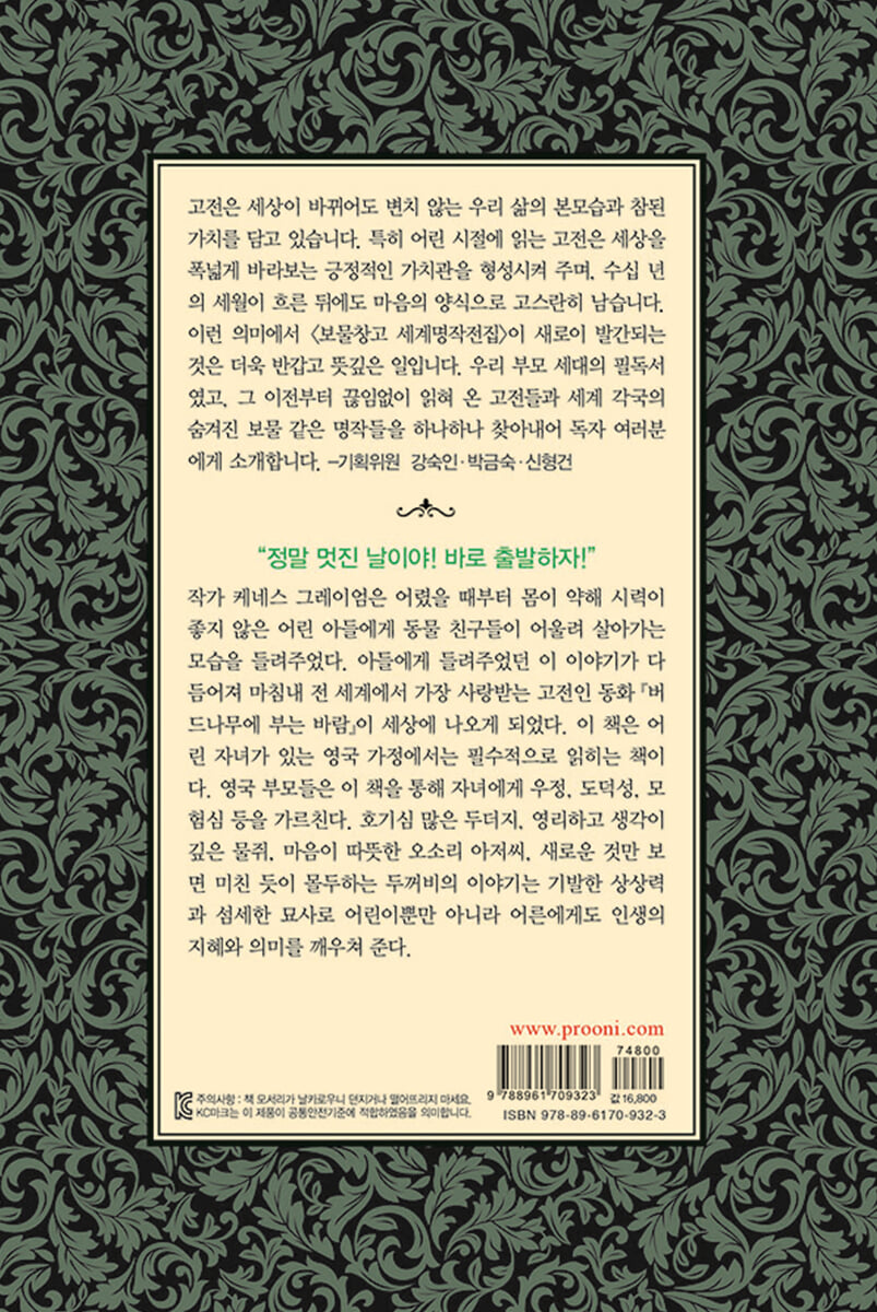 -아버지의 사랑이 전하는 삶의 진정한 가치와 행복의 메시지 『버드나무에 부는 바람』은 영국의 시골 마을에 사는 동물 친구들의 모험 이야기를 담고 있다. 호기심 많고 순수한 두더지가 영리하고 사교적인 시인 물쥐, 마음씨 따뜻하고 현명한 오소리 아저씨, 으리으리한 저택을 가진 명랑한 사고뭉치 두꺼비 등 다양한 동물 친구들을 사귀면서 더 넓은 세상을 경험한다. 두더지는 친구들과 마차 여행을 떠나거나 수달의 잃어버린 아들을 찾으러 다니고 심지어 두꺼비를 도와 족제비와 담비 일당에게 빼앗긴 저택을 탈환하는 등 다양한 모험을 펼친다. 익살스러운 유머로 인간 사회를 풍자함과 동시에 대자연의 아름다운 풍경을 눈앞에 그리는 듯한 탁월한 묘사는 독자의 마음을 사로잡기에 충분하다. 케네스 그레이엄은 선천적으로 시력이 약해 앞을 잘 보지 못한 아들을 위해 잠자리에서 천연림에 사는 동물들 이야기를 들려주었다. 집안에서만 생활하느라 소극적이고 자신감이 부족했던 아들의 어둡고 상처 입은 마음을 어루만지기 위해 아들을 두더지에 빗대어 이야기를 탄생시킨 것이다. 그래서 『버드나무에 부는 바람』에는 신나는 모험의 경험과 다채로운 자연의 풍경뿐만 아니라 치유의 기운을 선물하고 싶었던 아버지의 진심 어린 마음까지 녹아 있다. 자신의 감정에 솔직하고, 슬플 때나 기쁠 때나 온 힘을 다해 울고 웃는 사랑스러운 동물 친구들의 이야기를 읽으며 독자는 삶의 진정한 가치와 행복이 무엇인지 생각하게 된다. 처음 보는 물건, 처음 듣는 소리, 처음 마주하는 세상은 우리를 경외와 감동으로 이끌지만, 늘 그 자리를 지키고 있는 것들이 주는 안락함과 소중함을 깨닫는다면 모든 일상이 감동일 수 있음을 알게 될 것이다. |