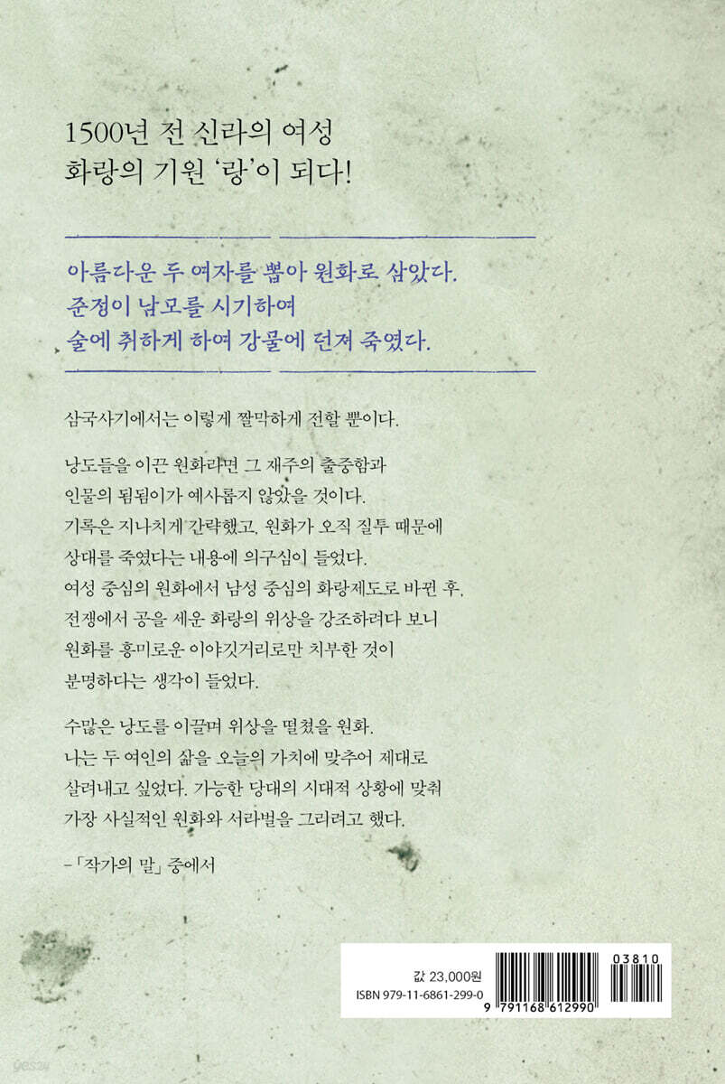‘고구려와 백제보다 늦게 시작했으나 우리 신라가 가장 번창하리라.’ 왕은 세 여인의 젊은 기운과 함께 붉은 해의 기운을 받으며 강성한 신라를 꿈꾸었다. 527년 법흥왕 14년, 저녁 까치가 힘차게 서쪽 하늘을 가르는 겨울이었다. --- p.103 「랑이 되다」 중에서 사아는 찻잔을 내려놓으며 남모를 힐끗 보고 수줍게 말했다. “송구하오나, 남모 공주님은 백제의 우아한 멋과 신라의 화려한 미를 두루 간직하고 계시군요. 뵙고 깜짝 놀랐습니다.” 보과 부인이 살며시 웃었다. “하하, 그런 말씀을 할 줄 아세요?” 남모는 얼굴을 붉혔다. 찻잔 위에 올린 분홍빛 꽃잎이 남모의 가슴처럼 가볍게 흔들렸다. --- p.120 「백제의 사신」 중에서 “우리 신라는 여인네도 말을 타고 활을 쏘며, 어머니의 신분이 세습되는 나라입니다. 낭도들의 우두머리인 원화도 여인입니다. 아버님, 정녕 여인은 왕이 되어서는 아니 됩니까?” --- p.233 「여인도 왕이 되어야 합니다」 중에서 온몸을 남김없이 태워 아스라이 재만 남을 만큼 격렬했던 그 밤이 다시 떠올랐다. 신라의 공주이기 이전에 한 여인이고 싶은가. 이 사내를 품는 것이 처음부터 허락되지 않는 신라의 원화이어야 하는가. 운명의 갈림길에서 결국 선택을 해야 할 순간이 다가오고 있음을 남모는 알고 있었다. --- p.247 「폐하를 지켜라」 중에서 “낭도들이 있었기에 남모 원화와 저는 부끄럽지 않은 원화가 될 수 있었습니다. 그러나 이제 원화는 그 역할이 끝났습니다. 여러분 속에는 이미 원화가 있습니다. 낭도들은 이전의 원화보다 나은 시대를 이끌어가야 합니다. 이것은 물이 흘러가는 이치와 같습니다.” --- p.332 「랑의 기원」 중에서 “‘화랑(花郞)’이라고 하기로 했네.” “화랑, 이라고요?” “그렇네. 화랑. 어떠한가? 원화의 낭도들이란 의미가 있고, 또 초대 풍월주인 위화랑의 이름이기도 하고. 해서 화랑이라 이름 지었네.” “화랑, 참으로 적절한 듯합니다.” --- p.334 「화랑」 중에서 |
