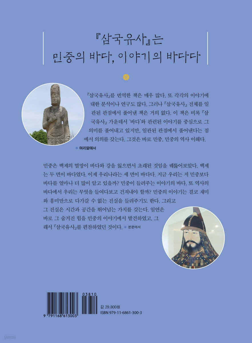 백제는 두 면이 바다였다. 이제 우리나라는 세 면이 바다다. 과연 저 이야기의 바다, 또 역사의 바다에서 우리는 무엇을 들여다보고 건져내야 할까? (중략) 일연은 바로 그 숨겨진 힘을 민중의 이야기에서 발견하였고, 그래서 『삼국유사』를 편찬하였던 것이다. _「바다와 강을 빼앗겨 멸망한 백제」 중 일연은 역사적 사건은 물론이요 그와 관련한 민중의 이야기와 그 속에 숨겨진 지혜를 소중히 기록하고자 했다. 백성들의 입에서 입으로 전해지는 이야기는 때로 허황되고 사사롭게 여겨지기도 하지만, 분명 제 나름의 가치가 존재한다. 상징은 관념보다 경험에서 나오고 또 경험에서 더 풍부해지는데, 원시 고대의 신화가 상징의 보고(寶庫)인 까닭이 여기에 있다. 중세에 들어서면서 신화는 터무니없는 이야기로 치부되어 지식인들로부터 배척받았지만, 민중은 여전히 그런 신화의 세계에서 살았다. 그리고 그 흔적을 이야기 속에 남겼다. 탈해 이야기에 상징성이 풍부한 것도 민중의 경험과 상상력이 빚어낸 이야기이기 때문이다. 실제로 유교적 관점에서 편찬되어 지식인의 역사인식을 담아낸 『삼국사기』에서는 “성의 북쪽 양정(壤井) 언덕에 장사지냈다”고만 적고 있어서, 그 상징성을 현저히 떨어뜨렸다. _「바다가 기른 영웅, 탈해」 중 민중의 신화가 던지는 역사의 재발견 1289년경에 일연이 편찬한 『삼국유사』는 20세기에 들어서야 비로소 우리 민족의 고전으로 대접받았다. 근대로 넘어오면서 민족주의가 대두되자 『삼국사기』와 달리 사대주의적인 성향이 없고 오히려 매우 주체적이라는 평가를 받았고, 또한 『삼국사기』에서는 전혀 언급하지 않은 상고사와 고대사에 대한 정보를 부분적으로나마 제공해주고 있다는 사실이 높이 평가된 까닭이다. 수로왕과 가야의 역사를 더듬어볼 수 있는 문헌으로 가장 오래된 것은 『삼국유사』의 〈가락국기(駕洛國記)〉다. 원래 〈가락국기〉는 고려 문종 때 지금의 김해인 금관(金官)에 관리로 파견된 문인이 찬술한 글이다. 이를 일연이 간략하게 줄여서 『삼국유사』에 실었다. 간락하게나마 실어두지 않았다면, 가락국의 역사와 이야기는 망각 속으로 사라졌을 것이다. 물론 유물과 유적이 남아 있기는 하지만, 그래도 생각하면 아찔하다. _「해양 왕국을 이룩한 김수로왕」 중 『삼국유사』가 고전으로 불리는 진정한 이유는 단순히 과거의 유산이어서가 아니라, 변화하는 시대에 맞춰 늘 새로 고찰해야 할 가치를 던져주기 때문일 것이다. 『삼국유사, 바다를 만나다』로 새롭게 태어난 『삼국유사』는 그것을 생산하고 소비한 주체가 민중이었다는 사실을 통해 오늘날의 민중의 존재와 그 의의에 대해 되새기게 한다. 인문의 바다, 민중의 바다, 이야기의 바다를 항해하다 『삼국유사』는 그 자체가 바다다. 무진장한 지혜가 출렁이는 보고다. 현대인의 사고방식으로는 쉽게 이해할 수 없는 지혜가 가득하고 이야기 표면 아래 숨겨진 의미 또한 다양하기 때문에 쉬운 듯 어려운 것이 바로 『삼국유사』이다. 쉽게도 읽을 수 있고 어렵게도 읽을 수 있는 『삼국유사』의 지혜는 수천 년의 세월을 지나며 쌓인 경험에서 저절로 얻어진 것이므로 첨단 문명과 갖가지 관념에 지친 현대인들은 그 오묘한 깊이를 체득하지 못한 채 살아간다. 그렇다면 인문주의의 바다 『삼국유사』에서 항해하며 ‘진리의 바다’에서 노닐어보는 것은 어떨까? |