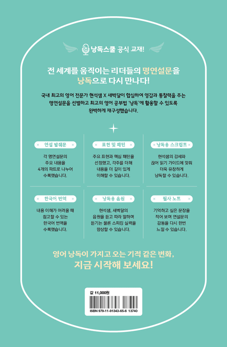 대한민국 최고의 영어 전문가 이현석X새벽달 선생님의 고민에서 『낭독하는 명연설문』이 탄생했습니다. 영어 학습의 패러다임을 뒤집는 최고의 공부법 - 낭독! 하지만, 낭독에 적합한 책은 그리 많지 않다? 낭독은 여러 전문가와 교육 관련 연구에서 가장 효과적인 공부 방법으로 꼽힙니다. 특히 발음 연습, 유창성 개선 및 청취력 증가에 탁월한 효과가 있는 것으로 알려져 있습니다. 이현석 선생님과 새벽달 선생님은 “이 좋은 영어 공부법 ‘낭독’을 ‘실천’으로 옮길 수 있도록 돕자!”라는 생각으로 2020년부터 ‘낭독 챌린지’를 진행했고 수천 명의 참가자들의 폭발적인 성원에 힘입어 지금은 ‘낭독스쿨’이라는 교육 프로그램으로 자리 잡았습니다. 하지만 ‘낭독스쿨’을 진행하면서 직면한 과제가 있었는데, 그것은 바로 ‘무엇을 낭독할 것인가?’였습니다. 특히 ‘영어 낭독 경험이 없는 초보자들이 낭독할 만한 쉬운 책이 없다’는 것이 가장 큰 문제였습니다. 수많은 교재와 영어 원서들을 낭독하고 리뷰하면서 내린 결론은 ‘낭독에 최적화된 책을 직접 만들자!’였습니다. 그렇게 『낭독하는 명연설문』이 탄생했습니다. 왜 ‘명연설문’인가? 전 세계의 마음을 움직이는 설득력을 갖춘 사람들의 연설문을 통해 논리적으로 설득하거나 감정적으로 호소하며 이야기를 전개하는 방법을 배울 수 있습니다. 또한 일상 대화에서는 쉽게 익히기 어려운 고급 어휘와 복잡한 문장 구조를 접할 수 있습니다. 명연설문은 특정 주제에 대해 깊이 있고 정제된 언어로 적혀 있고, 전달력과 호소력을 높이기 위해 정확한 딕션과 청킹을 사용하고 있기 때문에 듣기와 스피킹에 활용할 수 있는 최고의 영어 교재라고 할 수 있습니다. 또한 한 사람의 인생이 녹아 들어 있는 스토리텔링을 들여다 보며, 삶의 지혜를 획득하고 자아 성찰의 기회로 확장시켜 볼 수 있습니다. 이렇게 발췌된 명연설문에 낭독을 보다 풍성하게 해 주는 다양한 학습 장치들을 덧붙였습니다. ● 핵심 표현 및 패턴: 낭독 전후에 명연설문 속 핵심 표현과 패턴을 점검하고 학습할 수 있도록 했습니다. ● 낭독 훈련: 이현석 선생님이 제시하는 강세와 청킹 가이드를 제공하여 낭독을 더욱 유창하게 할 수 있도록 돕습니다. ● 한국어 번역: 번역이 함께 제공되어 영문과 비교해 보면서 내용을 확인할 수 있고, 한국어 낭독에도 활용할 수 있습니다. ● 필사 노트: 명연설문 속 가장 기억하고 싶은 문장을 적어 보는 필사 활동을 통해 명문장의 교훈과 감동을 다시 한번 느낄 수 있습니다. ● 3가지 종류의 음원: 연설가, 현석샘, 새벽달 선생님의 목소리 중 나에게 더 맞는 목소리의 음원을 선택할 수 있고, 문장의 정확한 발음과 강세를 듣고 낭독에 활용할 수 있습니다. 영어 낭독이 가지고 오는 기적 같은 변화, 이제 당신 차례입니다! 이미 수천 명의 사람들이 ‘낭독스쿨’을 통해 함께 낭독하면서 귀가 열리고 말문이 트이는 놀라운 변화를 경험하고 있습니다. 이제 여러분이 그 변화를 내 것으로 만들어 보는 것은 어떨까요? 지금 시작해 보세요! |