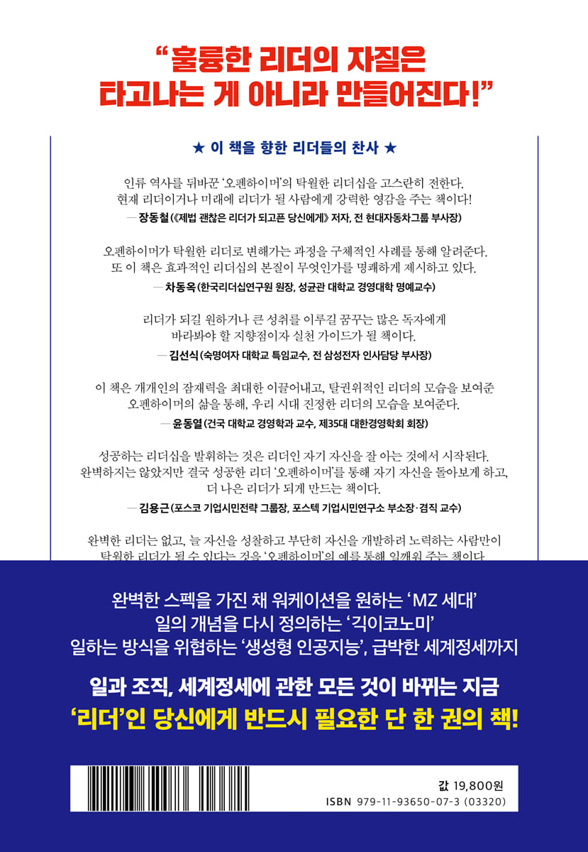 인류 역사를 뒤바꾼 ‘오펜하이머’의 탁월한 리더십을 고스란히 전한다. 현재 리더이거나 미래에 리더가 될 사람에게 강력한 영감을 주는 책이다! - 장동철 (전 현대자동차그룹 부사장, 『제법 괜찮은 리더가 되고픈 당신에게』 저자)
