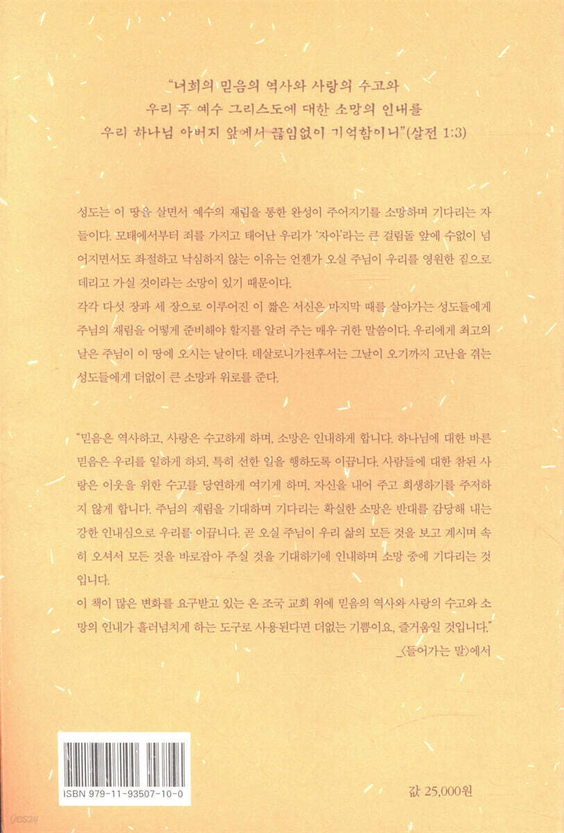 우리 주 예수 그리스도에 대한 소망의 인내를 우리 하나님 아버지 앞에서 끊임없이 기억함이니”(살전 1:3) 믿음, 사랑, 소망으로 이 땅을 살아 내야 할 모든 성도에게 전하는 메시지 모태에서부터 죄를 가지고 태어난 우리가 ‘자아’라는 큰 걸림돌 앞에 수없이 넘어지면서도 좌절하고 낙심하지 않는 이유는 언젠가 오실 주님이 우리를 영원한 집으로 데리고 가실 것이라는 소망이 있기 때문이다. 믿음, 사랑, 소망은 성도들이 그리스도를 본받는 삶을 살아갈 때 반드시 필요한 덕목인데, 특히 주님의 재림을 기대하며 기다리는 확실한 소망은 많은 핍박과 반대를 감당해 내는 강한 인내심으로 성도들을 이끈다. 각각 다섯 장과 세 장으로 이루어진 이 짧은 두 서신은 마지막 때를 살아가는 성도들이 분명한 약속을 기다리는 자처럼 믿음으로 견고하게 서서 소망을 가지고 살아갈 수 있도록 위로하는 귀한 말씀이다. 우리에게 최고의 날은 주님이 이 땅에 오시는 날이다. 데살로니가전후서 말씀은 그날이 오기까지 고난을 겪는 성도들에게 더없이 큰 소망과 위로를 줄 것이다. 이런 의미에서 이 책은 재림이나 종말에 대해서 자주 잊고 사는 것이 습관이 되어 버린 이 시대 성도들이 꼭 읽어 보아야 할 책이다. |