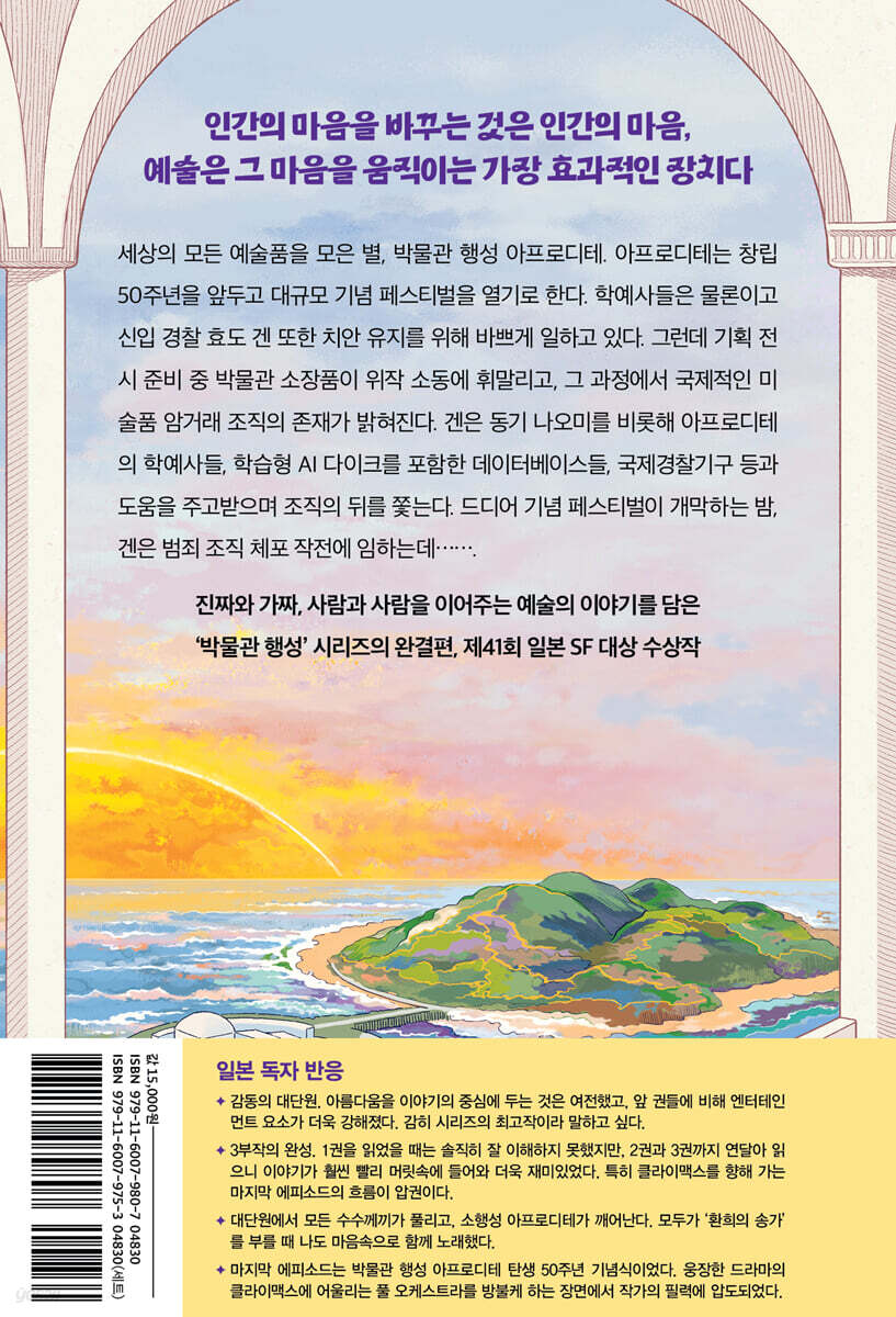 일본 SF 대표 작가 스가 히로에가 20년이 넘는 시간 동안 큰 사랑을 받으며 연재한 대표작 ‘박물관 행성’ 시리즈가 드디어 끝을 맺는다. 박물관 행성 시리즈는 시기를 알 수 없는 미래, 우주의 온갖 예술품을 수집하는 박물관 행성 아프로디테에서 직원들이 마주하는 아름다움의 실체와 사람, 그리고 사랑에 대해 이야기하는 SF 소설이다. 스가 히로에는 SF에서는 흔치 않은 소재인 ‘박물관’과 ‘아름다움’을 소재로 해 과거로 시선을 돌린다. 예술 분야에서 최첨단 과학기술이 오래된 예술품들을 복원하고 옛사람들을 이해하는 도구이기도 하다는 점에 착안해, 박물관 행성이라는 독특한 별을 배경으로 인공지능 데이터베이스를 조수로 둔 채 과거를 이해하고자 애쓰는 사람들의 이야기를 만들어낸 것이다. 『박물관 행성 3 : 환희의 송가』에서는 신입 경찰 겐이 아프로디테에서 발견된 위작 도자기 사건을 시작으로 동료들과 함께 미술품 암거래 조직을 쫓는다. 작가는 흥미로운 위작의 세계와 미술품 범죄 이야기를 쉽게 풀어내 글의 재미를 더하고, 겐과 신입 학예사 나오미, 1권의 주인공이자 이들의 상사인 다카히로의 입을 통해 저마다의 아름다움과 예술의 의미, 그리고 인간의 본질에 대해 생각할 거리를 던진다. 또한 특유의 따뜻한 필체로 사건에 얽혀 있는 사람들의 갈등을 풀고 이들의 상처를 치유해 독자에게 감동을 준다. SF 거장이 펼쳐 보이는 가슴 따뜻한 인간의 세계 『박물관 행성 3 : 환희의 송가』의 이야기를 끌어가는 겐은 신입 행성 자치 경찰로, 정동(情動) 학습형 AI 인 다이크에게 인간과 감정에 대해 가르치고 그와 함께 사건을 해결한다. 시리즈의 2권인 『보이지 않는 달』에 등장한 사건들을 함께 겪으며 많이 인간다워진 다이크는 이제 애매모호한 질문에 대한 대답은 물론이고 겐에게 위로와 농담까지 건넬 수 있게 됐다. 하지만 국제경찰기구 미술품 전담반 형사는 인간을 닮는다는 건 인간처럼 속을 수도 있다는 것이라 말하며, 기계인 이상 입력되는 데이터 자체가 잘못되면 잘못된 판단을 내릴 수도 있다는 위험을 경고한다. 이내 다이크는 해킹의 위험과 마주하고, 데이터베이스를 의지하던 겐은 스스로를 포함해 아무것도 믿을 수 없을 것만 같다고 느끼며 위기를 겪는다. 2권과 마찬가지로 독자는 예술에 문외한인 겐의 시선을 통해 위작을 만들고 파는 세상에 관한 흥미로운 이야기를 엿보게 된다. 그사이 겐도 조금은 성장해 예술가의 입장이나 마음에 대해 좀 더 잘 이해하게 됐고, 아프로디테의 경찰로서 어떻게 업무를 대해야 할지, 무엇을 우선순위에 둬야 할지에 대해 나름의 의견을 가지게 된다. 스가 히로에는 풍부한 SF의 설정을 활용하면서도 항상 인간의 상처와 빈틈을 돌아본다. 여섯 개의 사건이 연작 형식으로 이어지는 이 책에서 겐은 유전자조작 생물과 유랑 AI의 운명에 동정심을 느끼고 이들을 돕고자 하며(「벌레에게도 영혼이」, 「웃는 얼굴의 행방」), 재해로 지인들을 잃고 예술가로서의 의욕도 잃은 사진작가를 따뜻한 손길로 위로하며 어떻게 하면 그가 다시 좋은 사진을 찍을 수 있을지 고민하고(「웃는 얼굴의 사진」, 「웃는 얼굴의 행방」), 서로를 이해하지 못해 갈등이 깊어진 플랜트 헌터와 제약회사 회장의 앙금을 풀고 둘을 화해시키려 한다(「아득히 먼 꽃」). 미술품을 돈이 되는 물건이라고만 생각하는 범죄조직 일원들에게는 분노를 느끼며(「환희의 송가」) 무려 함정수사에 참여해 이들을 검거하는 작전에 참여한다. 3개월에 걸쳐 이어지는 아프로디테 창립 50주년 기념 페스티벌이 시작하는 밤, 겐은 티격태격하면서도 서로를 걱정하고 돕는 사이가 된 동기 나오미와 함께 오프닝 이벤트를 지켜본다. 환희의 송가가 울려 퍼지는 광장에서, 겐은 다이크와 함께 아름다운 삶의 방식을 고수하는 사람들이 있는 아름다운 이곳을 계속 지키고 싶다며 아프로디테의 경찰로서 다짐을 새로이 한다. 일본 독자 반응(독서미터, 일본 아마존) _감동의 대단원. 아름다움을 이야기의 중심에 두는 것은 여전했고, 앞 권들에 비해 엔터테인먼트 요소가 더욱 강해졌다. 감히 시리즈의 최고작이라 말하고 싶다. _3부작의 완성. 1권을 읽었을 때는 솔직히 잘 이해하지 못했지만, 2권과 3권까지 연달아 읽으니 이야기가 훨씬 빨리 머릿속에 들어와 더욱 재미있었다. 특히 클라이맥스를 향해 가는 마지막 에피소드의 흐름이 압권이다. _대단원에서 모든 수수께끼가 풀리고, 소행성 아프로디테가 깨어난다. 모두가 ‘환희의 송가’를 부를 때 나도 마음속으로 함께 노래했다. _마지막 에피소드는 박물관 행성 아프로디테 탄생 50주년 기념식이었다. 웅장한 드라마의 클라이맥스에 어울리는 풀 오케스트라를 방불케 하는 장면에서 작가의 필력에 압도되었다. |